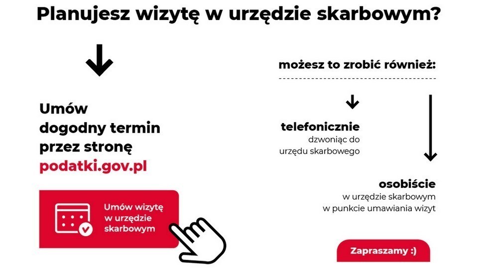 Większość spraw dotyczących obsługi skarbowej można z powodzeniem załatwić za pośrednictwem stron: podatki.gov.pl i biznes.gov.pl. Pracownicy administracji skarbowej zachęcają do umawiania spotkań osobistych tylko w przypadkach niezbędnych, co jest związane z funkcjonowaniem w realiach zagrożenia epidemicznego. Korzystanie z nowego modelu obsługi stanowi element przeciwdziałania zagrożeniu rozprzestrzeniania się patogenu, eliminując konieczność oczekiwania w kolejkach, a więc w skupiskach sprzyjających transmisji wirusa.