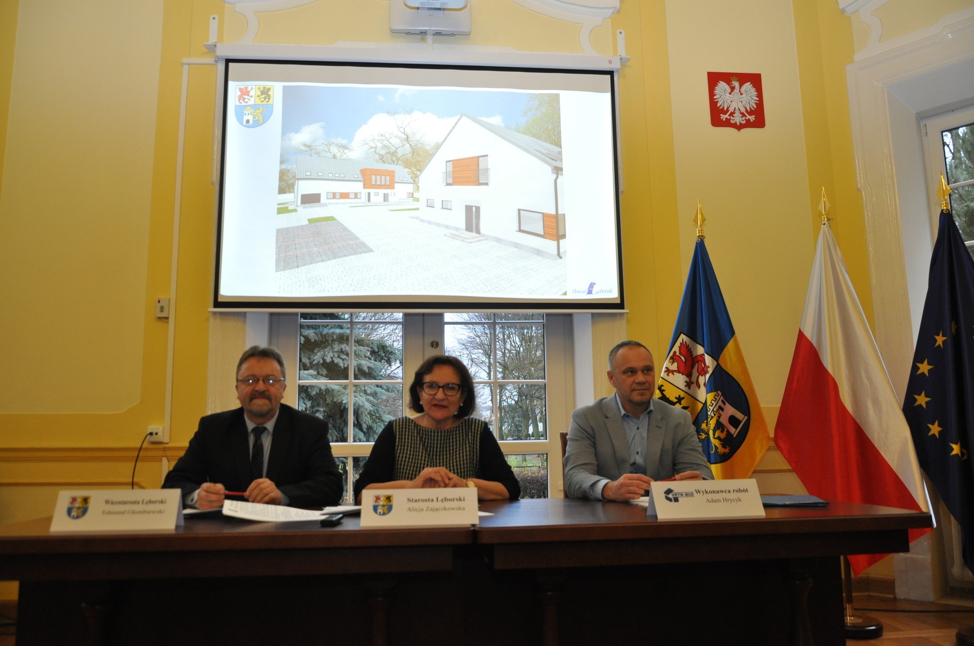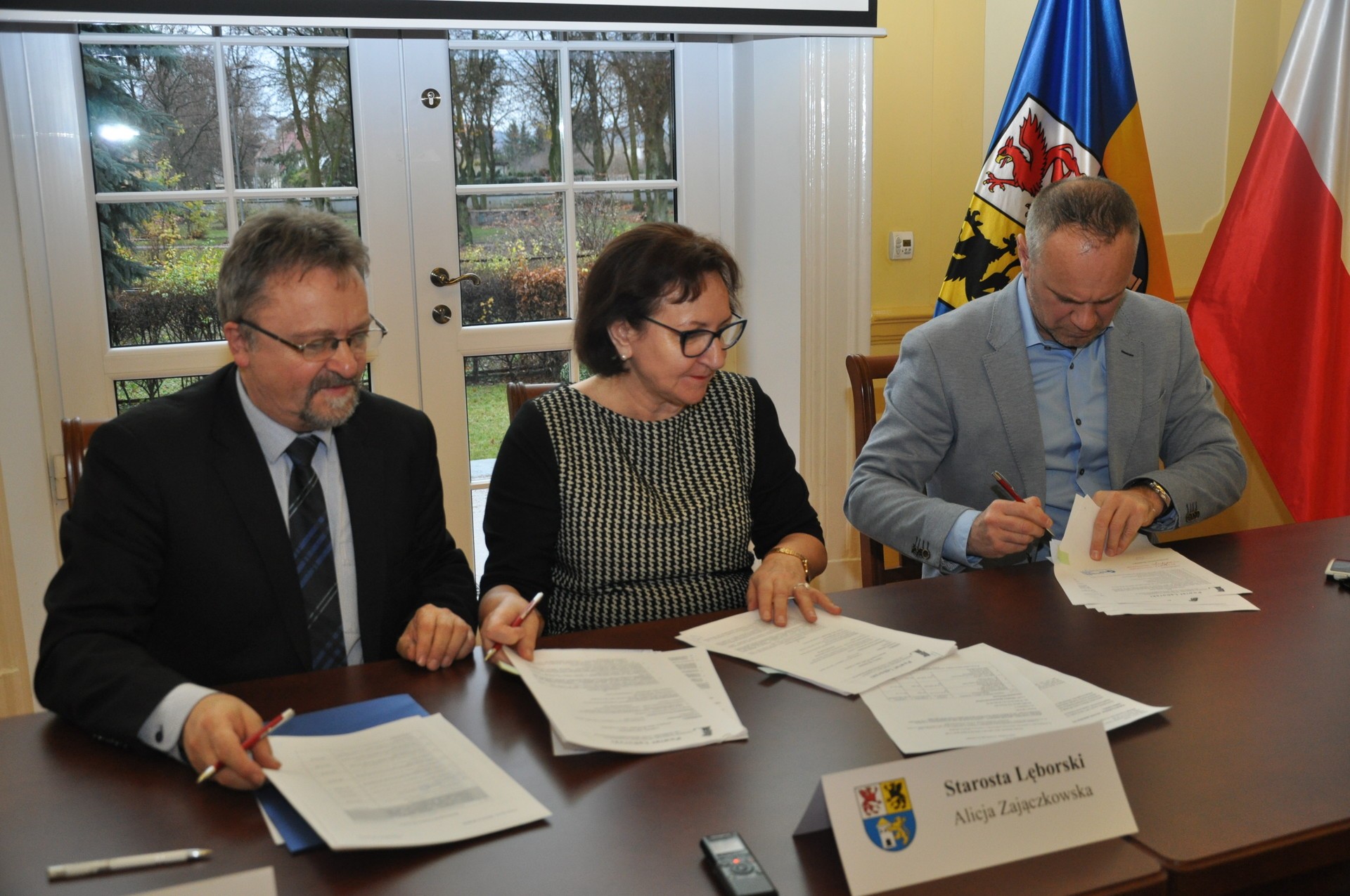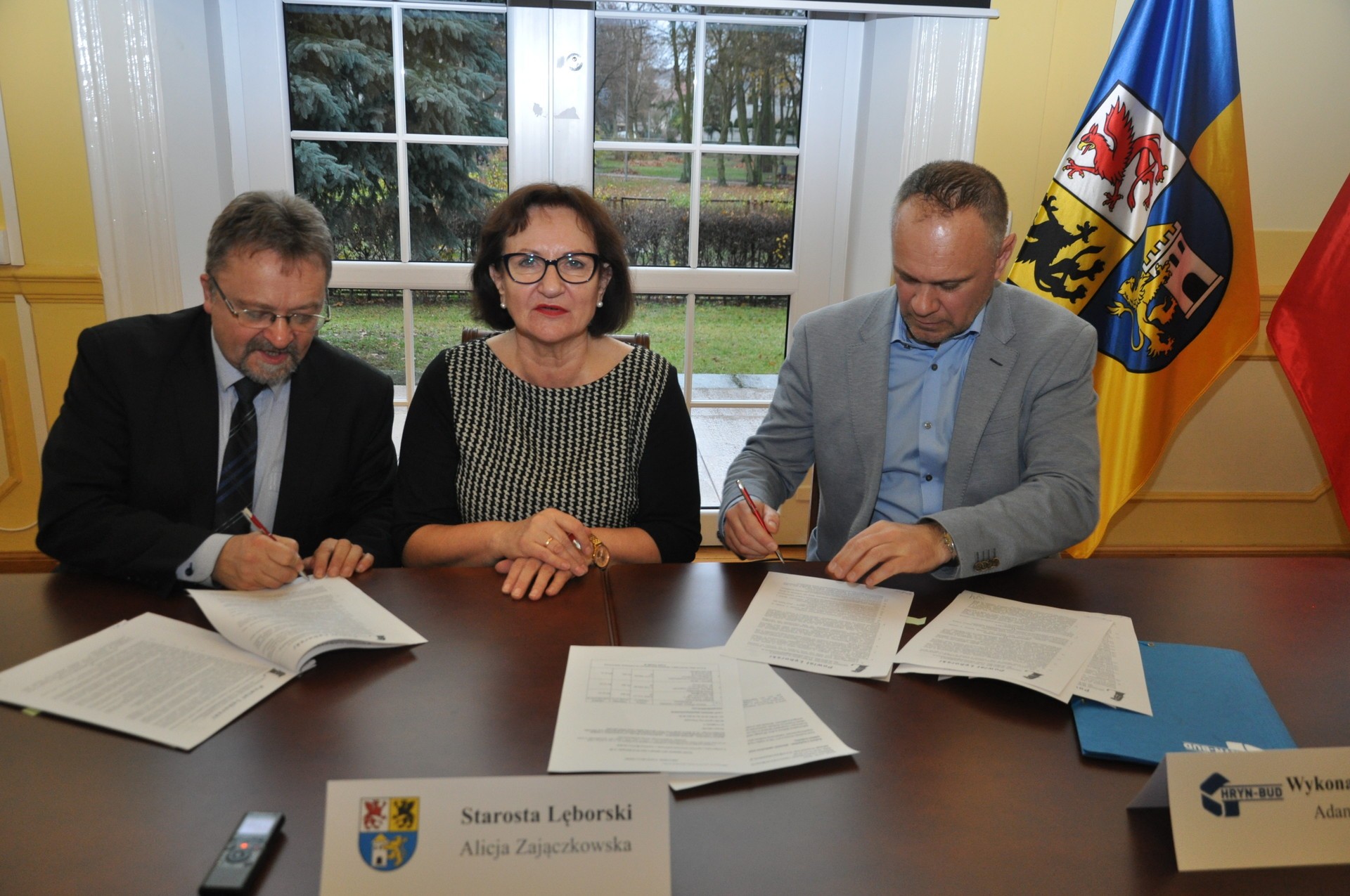 W sali obrad Rady Powiatu Lęborskiego odbyło się uroczyste podpisanie umowy na wykonanie inwestycji. Sygnowali je: Alicja Zajączkowska – Starosta Lęborski, Edmund Głombiewski – Wicestarosta Lęborski oraz Adam Hrycyk, właściciel firmy budowlanej HRYN-BUD.