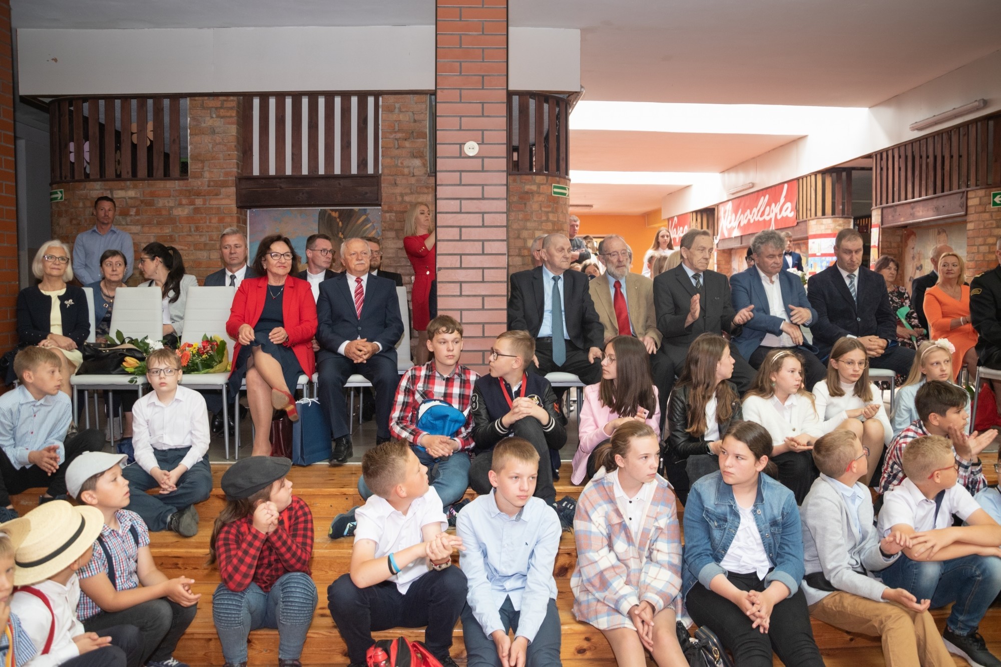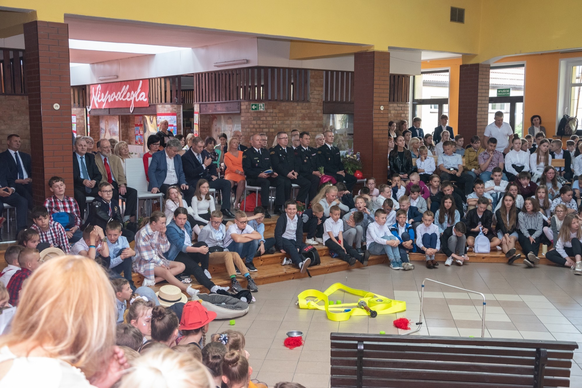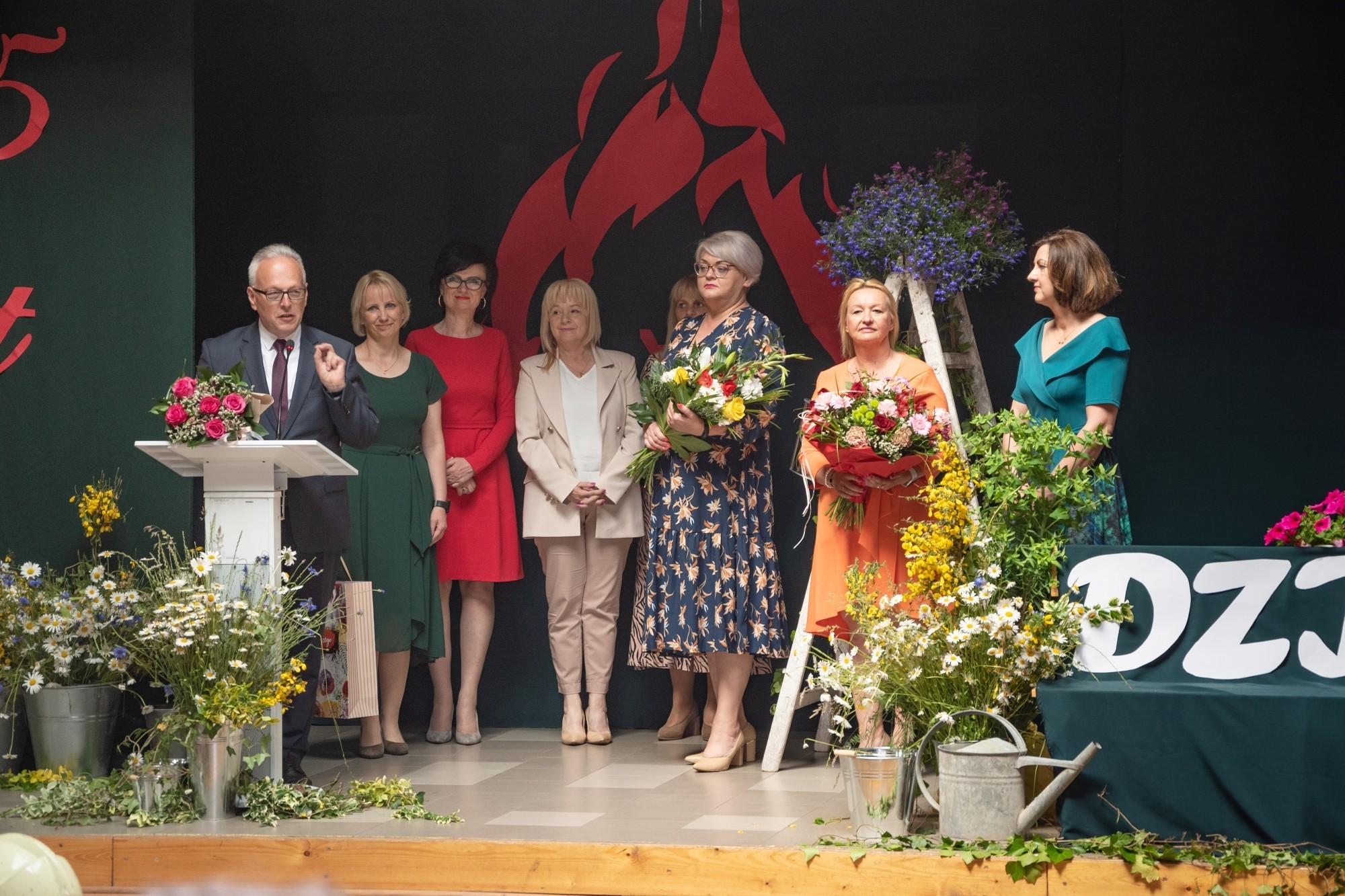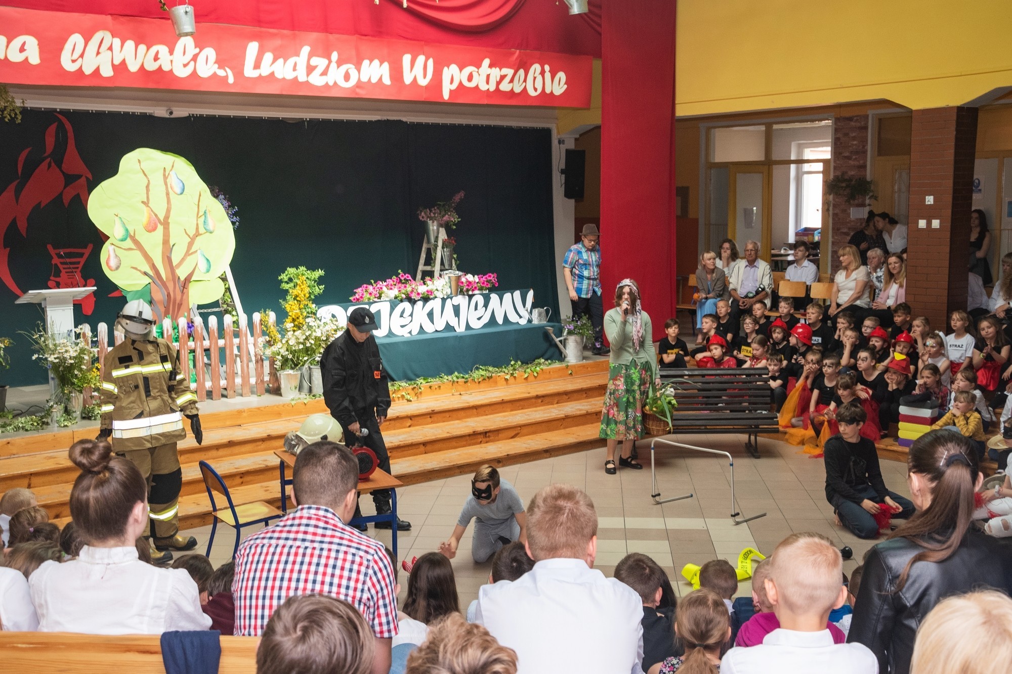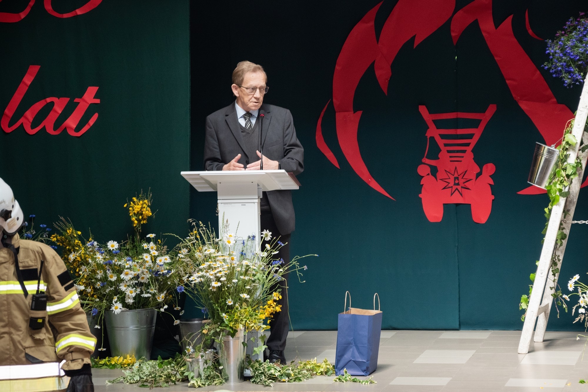 W imieniu Pomorskiego Kuratora Oświaty, życzenia społeczności szkolnej przekazał Romuald Bieniasz-Krzywiec, dyrektor Delegatury w Słupsku. Gratulacje obecnych i życzenia przyszłych sukcesów na ręce dyrektor szkoły złożyła Alicja Zajączkowska – Starosta Lęborski, która w uroczystości uczestniczyła wspólnie z wiceprzewodniczącym Rady Powiatu Lęborskiego, Marianem Borkiem, wieloletnim wójtem Gminy Nowa Wieś Lęborska. Nie zabrakło życzeń i gratulacji od obecnych władz Nowej Wsi: wójta Zdzisława Chojnackiego i przewodniczącego Rady Gminy NWL – Zdzisława Kordy. Dokonania placówki docenili również przedstawiciele patrona. Były życzenia od Komendanta Wojewódzkiego Państwowej Straży Pożarnej i Komendanta Powiatowego PSP. Z obecnością przedstawicieli patrona doskonale korespondował program artystyczny przygotowany przez młodzież szkolną, ukazujące różne apekty strażackiej służby i wartości ujęte w haśle towarzyszącym uroczystości: „Bogu na chwałę, ludziom w potrzebie”. Jak przystało na uroczystość w placówce pod patronatem straży, na dziedzińcu przed szkołą zorganizowana została wystawa sprzętu strażackiego. Każdy chętny mógł zasiąść za kierownicą wozu bojowego i zobaczyć z bliska wyposażenie i sprzęt straży pożarnej.