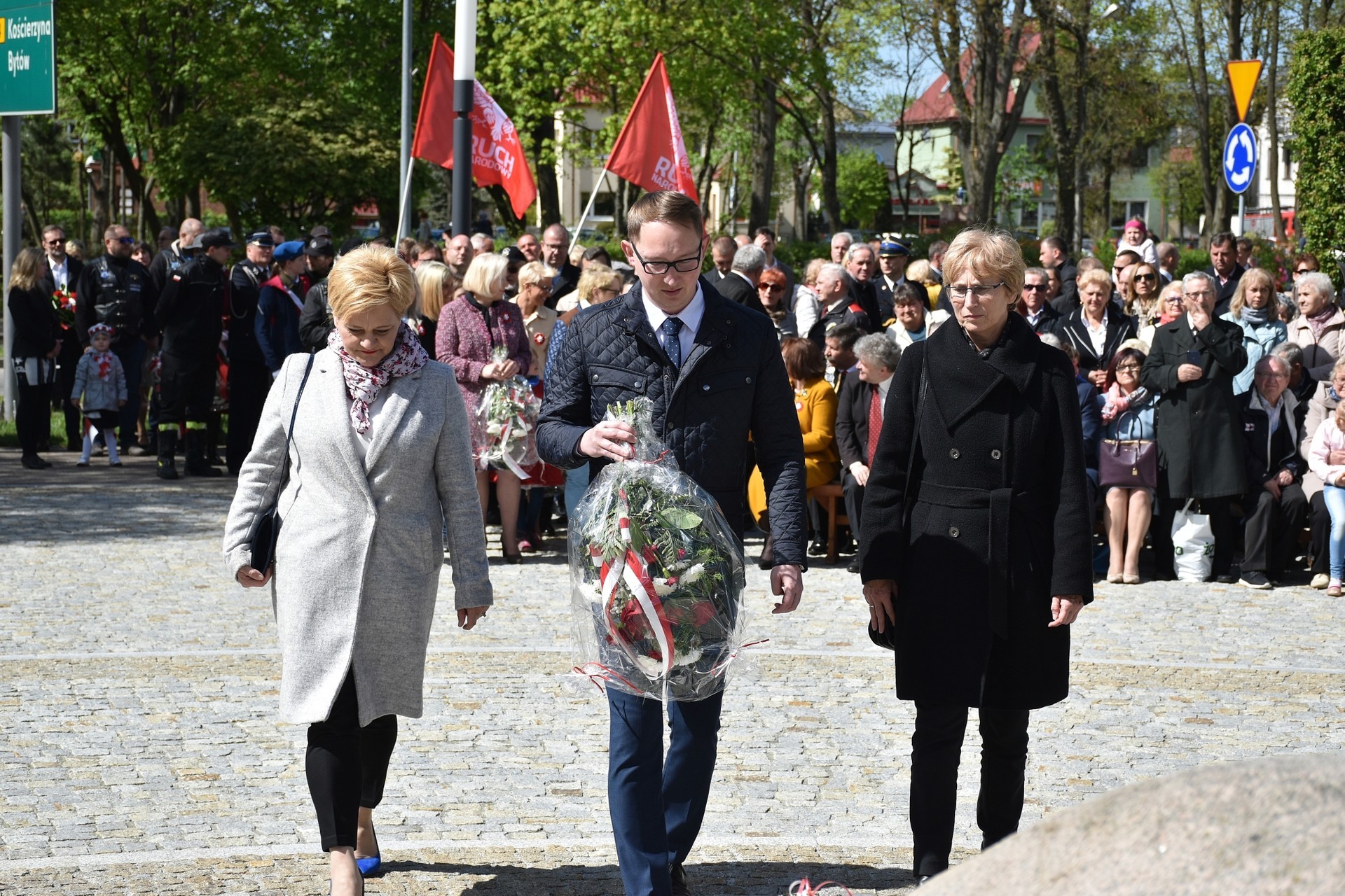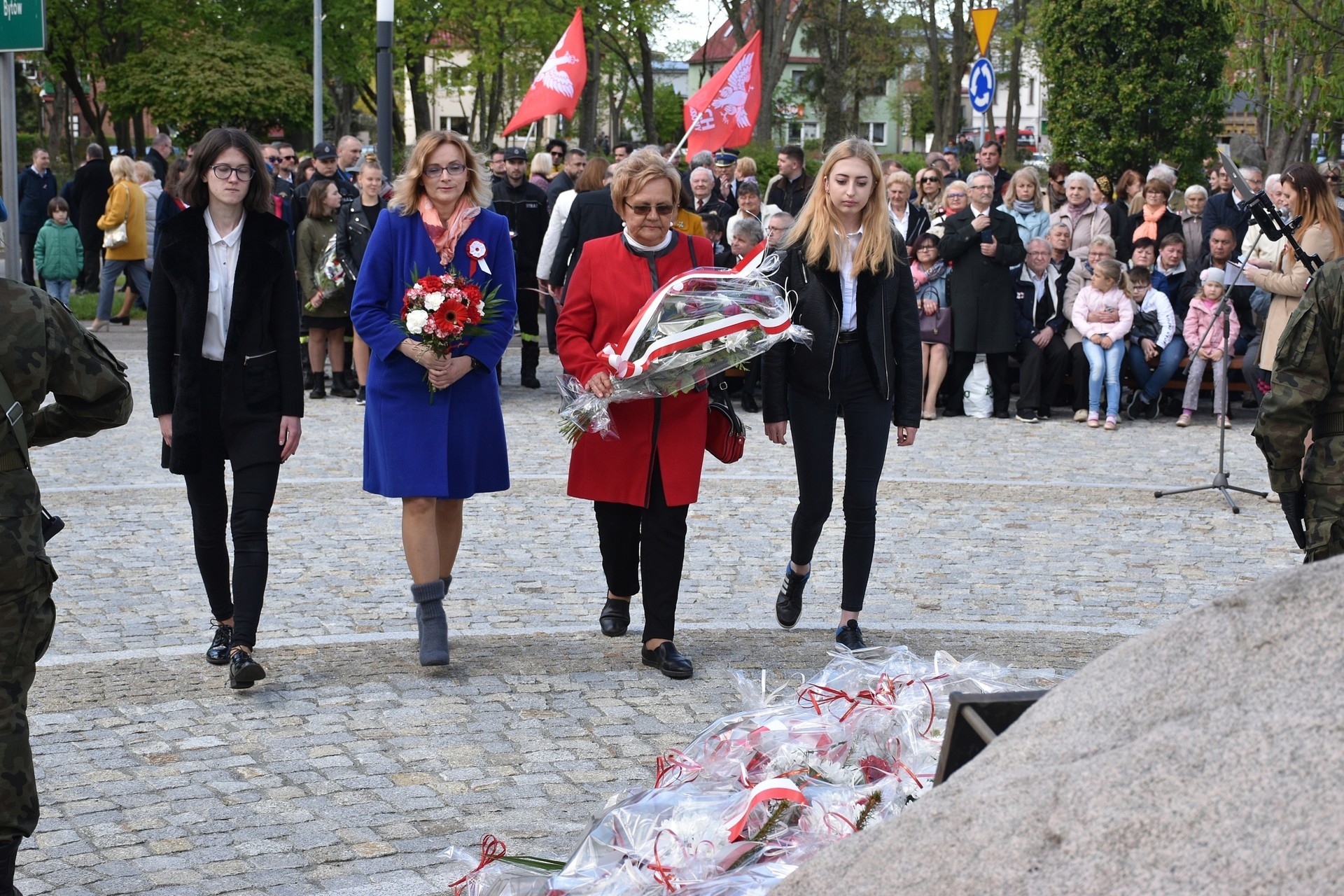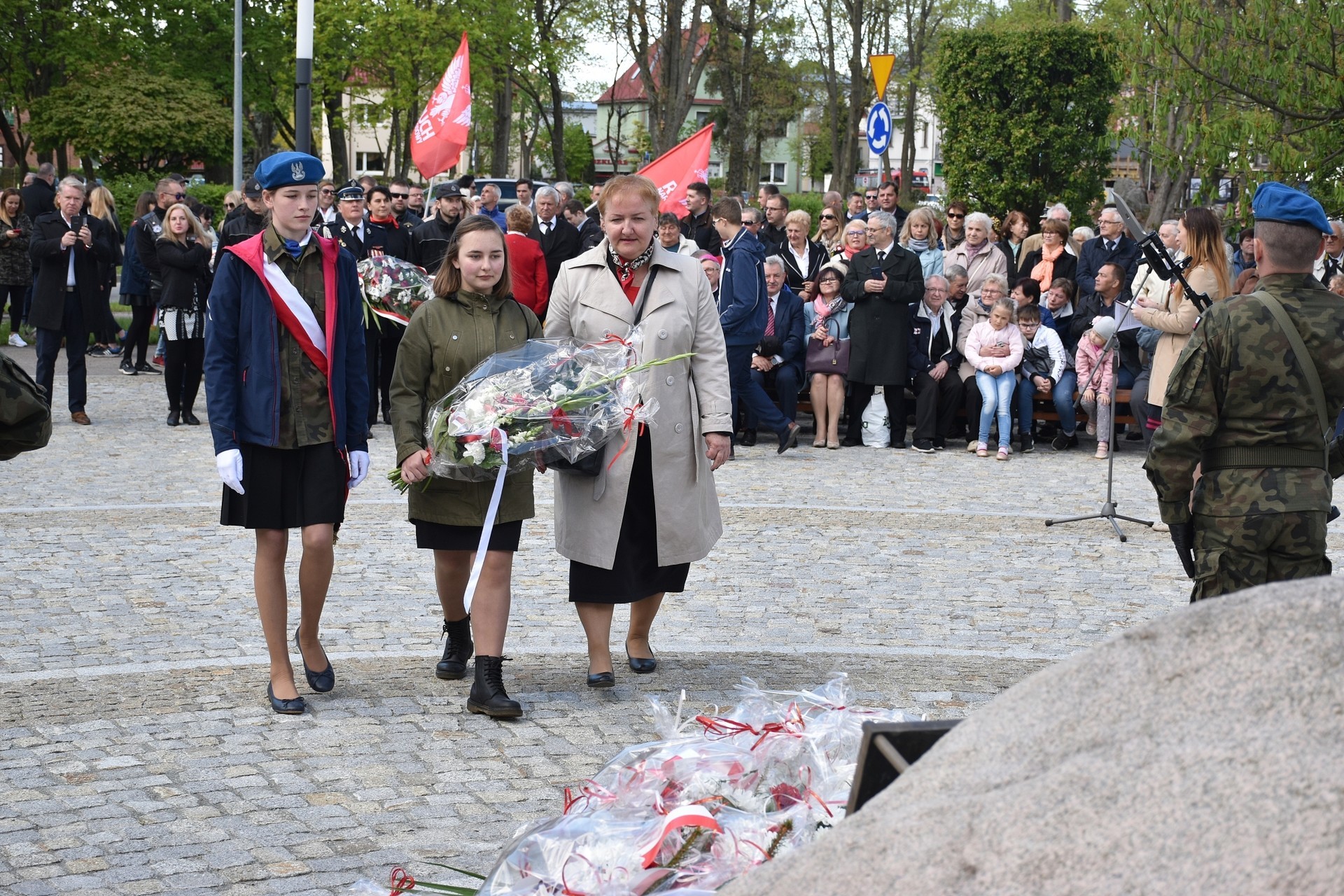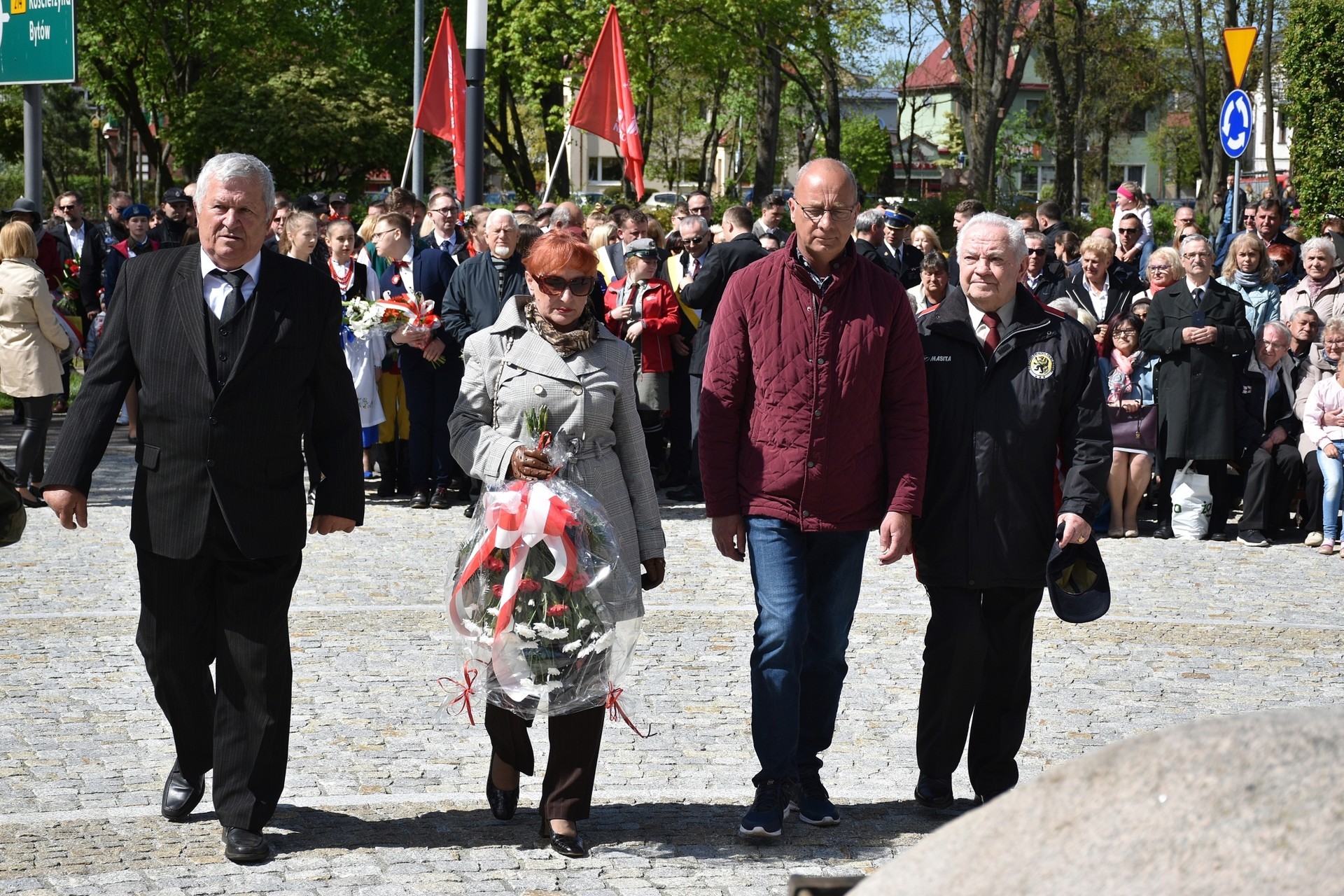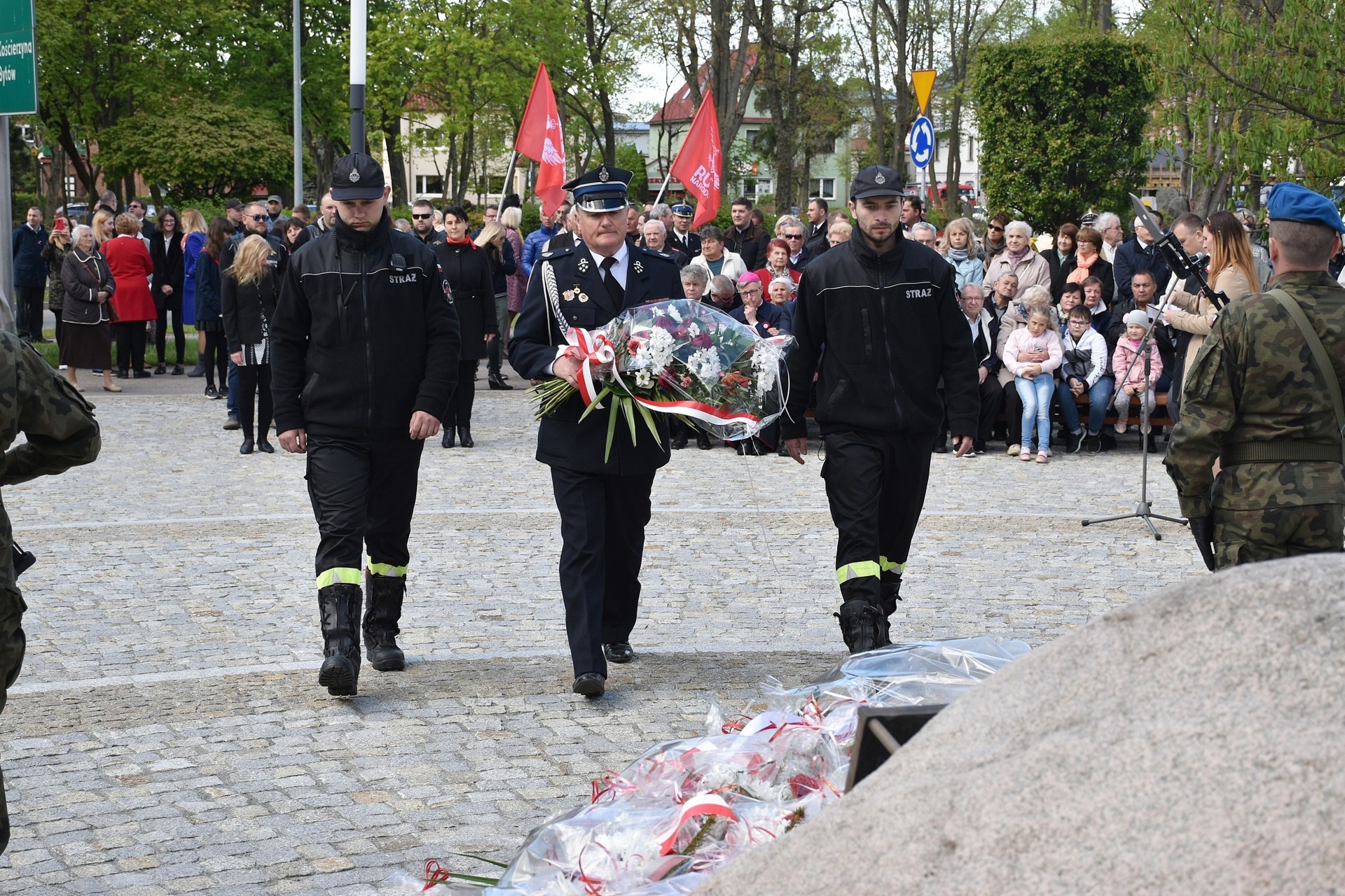 Wiązanki kwiatów złożyli: Senator RP Kazimierz Kleina, władze samorządowe powiatu z Alicją Zajączkowską, Starostą Lęborskim, miasta z burmistrzem Witoldem Namyślakiem oraz radnymi Sejmiku Województwa Pomorskiego: Iwoną Mielewczyk i Mirosławą Kaczyńską, przedstawiciele samorządów miasta i powiatu, organizacji społecznych, politycznych i kombatanckich.