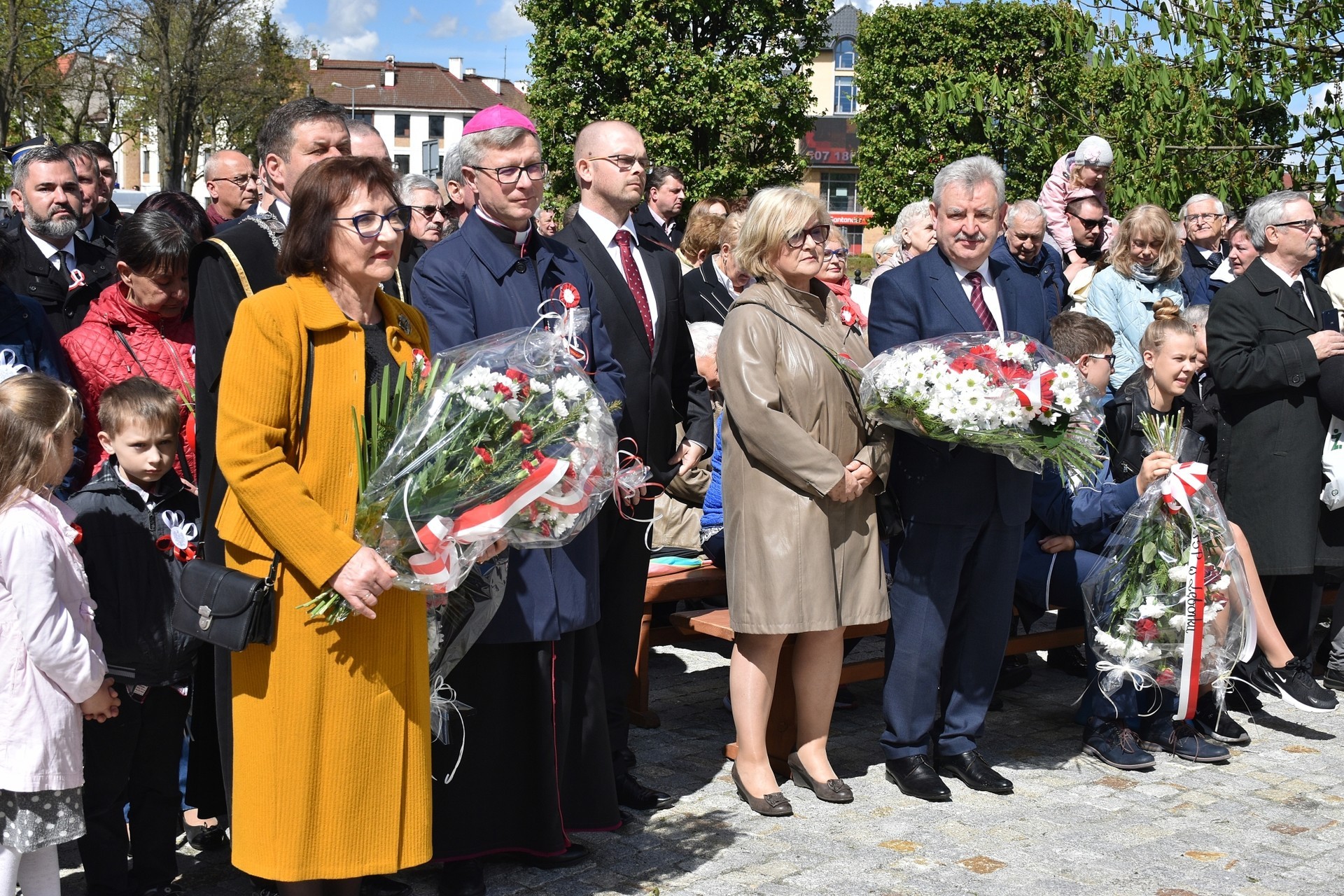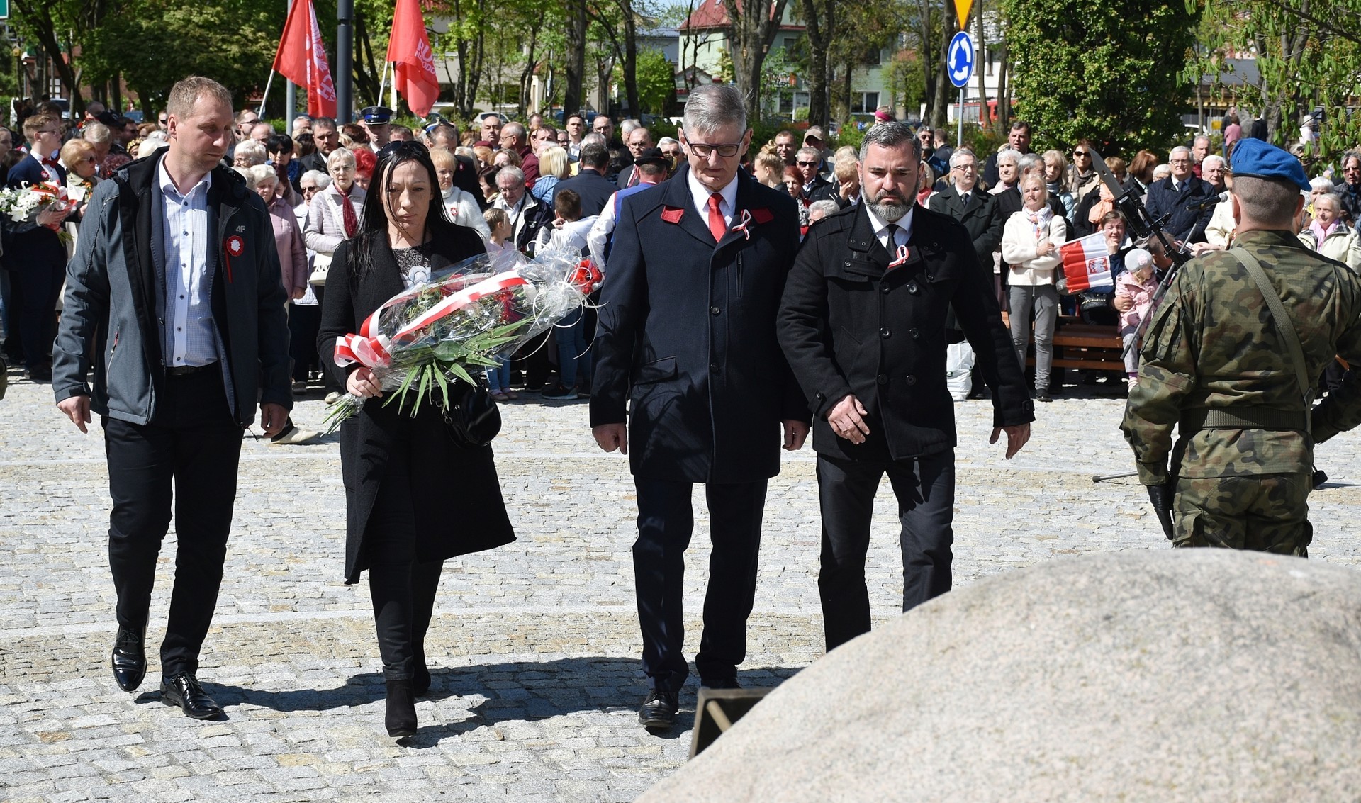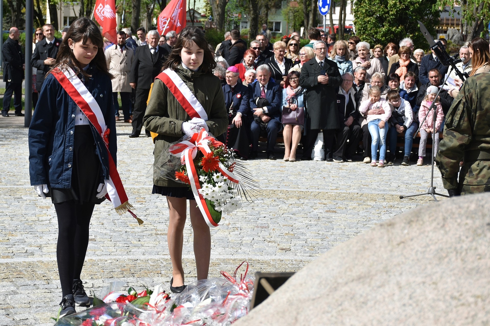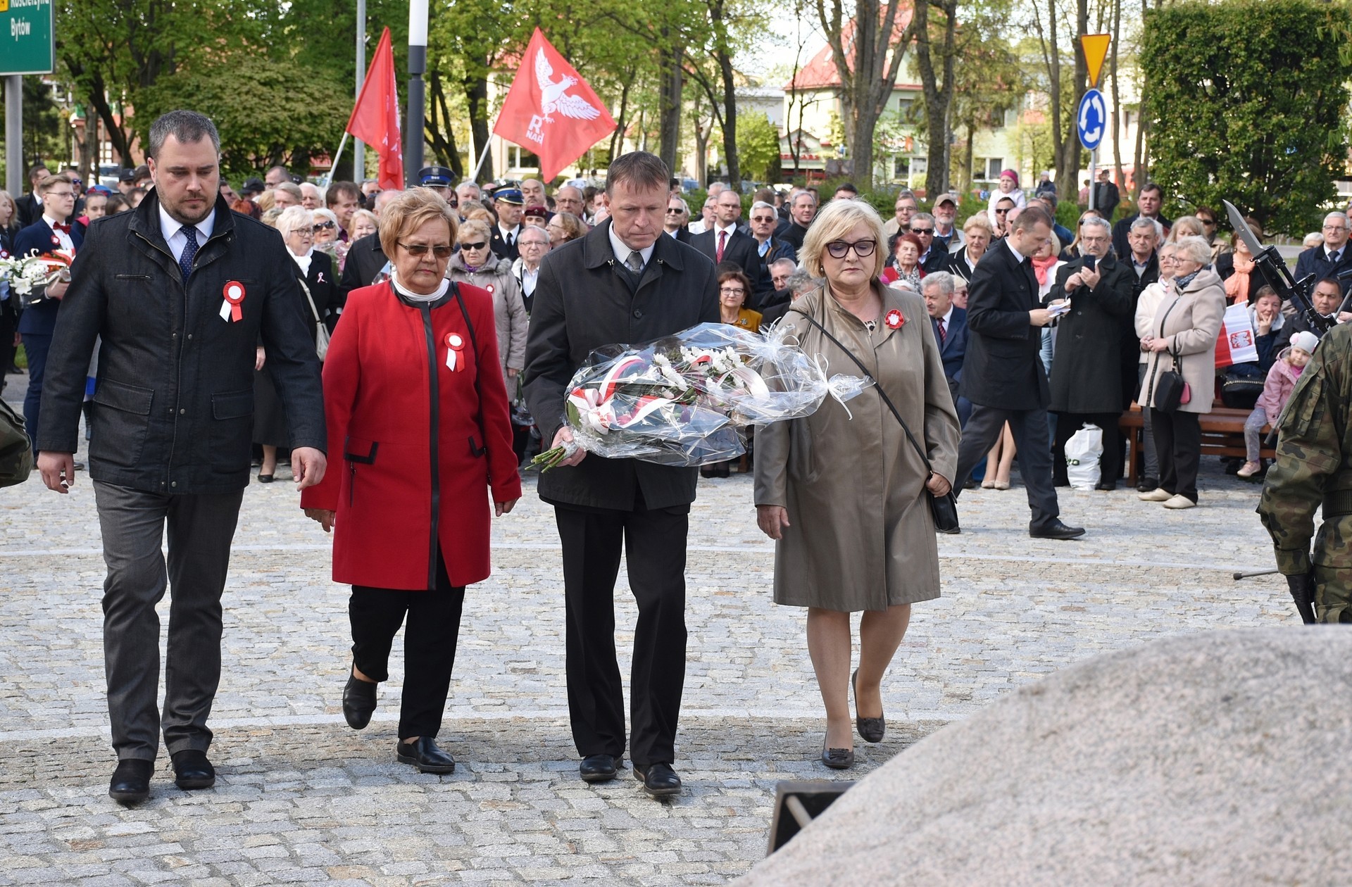 Wiązanki kwiatów złożyli: Senator RP Kazimierz Kleina, władze samorządowe powiatu z Alicją Zajączkowską, Starostą Lęborskim, miasta z burmistrzem Witoldem Namyślakiem oraz radnymi Sejmiku Województwa Pomorskiego: Iwoną Mielewczyk i Mirosławą Kaczyńską, przedstawiciele samorządów miasta i powiatu, organizacji społecznych, politycznych i kombatanckich.