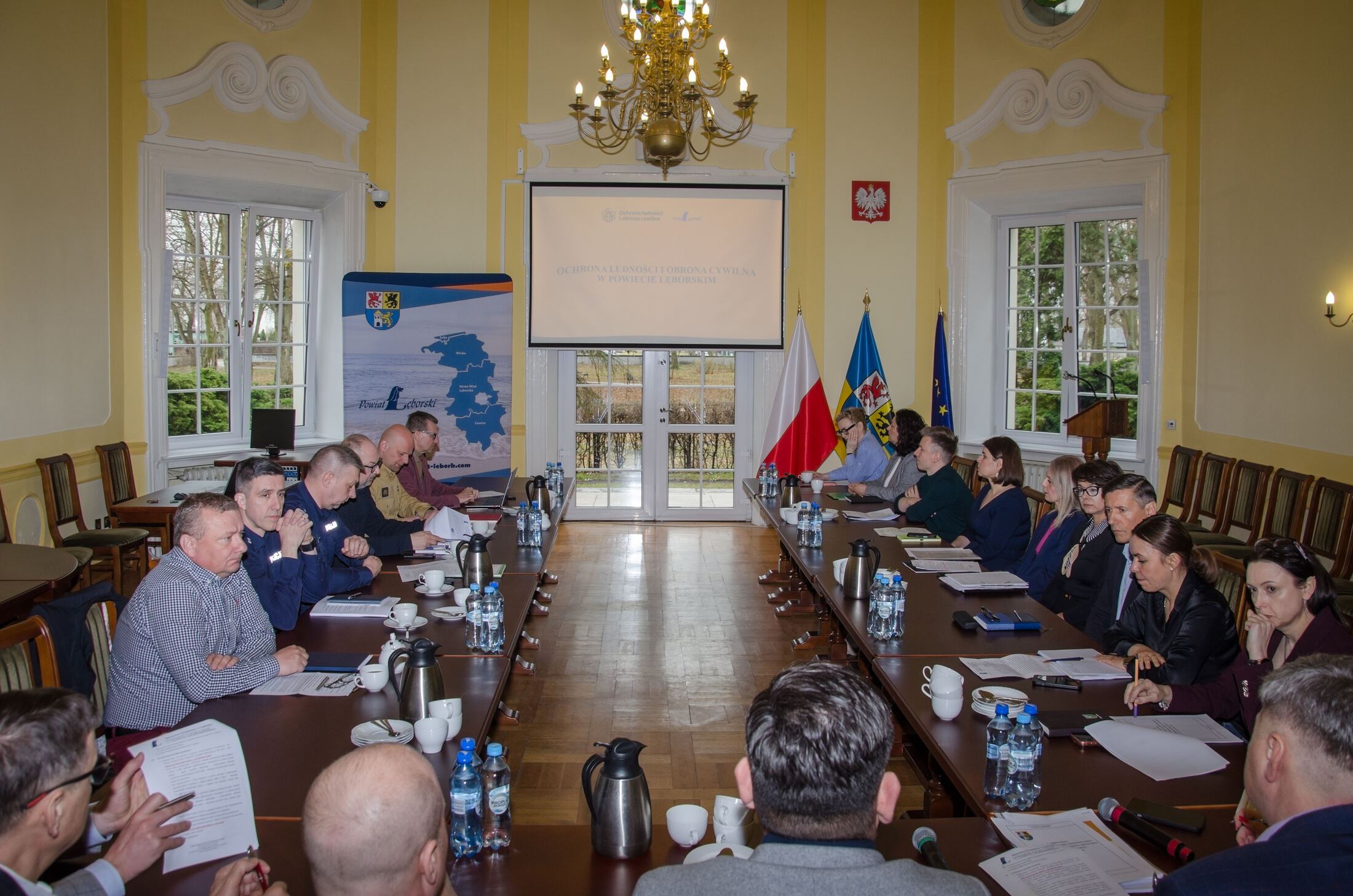 Obrady prowadził Starosta Lęborski Tomasz Litwin. Władze Powiatu reprezentowali również wicestarosta Adrian Wenta, przewodniczący Rady Powiatu Mirosław Tandek, radny Adam Dominiecki oraz Kierownik Referatu Bezpieczeństwa i Zarządzania Kryzysowego Cezary Kossewski.