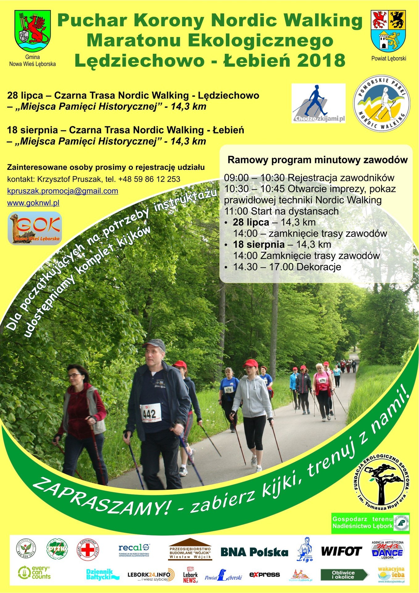 Najdłuższa z tras koloru czarnego mająca 14,3 km przeznaczona jest zdecydowanie dla doborowych piechurów. Gospodarzem kolejnej Edycji Pucharu Korony Maratonu Ekologicznego w Nordic Walking jest Sołtys Krystyna Nowatkowska. Lędziechowo, „Kijowa Atrakcja”(perkusja drewniana, cymbały drewniane i flet akustyczny to wizytówka pięknego programu), z gościnną Panią Sołtys Krystyną. Wyjdziemy tym razem ze Stanicy Turystycznej Lędziechowo. Po dotarciu do granicy lasu przy starej, pomnikowej lipie skręcimy w lewo, by po przejściu 2,5 km dojść do cmentarza, pomnika ofiar Marszu Śmierci więźniów z obozu KL Stutthof. Po chwili zadumy, w przemyślny sposób przez trudny odcinek parku przy cmentarzu przeprowadzi nas OSP Krępa Kaszubska. Pójdziemy pięknym lasem parkowym oglądając zrelaksowane czerwone bydło i dojdziemy do Stanicy Turystycznej Krępa Kaszubska, w której przywita nas dwanaście gościnnych Pań z Koła Gospodyń Wiejskich. Zostawiając za sobą miejscowość przejdziemy obok stadniny koni Koniczynka, gdzie tuż za zakrętem cała rodzina Państwa Strupińskich z córkami biegaczkami ponownie napoi spragnioną grupę chodziarzy. Następnie żwirową, a później piaszczystą drogą dotrzemy do asfaltu gdzie organizatorzy z OSP Obliwice bezpiecznie przeprowadzą Nas po tym odcinku. Na 6,4 km przy obelisku Jana Pawła II połączymy się z czerwonym szlakiem. Przechodzimy obok ścieżki prowadzącej do trzech czterystuletnich dębów. W Stanicy Turystycznej Obliwice czekała na nas orzeźwiająca woda podawana przez Panią Teresę. Zostawiając za sobą Obliwice, na szlaku skręcimy w prawo do lasu obok obelisku Ścieżka Przyrodnicza Obliwice (zachęcamy do obejrzenia pięknego Lapidarium i odwróconego okrętu z galerią największych szachów na Pomorzu). Idąc duktem leśnym miniemy po drodze stawy dochodząc do asfaltu w miejscowości Łebień, którą to media nazwały polskim eldorado gazu łupkowego, ze względu na duże pokłady tegoż gazu. W Stanicy Turystycznej Łebień pani Ela poczęstuje Nas nie tylko wodą ale także przesmacznym ciastem własnego wypieku. Powędrujmy dalej bitą drogą, miniemy pojedyncze zabudowania oraz pasące się stado kóz i dojdziemy do Mety w miejscu rekreacyjnym w Lędziechowie, gdzie przy punkcie pomiaru tętna można wykonać indywidualny pomiar wg załączonej tabeli. W terenie spotkamy około 30 pomników przyrody co pozwoli marsz Nordic Walking połączyć z pozytywnymi doznaniami rekreacyjno – krajoznawczymi.