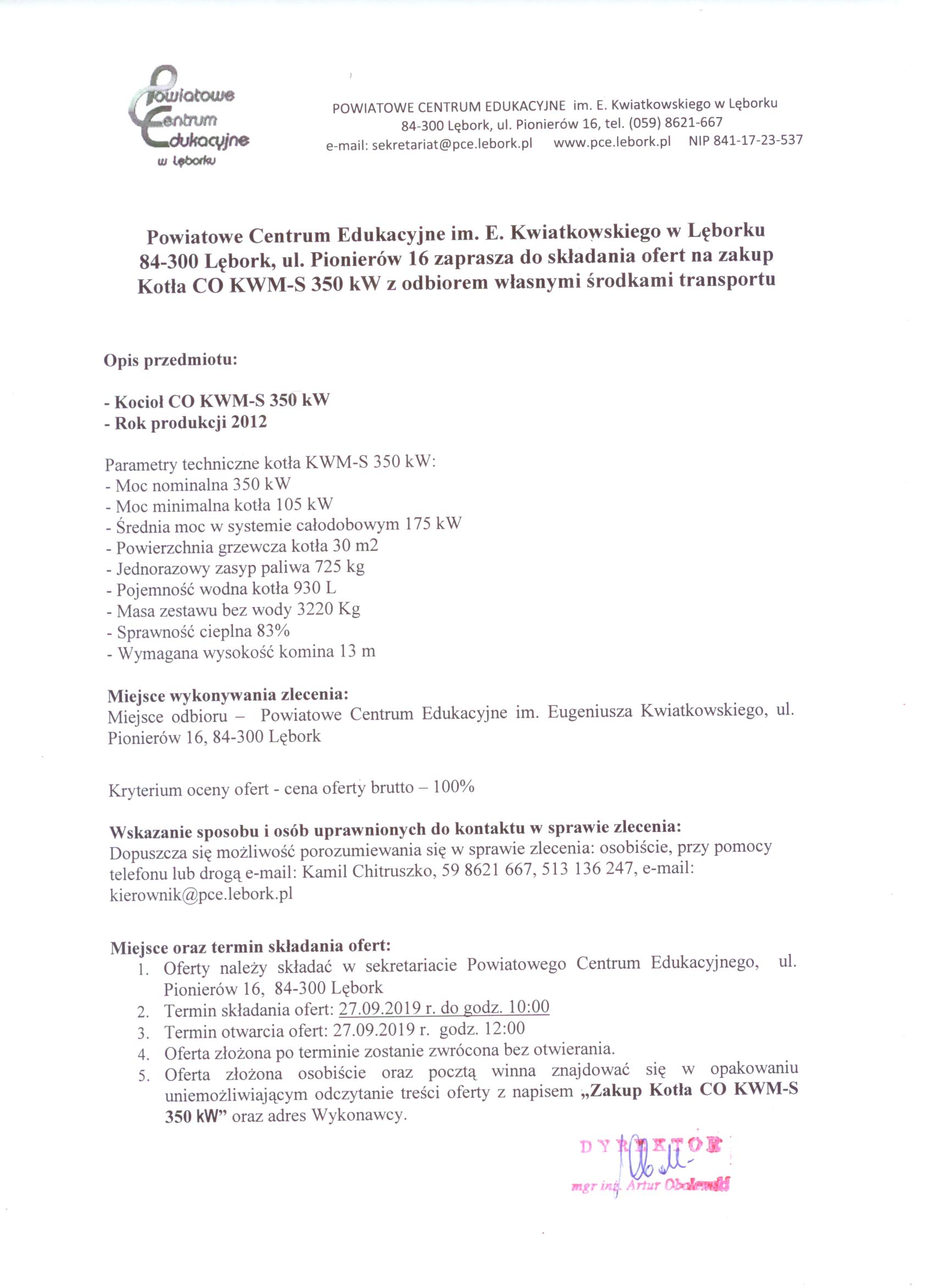 Powiatowe Centrum Edukacyjne im. E. Kwiatkowskiego w Lęborku 84-300 Lębork, ul. Pionierów 16 zaprasza do składania ofert na zakup Kotła CO KWM-S 350 kW z odbiorem własnymi środkami transportu.