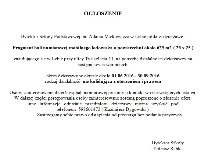 Dyrektor Szkoły Podstawowej im. Adama Mickiewicza w Łebie odda w dzierżawę :Fragment hali namiotowej mobilnego lodowiska o powierzchni około 625 m2 ( 25 x 25 ) znajdującego się w Łebie przy ulicy Tysiąclecia 11, na potrzebę działalności dzierżawcy na następujących warunkach: