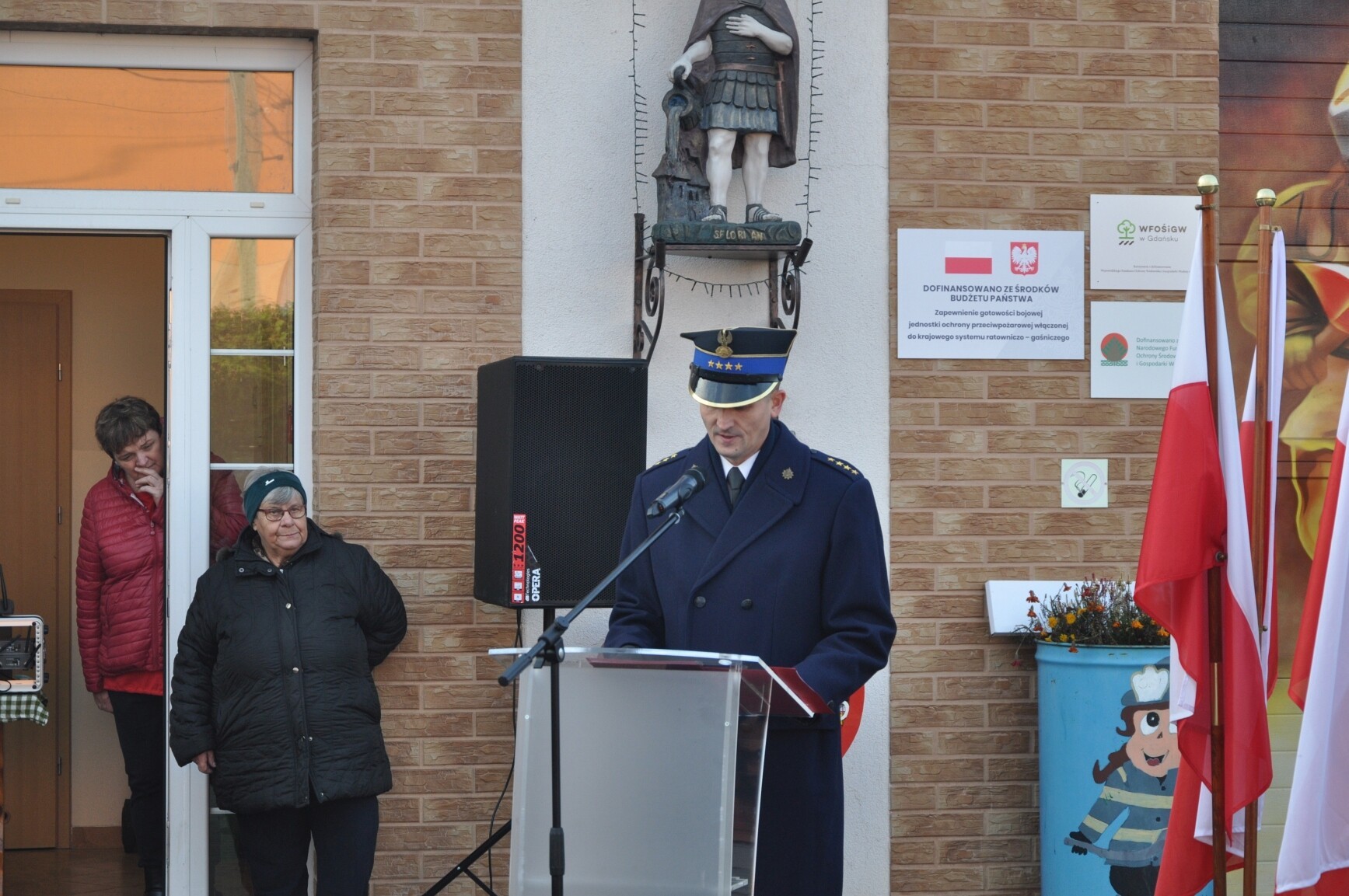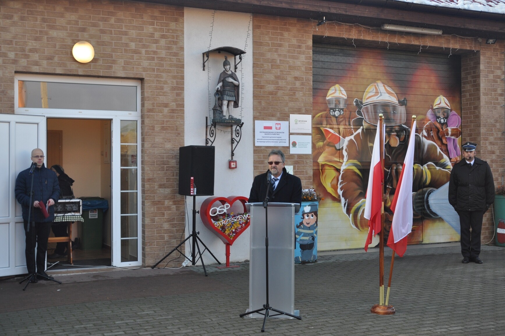 Wśród gości strażaków – ochotników tego dnia obecni byli: Edmund Głombiewski – Wicestarosta Lęborski, Mirosław Tandek – przewodniczący Rady Powiatu Lęborskiego, st. kpt. Dawid Główczewski – zastępca komendanta Powiatowego Państwowej Straży Pożarnej w Lęborku, Marcin Brodalski – kierownik Biura Poselskiego posła Piotra Müllera, Roman Downar-Zapolski - Prezes Zarządu Oddziału Powiatowego Związku OSP w Lęborku, Agnieszka Wolańska – zastępca wójta Gminy Wicko, a jednocześnie Prezes Zarządu Oddziału Gminnego Związku OSP w Wicku, Ryszard Pacek – Komendant Gminny OSP w Wicku, a także przedstawiciele gminnych jednostek OSP, radni i sołtysi. Samorząd Gminy Wicko reprezentowali: wójt Dariusz Waleśkiewicz i przewodniczący Rady Gminy Jacek Stanuch. Poświęcenia nowego wozu bojowego dokonał ks. Alojzy Kowalewski – proboszcz Parafii pw. św. Józefa Oblubieńca Najświętszej Marii Panny. Oficjalnym wystąpieniom i strażackiemu ceremoniałowi towarzyszyły życzenia samych szczęśliwych powrotów z akcji.