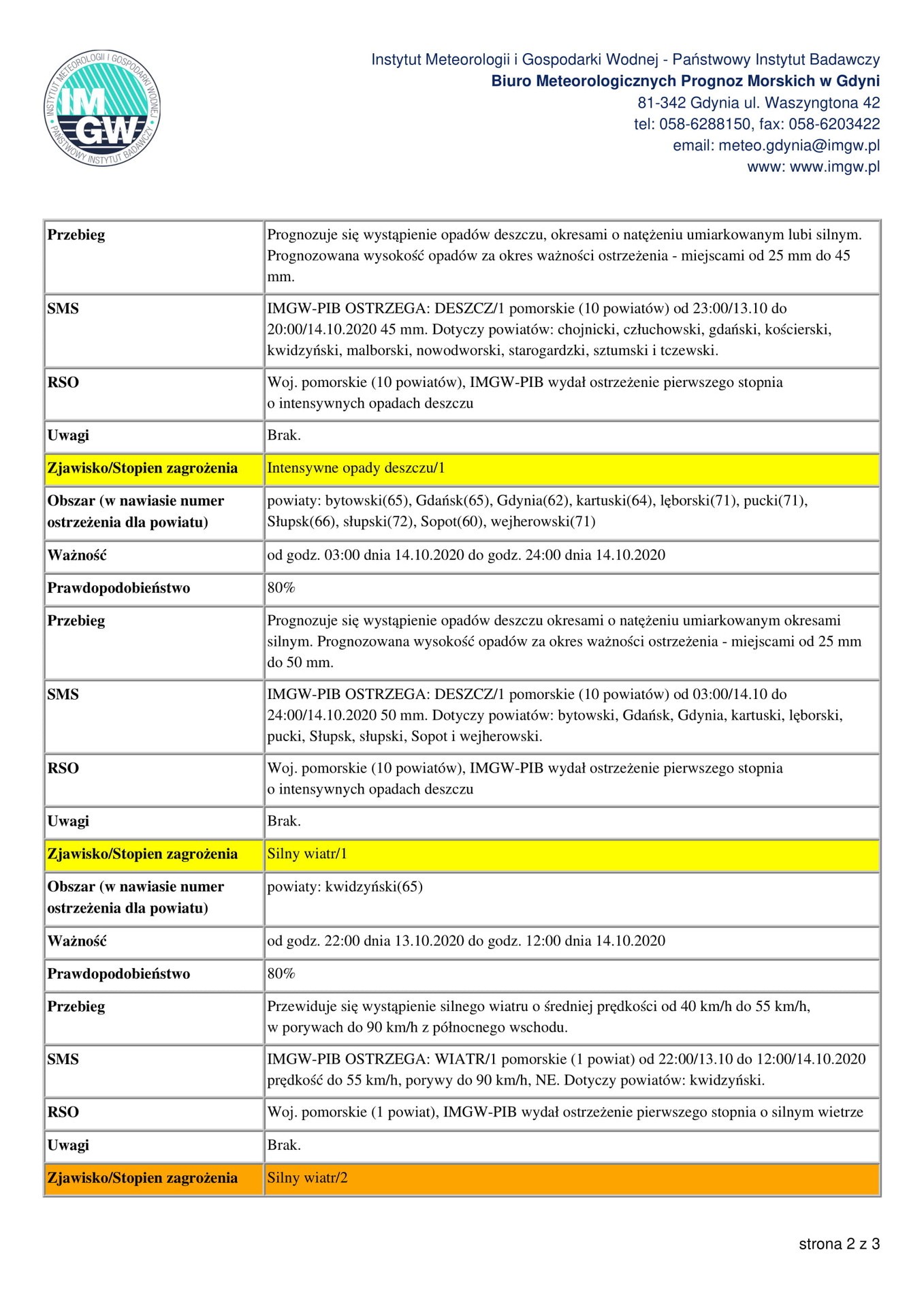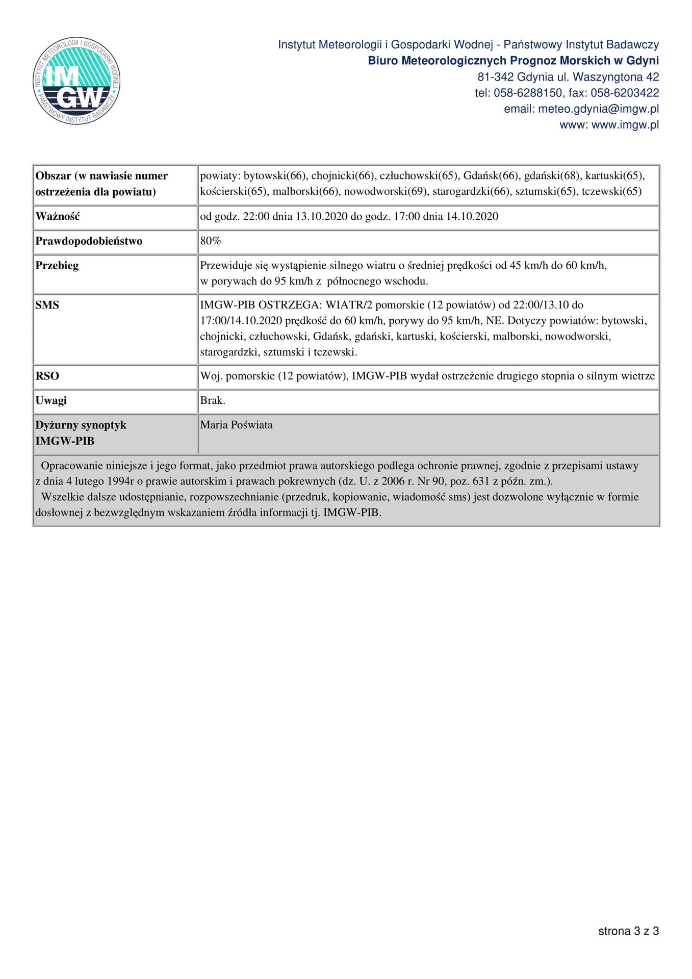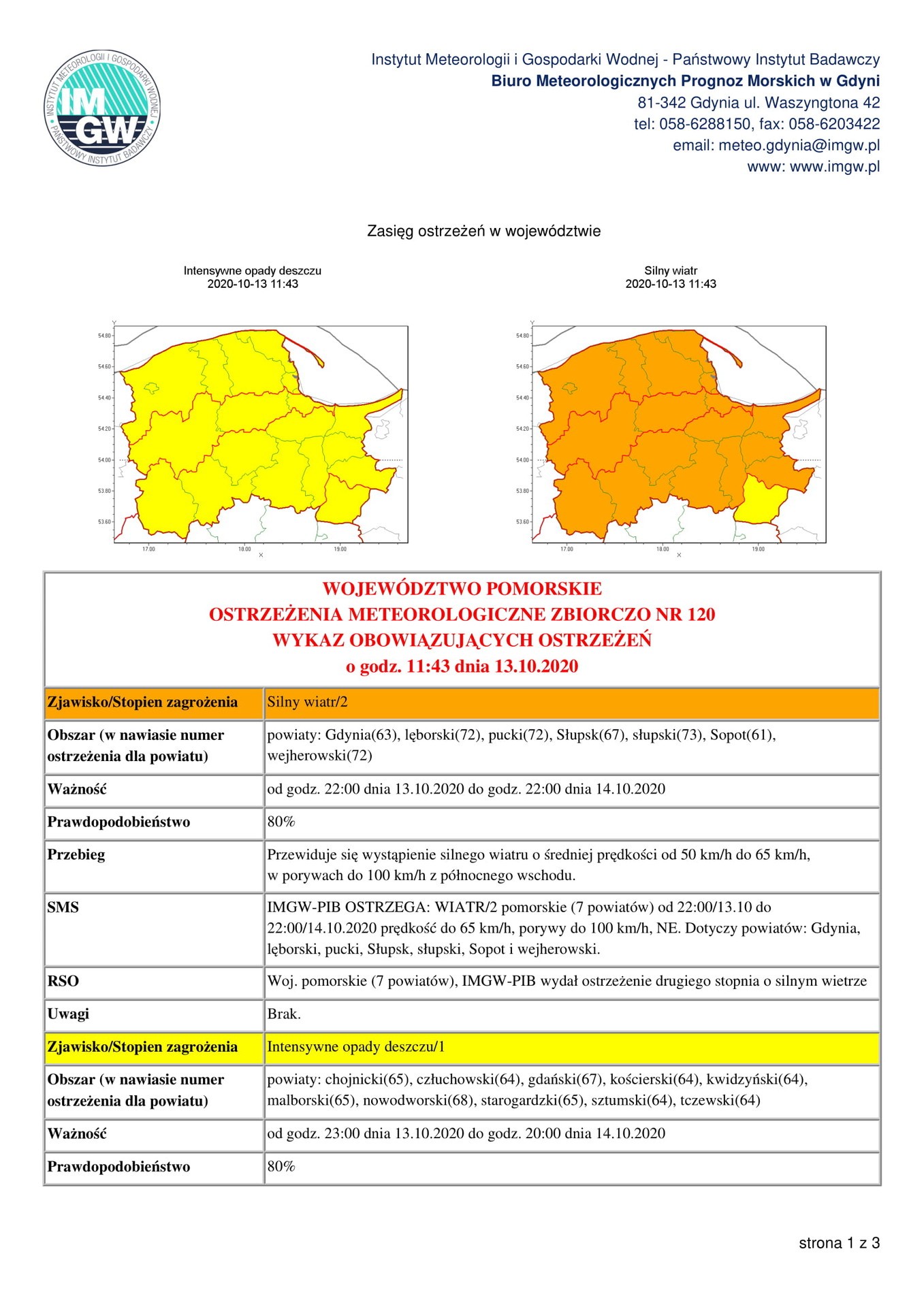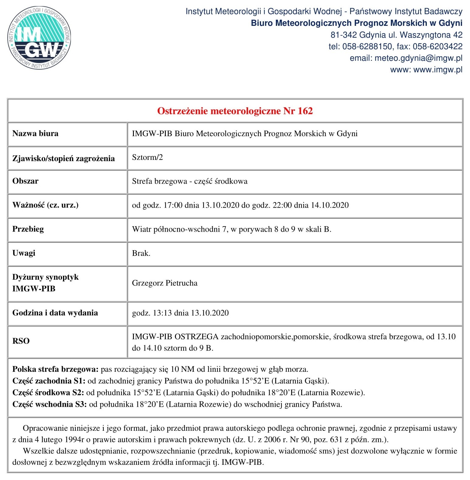 Instytut Meteorologii i Gospodarki Wodnej – Państwowy Instytut Badawczy, Biuro Meteorologicznych Prognoz Morskich w Gdyni ostrzega o sztormie w środkowej części strefy brzegowej. Ostrzeżenie obowiązuje od godz. 17:00 13.10.2020 do godz. 22:00 14.10.2020. Przewidywany jest wiatr północno-wschodni o sile 7, w porywach do 8-9 w skali B.