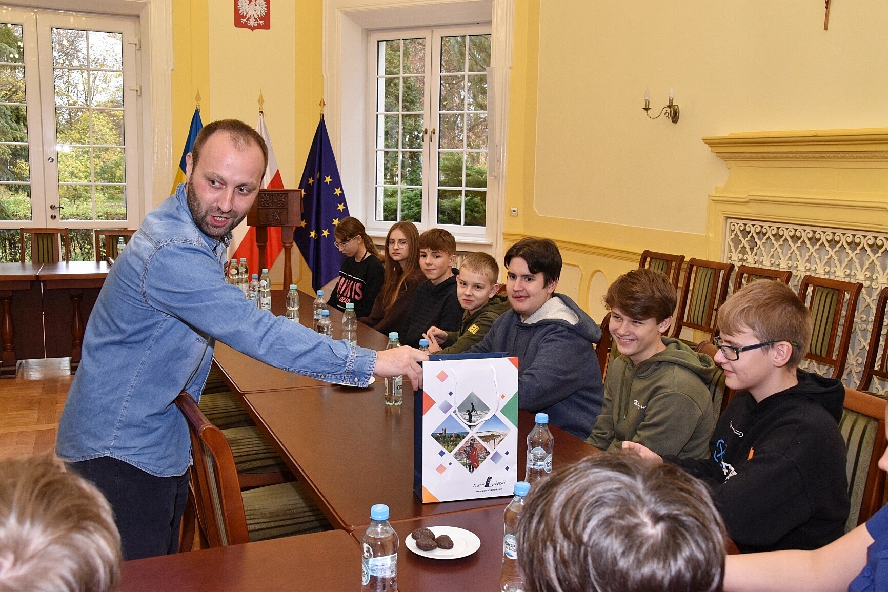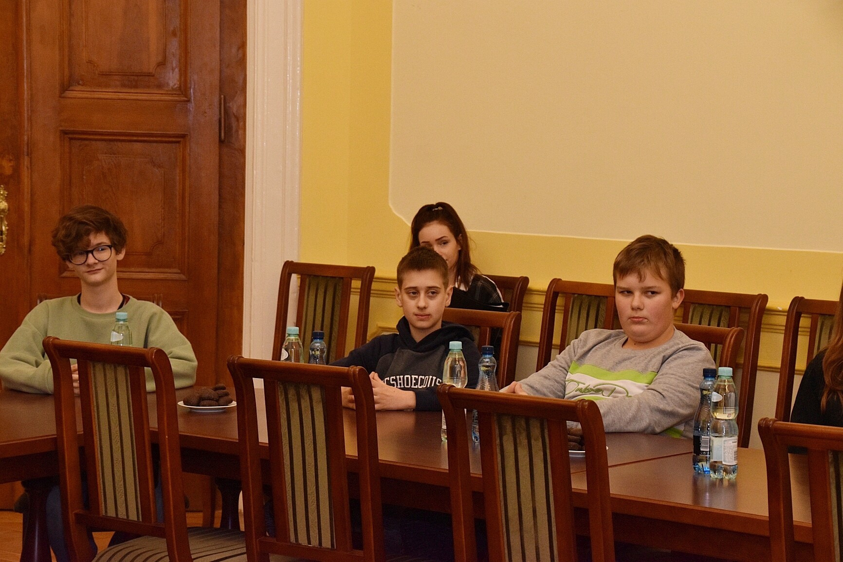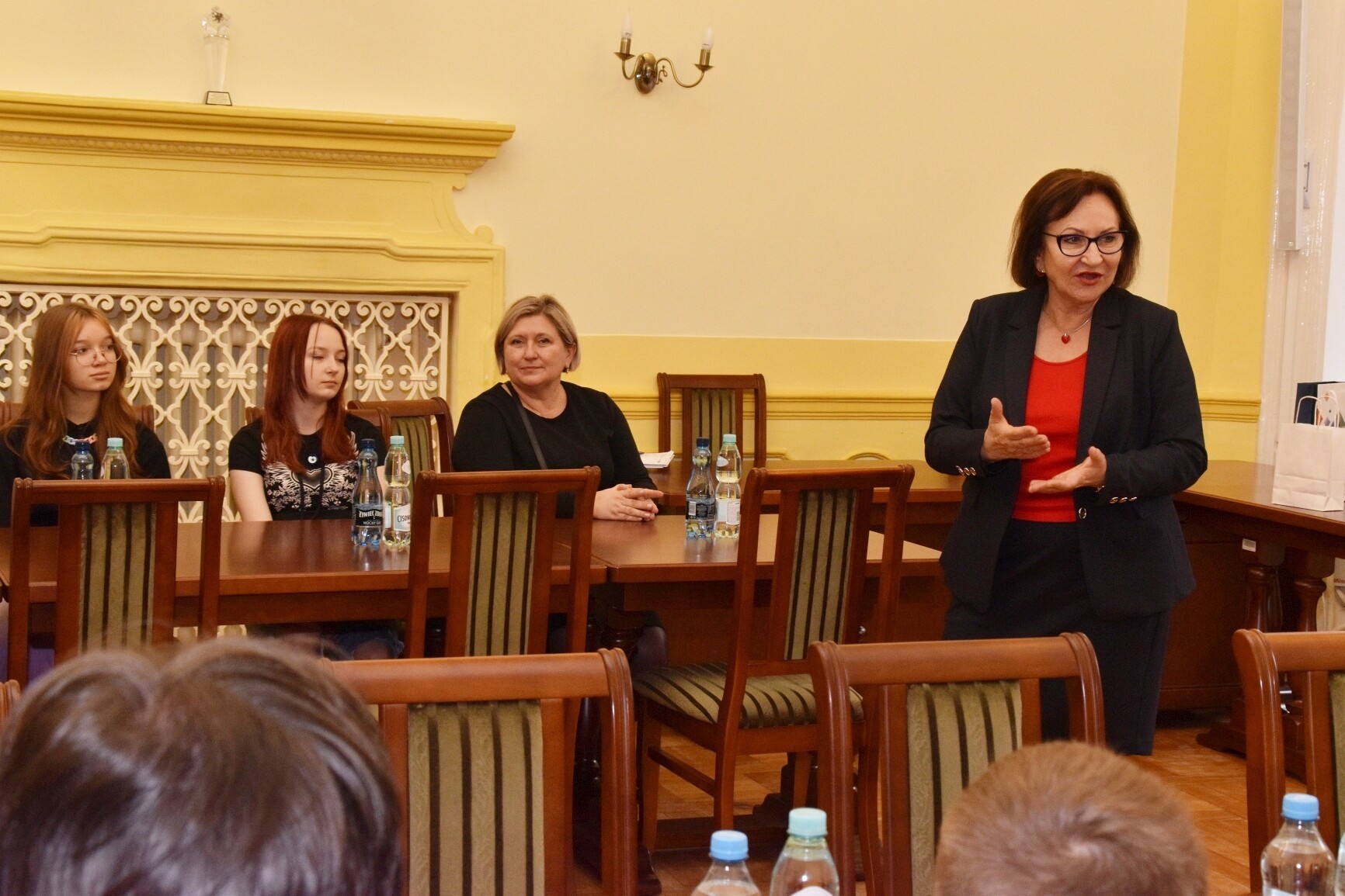 Starosta Alicja Zajączkowska opowiedziała młodzieży o zadaniach realizowanych przez urząd, zasadach sprawowania mandatu przez radnych, a także o predyspozycjach i przygotowaniu sprzyjających sprawowaniu w przyszłości funkcji publicznych. – Być może ktoś z was kiedyś zasiądzie za tym stołem w charakterze radnej, czy radnego Powiatu Lęborskiego – mówiła starosta, zachęcając młodzież do „zmierzenia się” z mównicą w Sali obrad Rady Powiatu i wygłoszenia kilku słów.