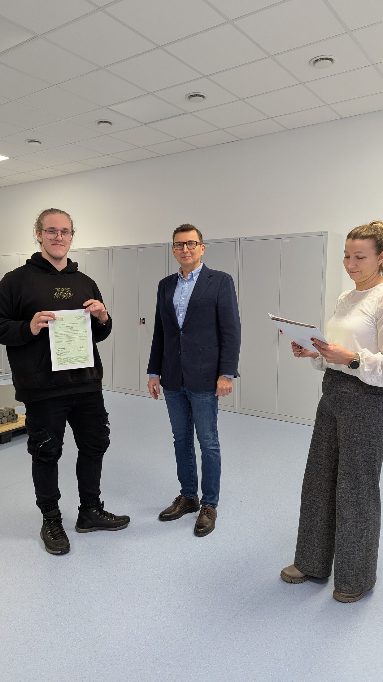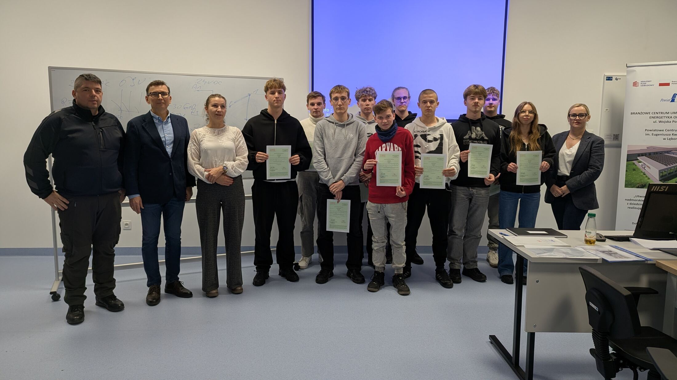 W piątek, 05.12.2025 r., pierwsza grupa młodych, ambitnych i zdeterminowanych uczestników odebrała swoje certyfikaty ukończenia szkolenia z energetyki odnawialnej.