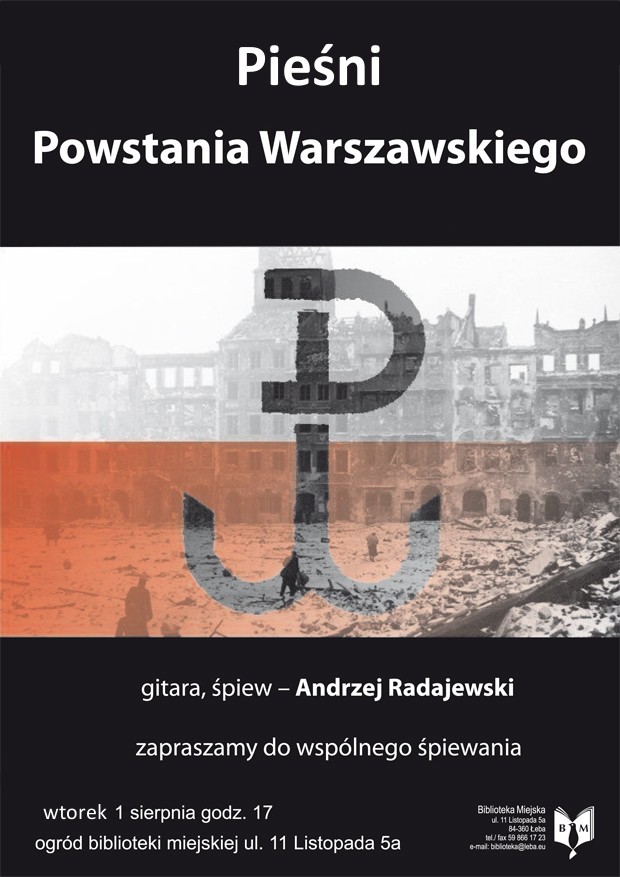 W tym roku przypada 73. rocznica Powstania Warszawskiego. Mieszkańcy Łeby, zwłaszcza ci, którzy mieszkają przy ulicy Powstańców Warszawy, pamiętają o powstańcach i co roku 1 sierpnia przed swoimi domami zapalają znicze.Tradycją stało się także, że w tym dniu w bibliotece miejskiej w Łebie łebianie i przebywający na wczasach goście spotykają się na wspólnym śpiewaniu pieśni powstańczych. Dlatego też zapraszamy, jak co roku, 1 sierpnia na godz. 17 do biblioteki. Śpiew poprowadzi Andrzej Radajewski. Wstęp jest wolny.