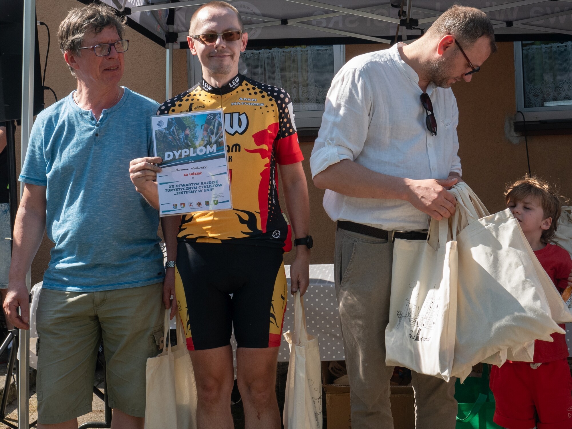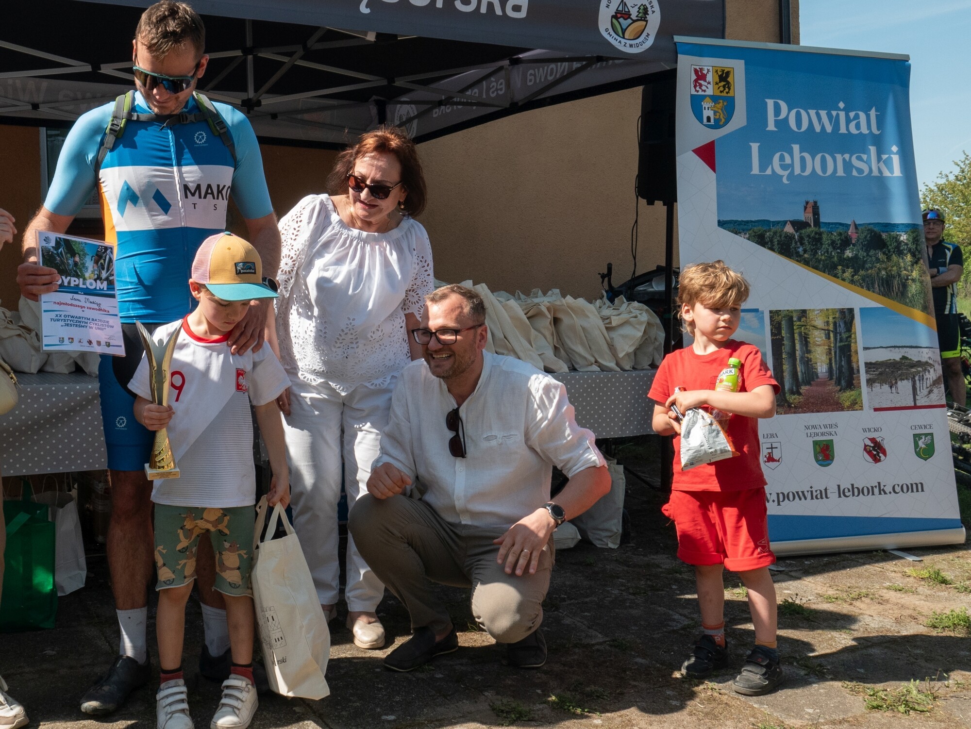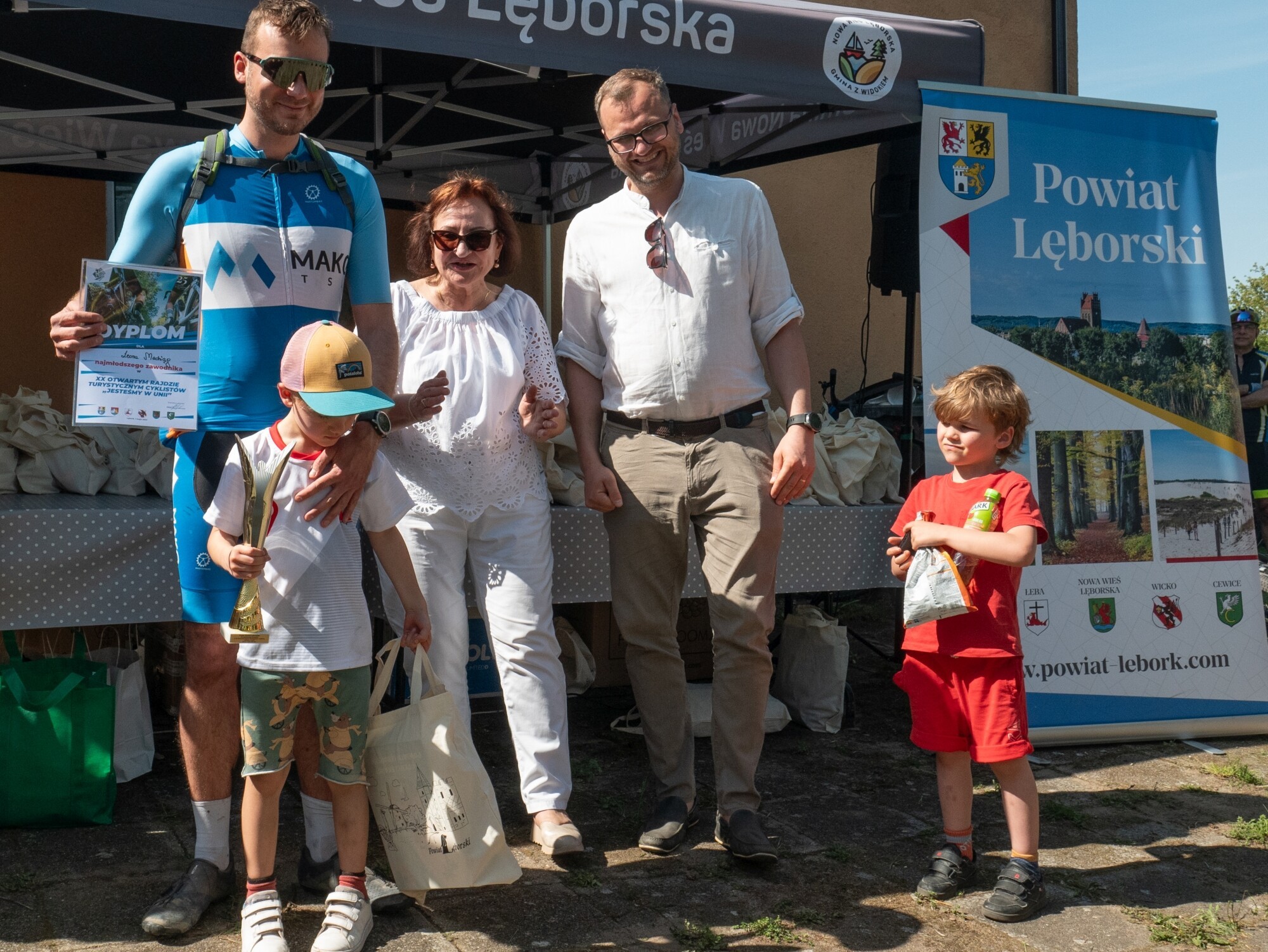 19,46 km trasa to było nie lada wyzwanie w gorączce pierwszego majowego weekendu. A w rajdzie się pojawili zarówno weterani, jak i najmłodsze pokolenie amatorów dwóch rowerowych kółek. Trasa – jak zwykle – wiodła drogami gościnnych sportowcom gmin Cewice i Nowa Wieś Lęborska. Rzadko się zdarza, nawet w profesjonalnych imprezach rowerowych tak duże zainteresowanie uczestników. Ponad 150 amatorek i amatorów rowerowej rekreacji przystąpiło do rajdu. Bywało trudno, zwłaszcza na piaskach za Krępkowicami, ale pomocni okazali się rowerzyści z Klubu Rowerowego „Lew Lębork”, którzy pomagali w naciąganiu spadających łańcuchów i strażacy z OSP w gminach Cewice i Nowa Wieś Lęborska, którzy zabezpieczali trasę rajdu i dbali, by każdy trafił dokładnie w tę dróżkę, która wiodła do świetlicy sołeckiej w Dziechlinie. To już 20 rajd z cyklu „Jesteśmy w Unii”, a 22. w ogóle od czasu kiedy Krzysztof Pruszak zaproponował młodym rolnikom z powiatu lęborskiego, by pojechali swoimi jednośladami do Unii Europejskiej. Krzysztof Pruszak również w tym roku poprowadził brawurowo i z charakterystycznym humorystycznym zacięciem finał tej imprezy w Dziechlinie. Było o ziemniakach, które są lepsze z pola niż z marketów i o tym, że więcej zyskujemy z Unii, niż do niej wpłacamy składek. Pan Krzysztof potrafi każdą wiadomość przedstawić w tak atrakcyjnej formie, która odrywa uczestników od rozstawionych na mecie stoisk z zupą, przygotowaną przez Koło Gospodyń w Mostach, kiełbasek zakupionych specjalnie dla sportowców z dbałością o największą zawartość „mięsa w mięsie” i napojów chłodzących, tak przydatnych po prawie 20-kilometrowej trasie. W rowerowym biegu tradycyjnie ustawiły się dwie stawki: wyczynowców i turystyków, którzy nie dbali o minutowe rekordy, ale o fajne spędzenie czasu na łonie natury w urokliwych krajobrazach gmin Cewice i NWL. Start do rajdu odbył się przed starostwem, gdzie w role startera dającego sygnał do biegu pistoletem była starosta Alicja Zajączkowska. Wśród obecnych na starcie można było dostrzec byłych, obecnych i przyszłych radnych miasta i powiatu. Nie zabrakło od lat przemierzającego trasę rajdu Ryszarda Wenty, członka Zarządu powiatu Lęborskiego. Rowerzystom sekundowała również Danuta Mikołajczyk – sekretarz Powiatu. Na starcie ostrym, przed jednostką wojskową, gdzie już nie było czasu i miejsca na rowerową zabawę, a zaczynał się poważny wyścig, salwę do startu oddał Jarosław Litwin, nowo wybrany burmistrz Lęborka. Od dwóch dziesięcioleci ORTC jest wspólną imprezą Powiatu Lęborskiego oraz samorządów Lęborka, Cewic i Nowej Wsi Lęborskiej. Ideą jest kultywowanie rowerowej pasji, bez względu na politykę, gospodarkę i światopogląd. Na mecie wraz ze starostą, przedstawicielem Zarządu Powiatu Lęborskiego i radnymi, nagrody wręczał nowo wybrany wójt Nowej Wsi Lęborskiej Szymon Medalion. Sport łączy, a nie dzieli – turystyka – jak się okazuje również. Dwudziesty rajd w dwudziestą rocznicę wejścia Polski do Unii Europejskiej wygrał Sławek Maciejewski z czasem 30 min 18 sek. Reprezentujący barwy „Lwa” Lębork. Tuż za nim Arkadiusz Petka z czasem 30.43” i na trzecim miejscu Krzysztof Wenta 30,56” Wśród kobiet, najszybsza okazała się Ania Strzelecka, która na mecie zameldowała się z czasem 36.45”. Puchary otrzymali również najmłodszy i najstarszy uczestnik rajdu: najmłodszym był Leon Madziąg, najstarszym - Jan Dominik Lipski. Oprócz zwycięzców, puchary otrzymali również najstarszy i najmłodszy uczestnik rajdu, zaś nagrody rzeczowe i pamiątkowe dyplomy podpisane przez starostę trafiły do wszystkich, którzy majówkę zdecydowali się spędzić na dwóch kółkach, a nie przy tradycyjnym grillu. Jako główni organizatorzy rajdu dziękujemy za wsparcie policjantom drogówki z Komendy Powiatowej Policji w Lęborku, strażakom OSP z gminy Cewice i Nowa Wieś Lęborska, Nadleśnictwom Lębork i Cewice, Sołectwu w Dziechlinie. Bez Was nie byłoby tej rekreacyjnej imprezy. Zwycięzcom w klasyfikacjach czasowych gratulujemy i zapraszamy wszystkich chętnych za rok o tej samej porze.