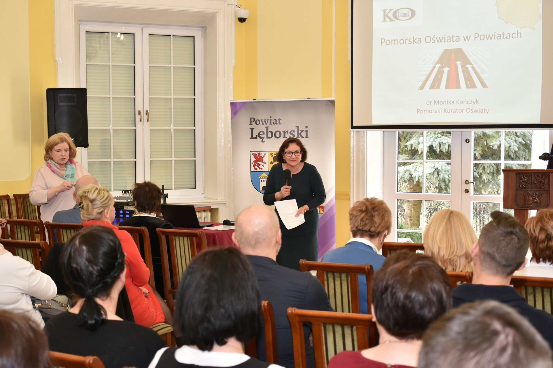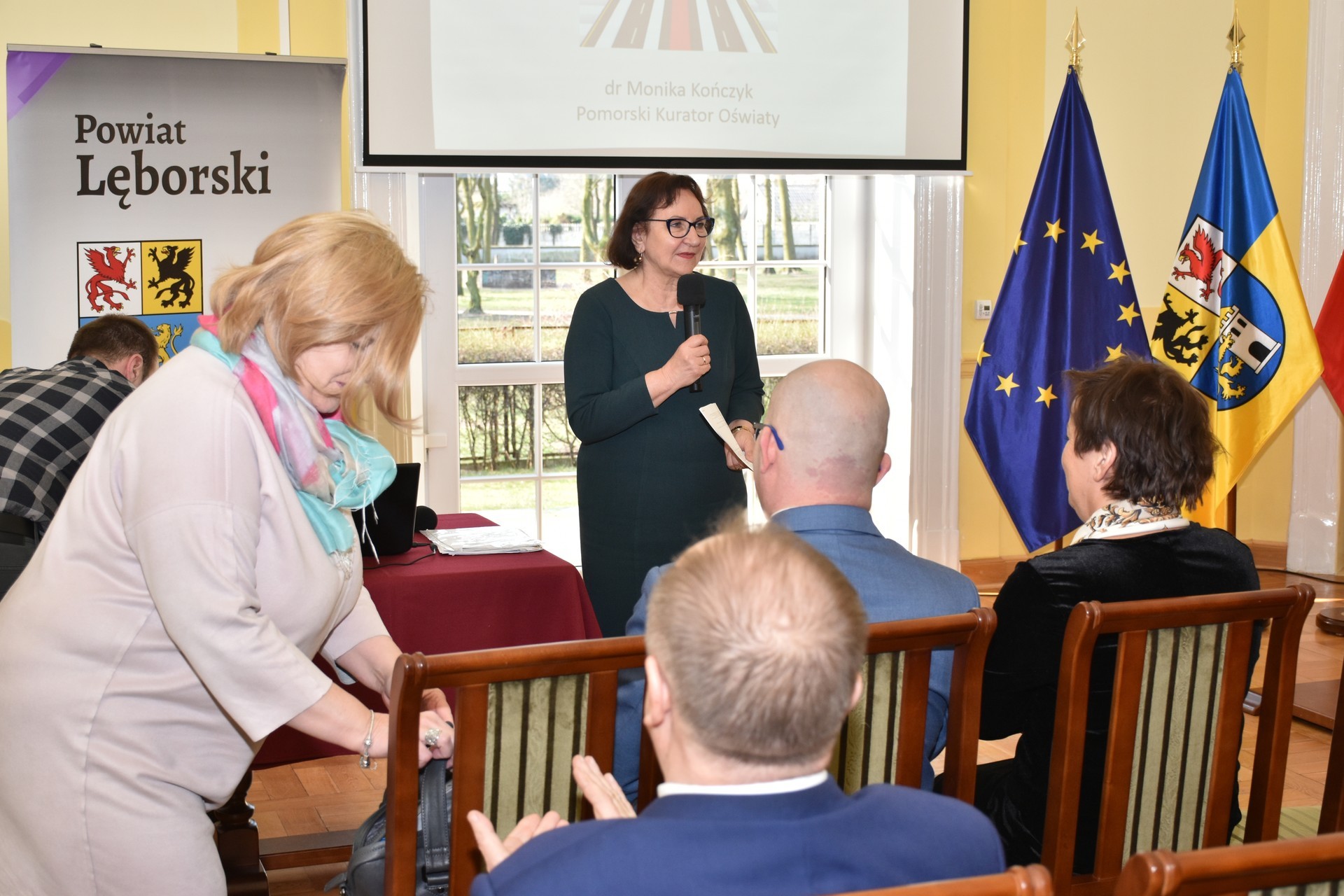Dr Monikę Kończyk powitała Alicja Zajączkowska, Starosta Lęborski. – W województwie pomorskim pracuje 43.764 nauczycieli, a więc to bardzo liczna grupa zawodowa – mówiła kurator M. Kończyk – W naszym regionie to zawód sfeminizowany, ponieważ aż 82% stanowią kobiety.