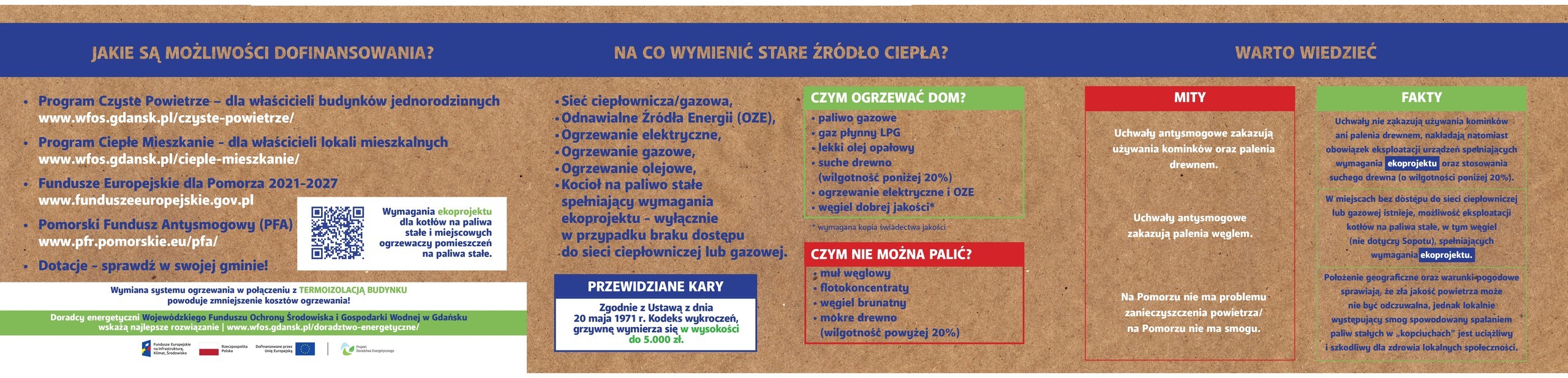 Zachęcamy do zapoznania się ulotką informacyjną Możesz odetchnąć! Przygotowaną w ramach akcji prowadzonej przez Wojewódzki Fundusz Ochrony Środowiska i Gospodarki Wodnej w Gdańsku wspólnie z Urzędem Marszałkowskim Województwa Pomorskiego. Znajdują się w nich wiadomości o możliwościach uzyskania dofinansowania na wymianę nieefektywnych źródeł ciepła, fakty i mity związane z uchwałami antysmogowymi, a także wiedza na temat czym ogrzewać dom, a czym palić nie wolno.