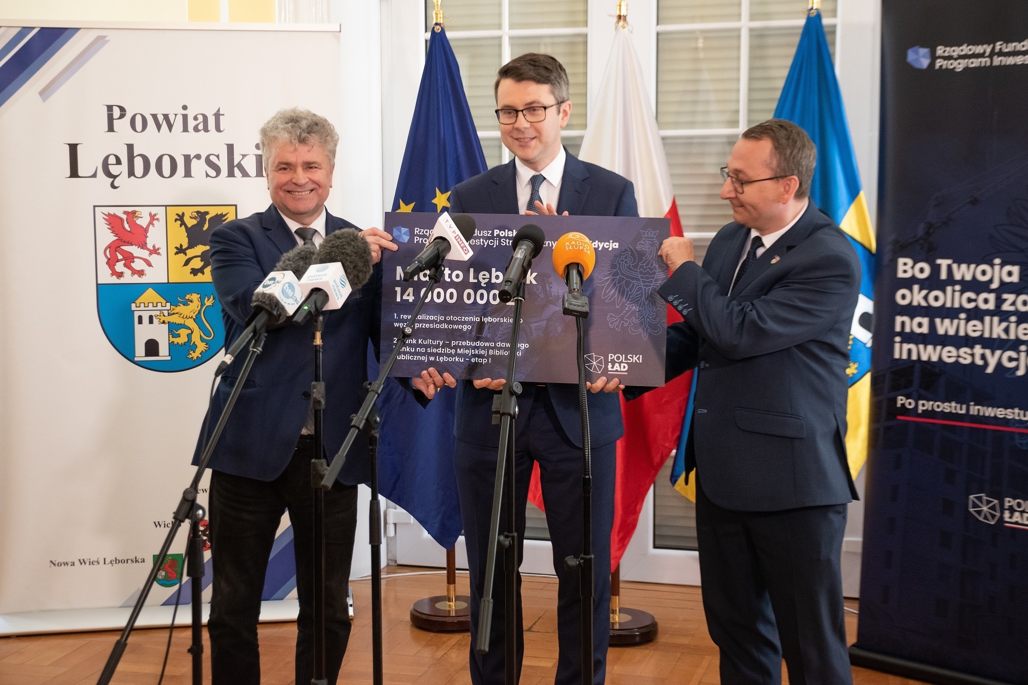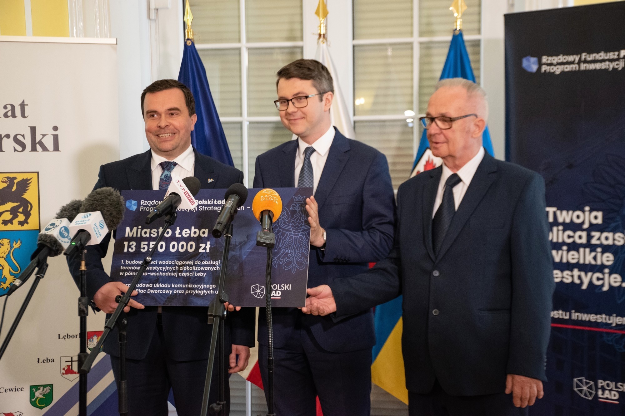 Kolejne co do wielkości dofinansowanie otrzyma Lębork – 14 mln zł. Jak zapowiedział burmistrz Witold Namyślak, środki zostaną przeznaczone na rewitalizację otoczenia lęborskiego węzła przesiadkowego oraz stworzenie Banku Kultury – I etapu przebudowy dawnego budynku banku na siedzibę Miejskiej Biblioteki Publicznej. 13 mln 550 tys. zł otrzyma Łeba. Zdaniem Krzysztofa Króla, zastępcy burmistrza tego miasta, pieniądze rządowe pozwolą na budowę sieci wodociągowej do obsługi terenów inwestycyjnych zlokalizowanych w północno-wschodniej części Łeby oraz przebudowę układu komunikacyjnego przy Placu Dworcowym i przyległych ulic. Gmina Cewice otrzyma 9 mln 635 tys. zł. Wójt Jerzy Bańka przeznaczy te środki na rozbudowę i przebudowę Zespołu Szkolno-Przedszkolnego w Siemirowicach wraz z zagospodarowaniem terenu. Powstanie także świetlica wiejska w Unieszynie oraz zostaną przeprowadzone prace termomodernizacyjne nas Osiedlu Na Wzgórzu w Cewicach. Dariusz Weleśkiewicz – wójt Gminy Wicko wykorzysta dofinansowanie w wysokości 9 mln 348 tys. 500 zł na budowę stacji uzdatniania wody wraz z siecią kanalizacyjną w Białogardzie, przebudowy dróg w miejscowościach: Szczenurze, Nieznachowo, Gęś, Dymnica i Nowęcin oraz na budowę świetlicy w Charbrowie i zmodernizowanie infrastruktury towarzyszącej. Kwota 5 mln zł dla Gminy Nowa Wieś Lęborska pozwoli na zamknięcie tematu budowy kanalizacji sanitarnej w Lubowidzu. Zdaniem odbierającego promesę dofinansowania wójta Zdzisława Chojnackiego, to obecnie priorytet, ponieważ rejon jeziora Lubowidzkiego to strategiczne miejsce o ogromnym potencjale rozwojowym, ciągle zbyt mało zagospodarowane właśnie z powodu słabego skanalizowania. Samorządowcy zarówno podczas oficjalnego spotkania, jak i w rozmowach kuluarowych podkreślali, że przyznane rządowe środki pomagają rozwiązywać problemy, które bez dodatkowego wsparcia nie miałyby przez długi czas szans na pomyślny finał.