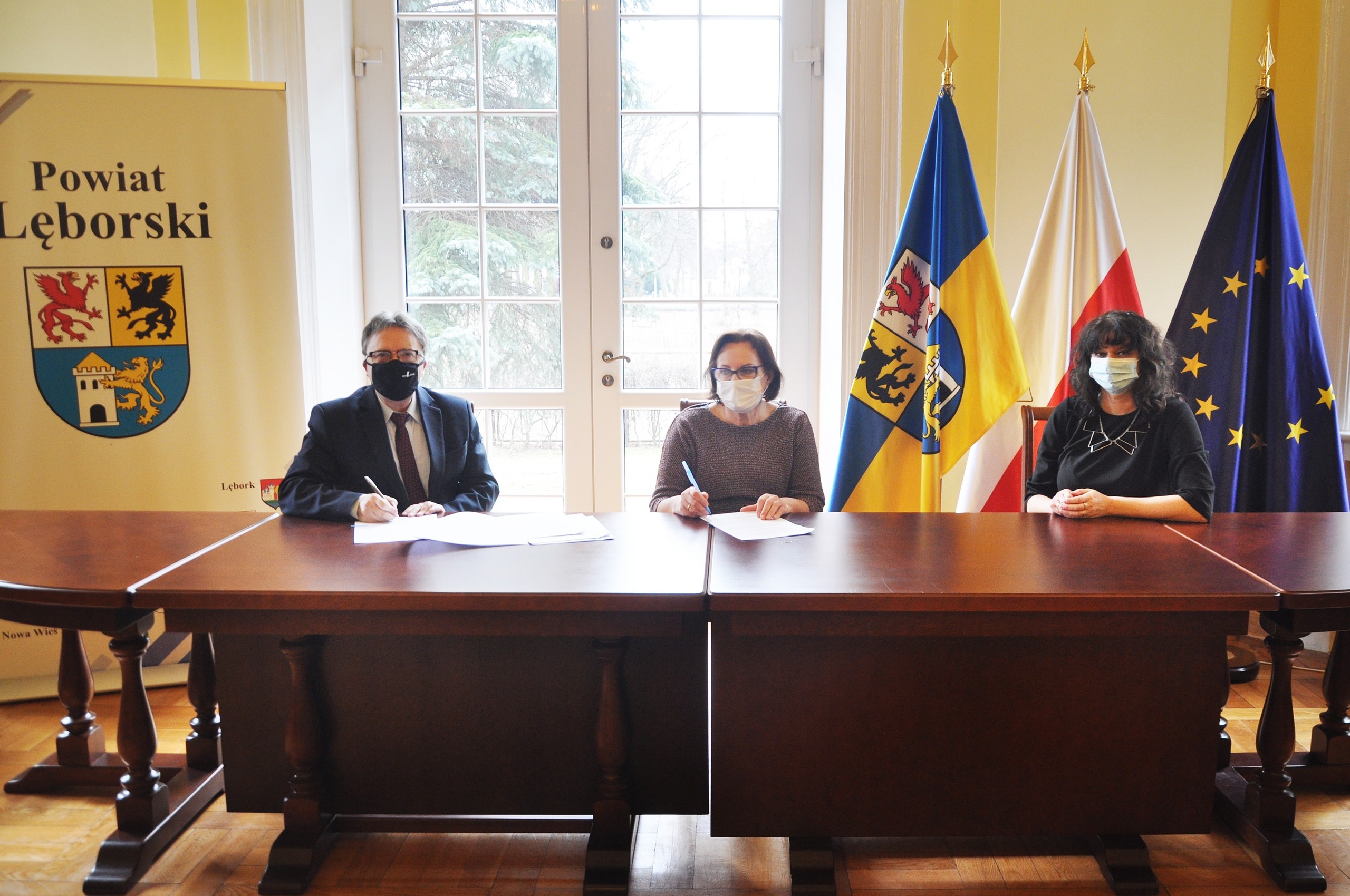 Umowę sygnowali: Alicja Zajączkowska – Starosta Lęborski, Edmund Głombiewski – Wicestarosta Lęborski i Witold Namyślak – Burmistrz Miasta Lęborka. Ze względów przeciwepidemicznych dokument podpisany został oddzielnie w każdej siedzibie urzędu. W starostwie sygnowanie porozumienia odbyło się w obecności Katarzyny Wach, dyrektora ZSO 1. W ramach umowy miasto przekaże powiatowi 200 tys. zł na wykonanie przedsięwzięcia zgodnie z zapisami projektowymi.