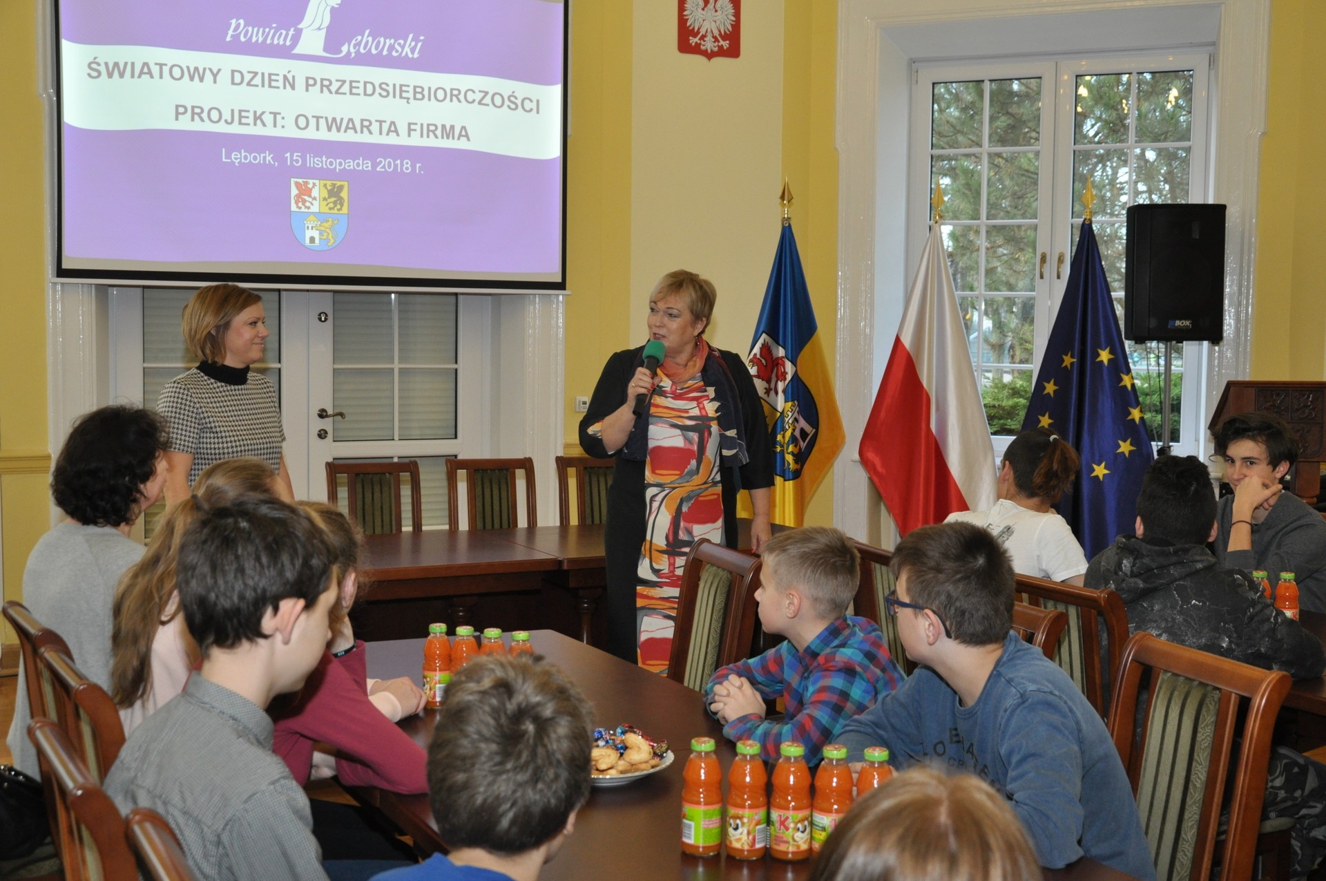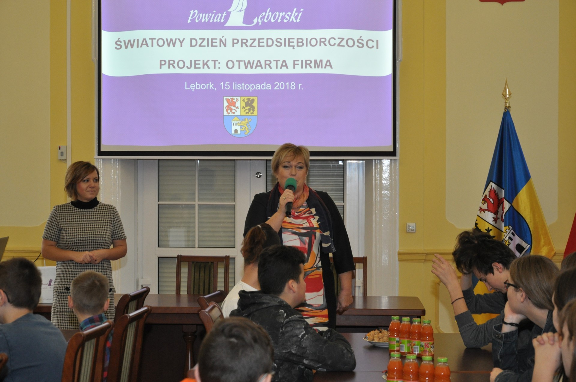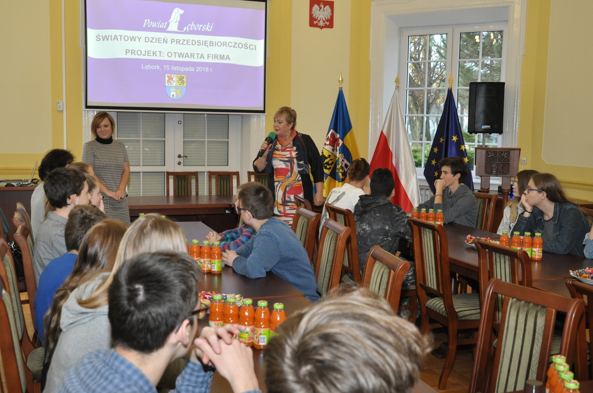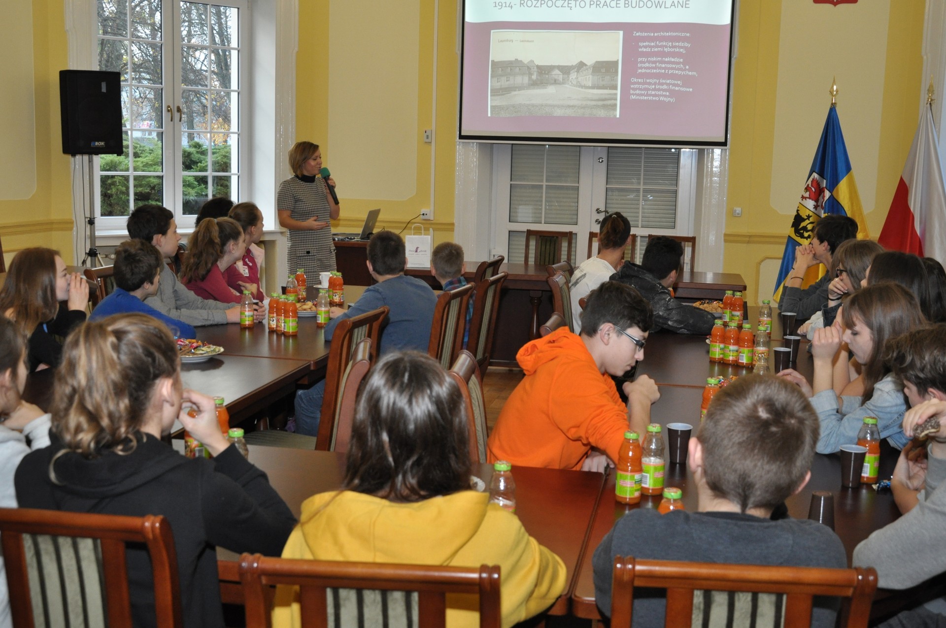 - Witam was serdecznie w historycznym, ponad 100-letnim budynku naszego starostwa. Za chwilę opowiemy wam o historii i współczesności tego obiektu. Cieszę się również, że interesujecie się zagadnieniami przedsiębiorczości. To bardzo przydatna wiedza we współczesnych czasach – mówiła Elżbieta Godderis, Wicestarosta Lęborski, która przywitała młodzież w sali obrad Rady Powiatu Lęborskiego.