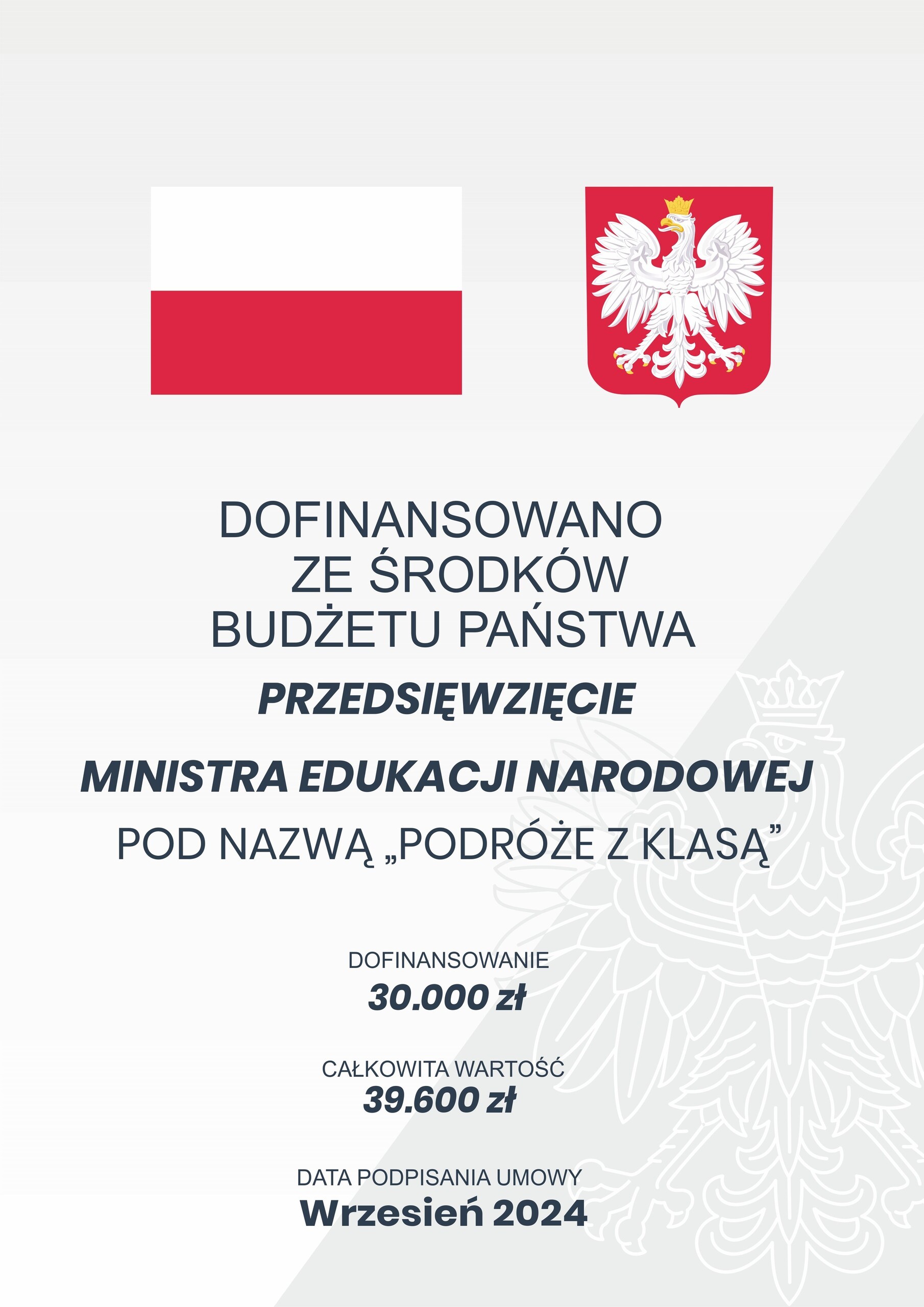 Powiat Lęborski w ramach realizacji przedsięwzięcia Ministra Edukacji Narodowej pod nazwą "Podróże z klasą" otrzymał dofinansowanie z budżetu państwa w postaci dotacji celowej w wysokości 30 000 zł. Całkowita wartość zadania wynosi 39 600 zł. Celem przedsięwzięcia jest uatrakcyjnienie procesu edukacyjnego dzieci i młodzieży poprzez umożliwienie im poznania tradycji, kultury oraz osiągnięć polskiej nauki. Środki finansowe w ramach dotacji celowej przeznaczone są na dofinansowanie wycieczki szkolnej. W ramach ww. zadania na wycieczkę szkolną wyjadą uczniowie z Powiatowego Centrum Edukacyjnego im. E. Kwiatkowskiego w Lęborku. Uczniowie wyjadą na 3-dniową wycieczkę.