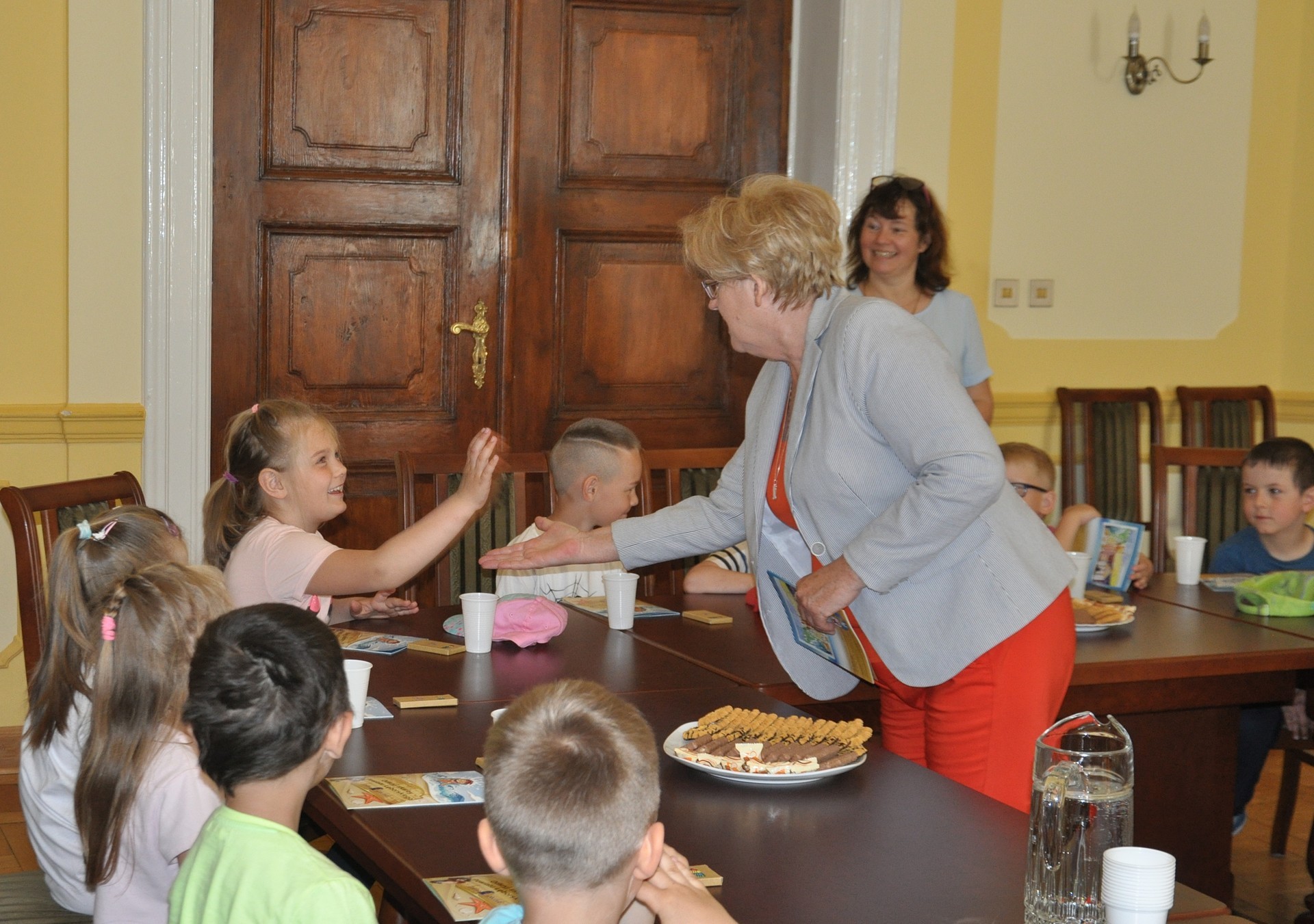 Po wzajemnej prezentacji i rozmowie z panią starostą, przy słodkim poczęstunku, dzieci mogły posłuchać opowieści Iwony Juchniewicz z Referatu Rozwoju i Promocji o tym czym zajmuje się starostwo, jakie sprawy można załatwić w urzędzie, a także o historii samego – już ponad 100-letniego – budynku urzędu i o legendach związanych z tym miejscem. Co to jest gmina? Czym różni się urząd miejski od starostwa? Z ilu gmin składa się powiat lęborski i jakie są znaczenia barw w powiatowym i gminnych herbach – to maluchy zaciekawiło na tyle, że na moment zdały się zapomnieć o kredkach i kolorowankach, które otrzymały od pani starosty. Na zakończenie wizyty przedszkolaki zwiedziły gabinet wicestarosty Elżbiety Godderis – miejsce, w którym zazwyczaj odbywają się spotkania Zarządu Powiatu Lęborskiego.