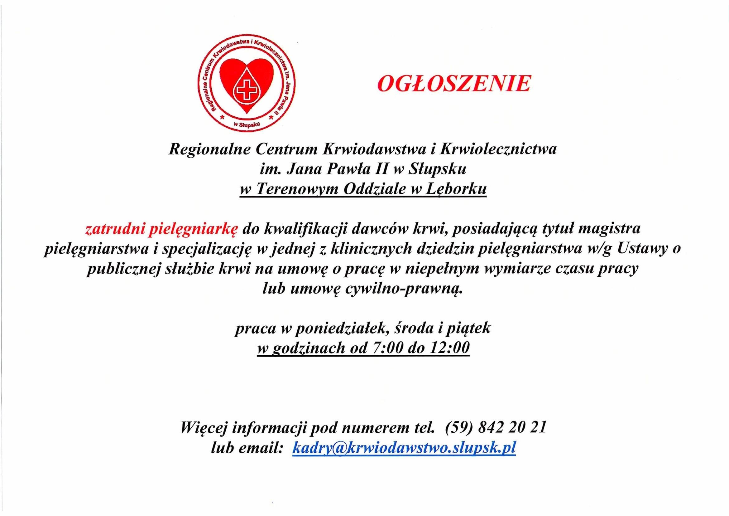 Regionalne Centrum Krwiodawstwa i Krwiolecznictwa w Słupsku zatrudni lekarza i pielęgniarkę. Oferta dotyczy pracy w Terenowym Oddziale RCKiK w Lęborku.