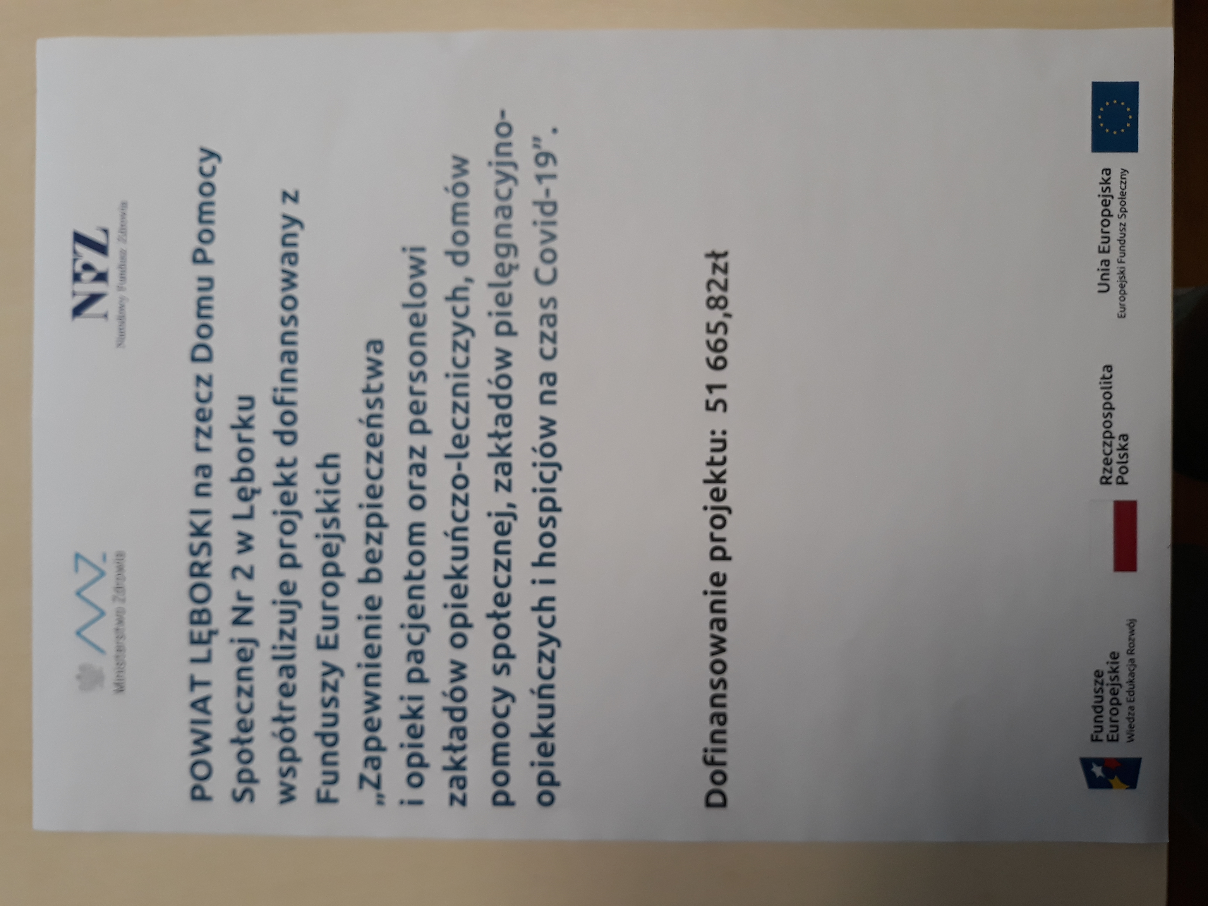 W ramach projektu POWER.05.02.22-00-001/20 jest „Zapewnienie bezpieczeństwa i opieki pacjentom oraz bezpieczeństwa personelowi zakładów opiekuńczo-leczniczych, domów pomocy społecznych, zakładów pielęgnacyjno-opiekuńczych i hospicjów na czas COVID-19”, Powiat Lęborski na rzecz Domu Pomocy Społecznej Nr 1 oraz Domu Pomocy Społecznej Nr 2 W Lęborku otrzymał Grant, którego celem jest realizacja zadań polegających na wypłacie dodatków do wynagrodzeń dla pracowników.
