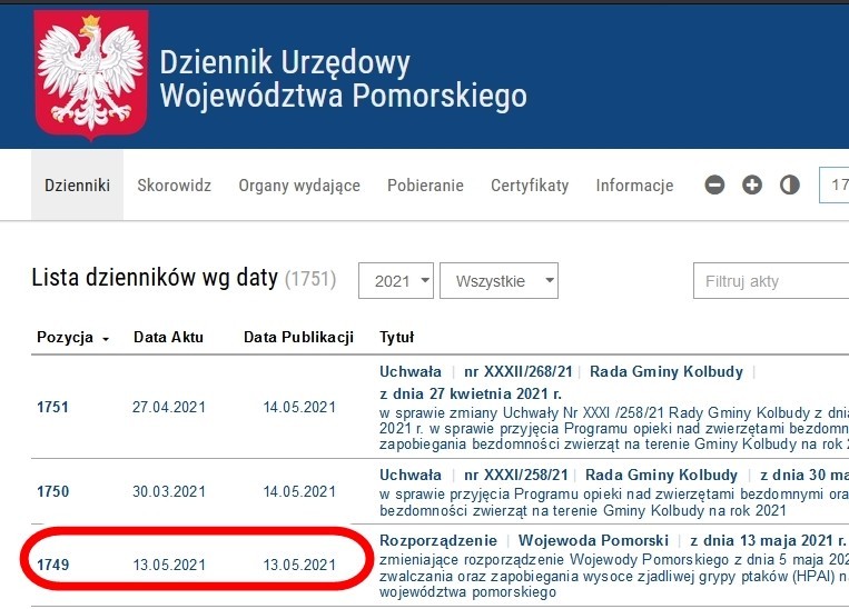 W Dzienniku Urzędowym Województwa Pomorskiego zostało opublikowane pod Poz. 1749 Rozporządzenie Wojewody Pomorskiego z dn. 13.05.2021 r. w sprawie zwalczania oraz zapobiegania wysoce zjadliwej grypie ptaków (HPAI) na terenie województwa pomorskiego.