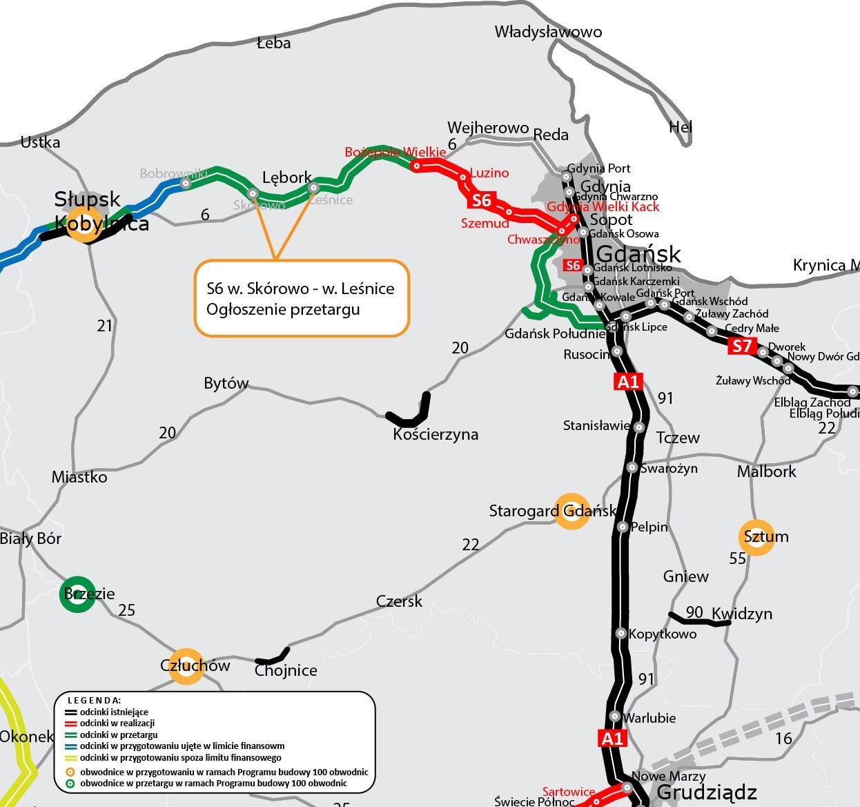 Droga ekspresowa S6 docelowo połączy stolice nadmorskich województw Polski. W budowie w województwie pomorskim są już trzy odcinki S6 między Bożympolem Wielkim a Gdynią o łącznej długości ok. 42 km. Natomiast w przetargu jest odcinek między Lęborkiem (Leśnicami) a Bożympolem Wielkim, druga jezdnia obwodnicy Słupska oraz duża i niezwykle ważna inwestycja dla Pomorza - S6 Obwodnica Metropolii Trójmiejskiej: odcinek Chwaszczyno - Żukowo (ok. 16,3 km) oraz odcinek Żukowo - Gdańsk Południe (ok. 16 km) wraz z obwodnicą Żukowa (ok. 7 km).