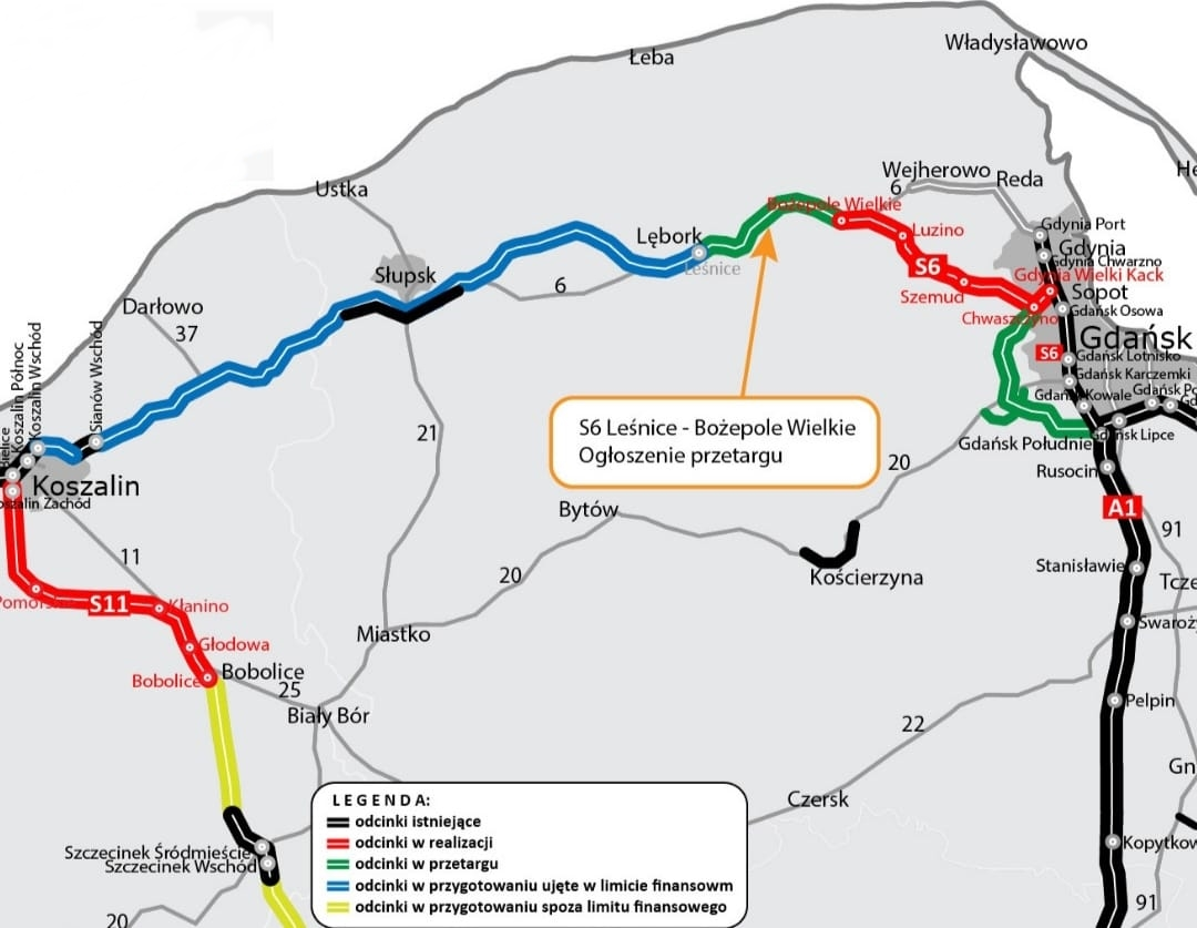 Deklaracje realizacji S6 i finansowego wsparcia przedsięwzięcia złożyli mieszkańcom regionu słupsko-lęborskiego zarówno Prezydent Andrzej Duda, jak i Premier Mateusz Morawiecki podczas odwiedzin regionu latem br. Realizacja ma się odbywać w formule projektuj i buduj. Odcinek S6 Bożepole Wielkie – Lębork (Leśnice) zostanie wybudowany jako dwujezdniowa droga ekspresowa, po dwa pasy ruchu w każdym kierunku, wraz z pasem awaryjnym. Na trasie przewidziano budowę węzłów Lębork-Południe, Lębork-Wschód, Łęczyce oraz rozbudowę węzła Bożepole Wielkie. Dzięki temu czas przejazdu tym odcinkiem skróci się o połowę, a także poprawi się bezpieczeństwo i komfort jazdy. Aktualne postępowanie przetargowe obejmuje odcinek drogi ekspresowej S6 realizowany po rządowej decyzji o przeznaczeniu dodatkowych środków z budżetu państwa na budowę Trasy Kaszubskiej. Przetargi na następne odcinki trasy do Słupska zostaną ogłoszone jeszcze w tym roku. Będą to zadania polegające na rozbudowie istniejącej obwodnicy Słupska do pełnych dwóch jezdni oraz budowie S6 od Lęborka do Słupska (w kilku odcinkach realizacyjnych). Jak poinformował Piotr Müller – Rzecznik Rządu, aktualnie w realizacji znajdują się następujące odcinki S6: Bożepole Wielkie – Luzino, Luzino - Szemud oraz Szemud - Gdynia - Wielki Kack. Zakończenie robót na tych odcinkach planowane jest – w zależności od odcinka - od lipca do października 2021. Jednoczenie trwa ogłoszony w sierpniu br. przetarg na realizację Obwodnicy Metropolii Trójmiejskiej: odc. Chwaszczyno – Żukowo (16,3 km) oraz Żukowo – Gdańsk Południe (16 km) wraz z obwodnicą Żukowa (7 km).