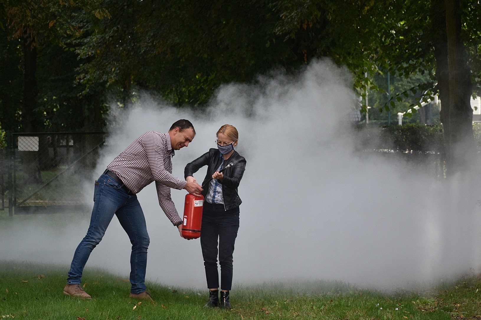„Prowadzenie ewakuacji I stopnia ludności z rejonu zagrożenia dla życia i zdrowia” – to temat ćwiczeń, w którym uczestniczyli pracownicy starostwa – w skrócie: sprawne opuszczenie budynku w związku z zagrożeniem pożarowym. Ćwiczenia są elementem stałego procesu doskonalenia znajomości instrukcji przeciwpożarowej i zasad ewakuacji. To również okazja do weryfikacji procedur i zasad obowiązujących w starostwie, by zapewnić jak najkrótszy czas ewakuacji i zapewnić maksymalne bezpieczeństwo osobom przebywającym na terenie urzędu. Dodatkowym elementem, który podlegał sprawdzeniu, było przestrzeganie procedur obowiązujących w związku z zagrożeniem pandemią Covid-19. Uczestniczący w ćwiczeniach pracownicy starostwa wykazali się dobrą znajomością instrukcji przeciwpożarowej. Podobnie we właściwy sposób został poinformowany dyżurny stanowiska kierowania Jednostki Ratowniczo – Gaśniczej, co też należy do pożądanych i zgodnych z zasadami zachowań. Po weryfikacji poprawności czynności ewakuacyjnych, na parkingu starostwa odbył się pokaz obsługi podręcznego sprzętu gaśniczego.