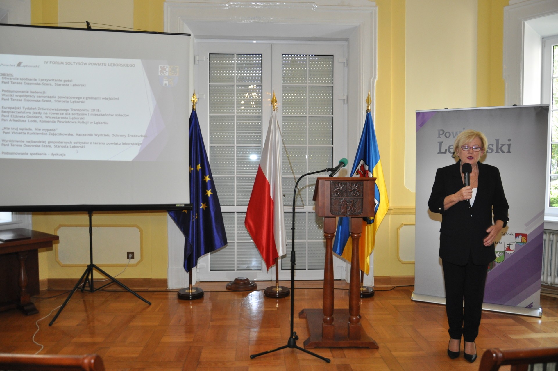 Zebranych przywitała Teresa Ossowska – Szara, Starosta Lęborski. Starosta zaprezentowała podsumowanie kadencji w zakresie współpracy samorządu powiatowego. Doceniła doskonałą współpracę z gminami szczególnie w zakresie współfinansowania inwestycji na drogach powiatowych, które oprócz znaczącego wpływu na ogólne bezpieczeństwo komunikacyjne, usprawniają komunikację na terenie gmin i sołectw. –Doceniam działania państwa sołtysów w zakresie gospodarnego zarządzania funduszami sołeckimi, pozyskiwanie dodatkowych środków i zaangażowanie w inicjatywy proekologiczne. Gospodarowanie finansami to zawsze duża odpowiedzialność. Wszyscy Państwo spisali się w tym zakresie doskonale i jestem przekonana, że z bardzo dobrym skutkiem dla zaspokajania potrzeb państwa lokalnych społeczności. – dodała Teresa Ossowska – Szara, Starosta Lęborski.