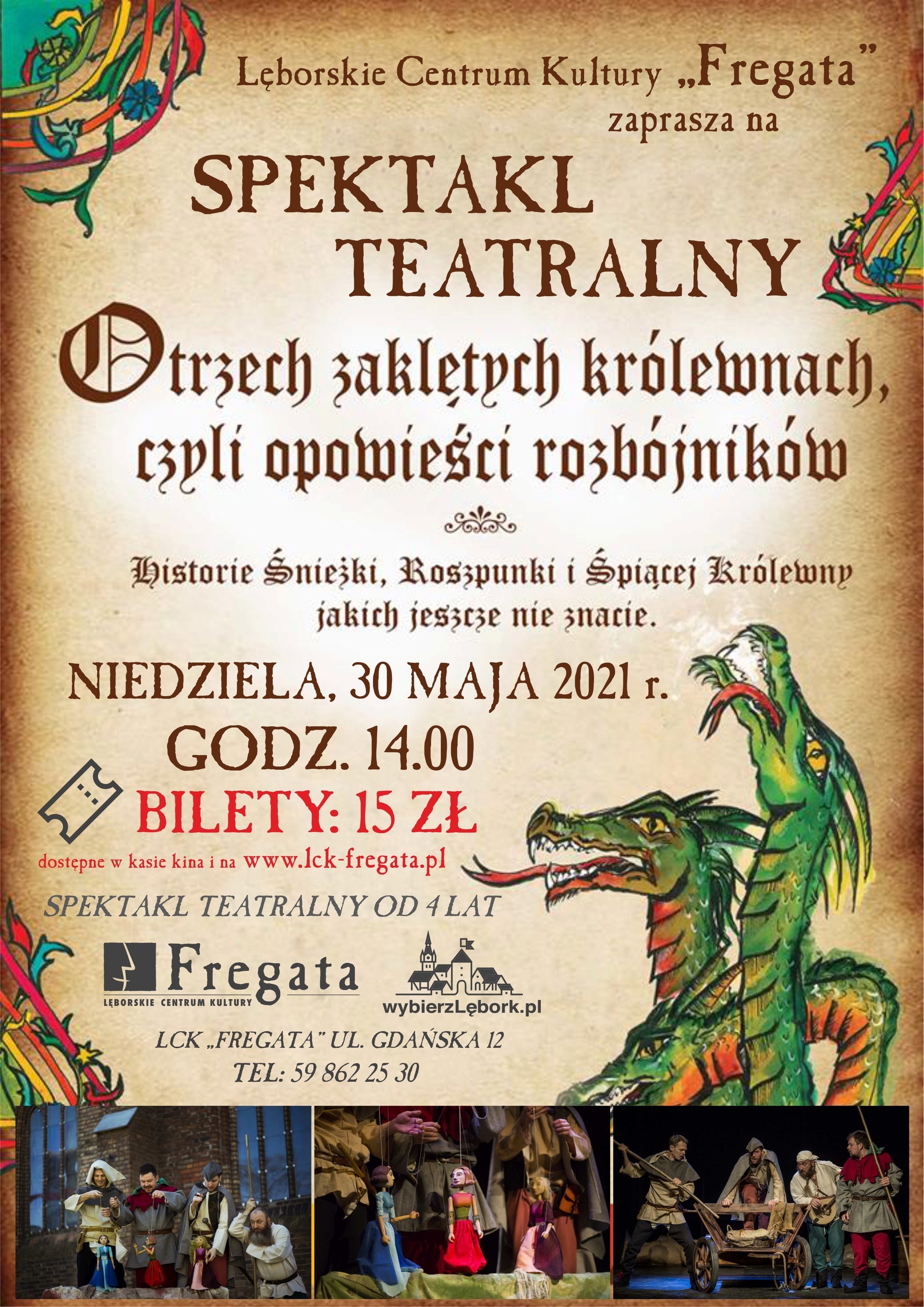 Lęborskie Centrum Kultury „Fregata” zaprasza na spektakl teatralny dla najmłodszych. 30 maja 2021 roku Teatr Lalki Tęcza zaprezentuje w Kinie „Fregata” przy ulicy Gdańskiej 12 przedstawienie pod tytułem „O trzech zaklętych królewnach, czyli opowieści rozbójników”. Początek o godzinie 14:00. Bilety w cenie 15 złotych dostępne są w Kasie Kina przy ulicy Gdańskiej oraz na stronie www.lck-fregata.pl w zakładce Kup/Zarezerwuj. Liczba biletów jest ograniczona. Przedstawienie przewidziane jest dla widzów od lat 4.