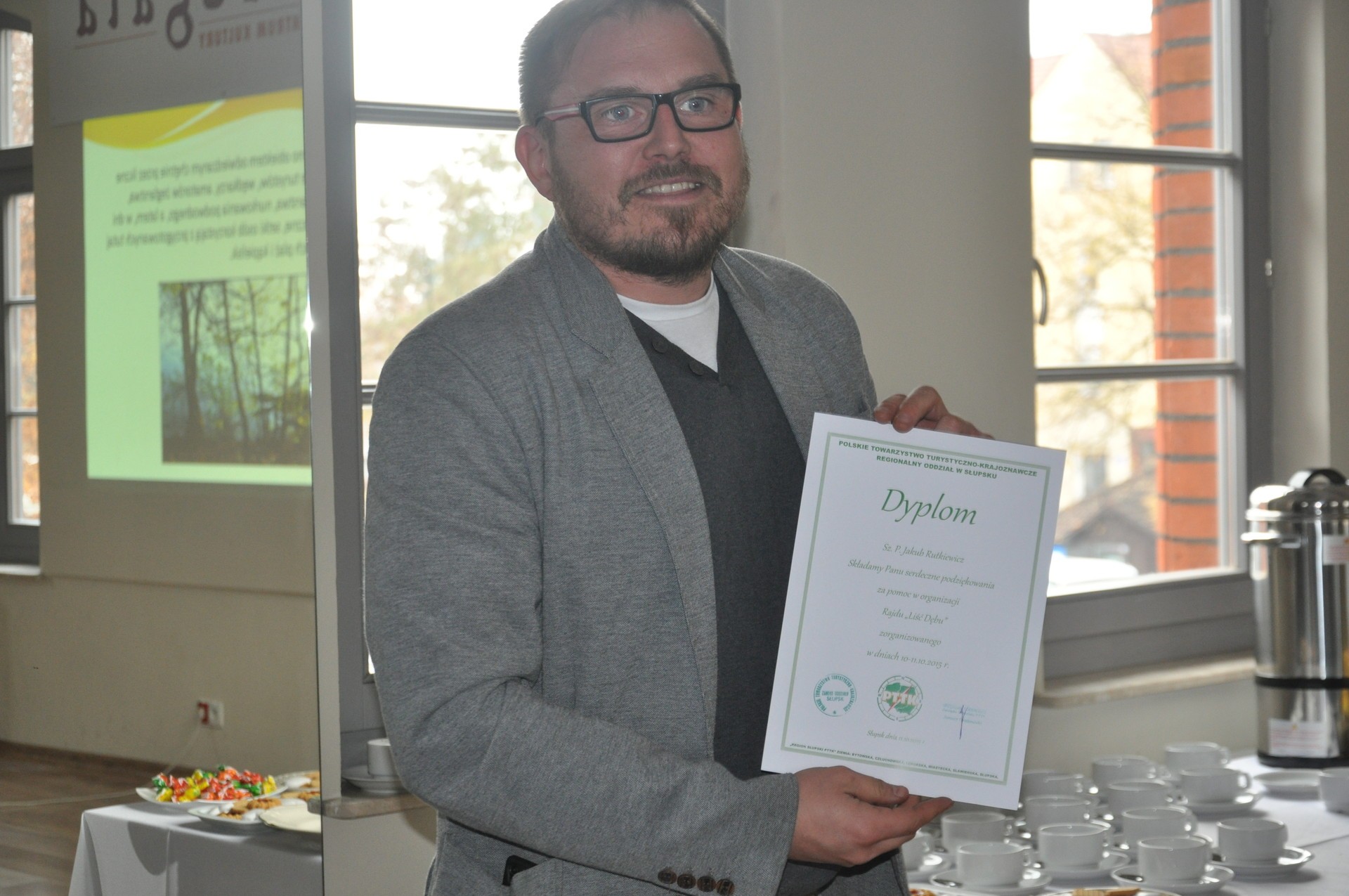 Podczas spotkania, Pan Janusz Grabowski wręczył podziękowania Panu Jakubowi Rutkiewicz za pomoc w organizacji rajdu "Liść Dębu", który odbył się w terminie 10-11.10.2015 r.