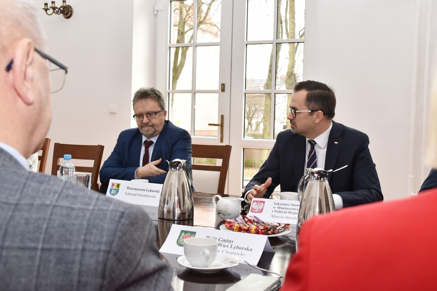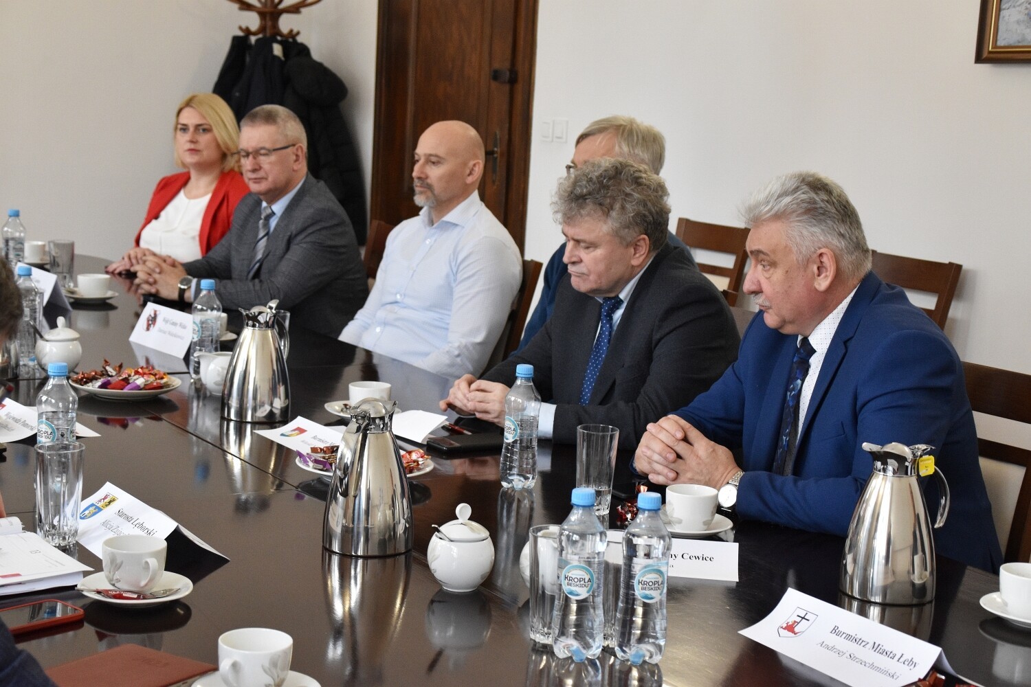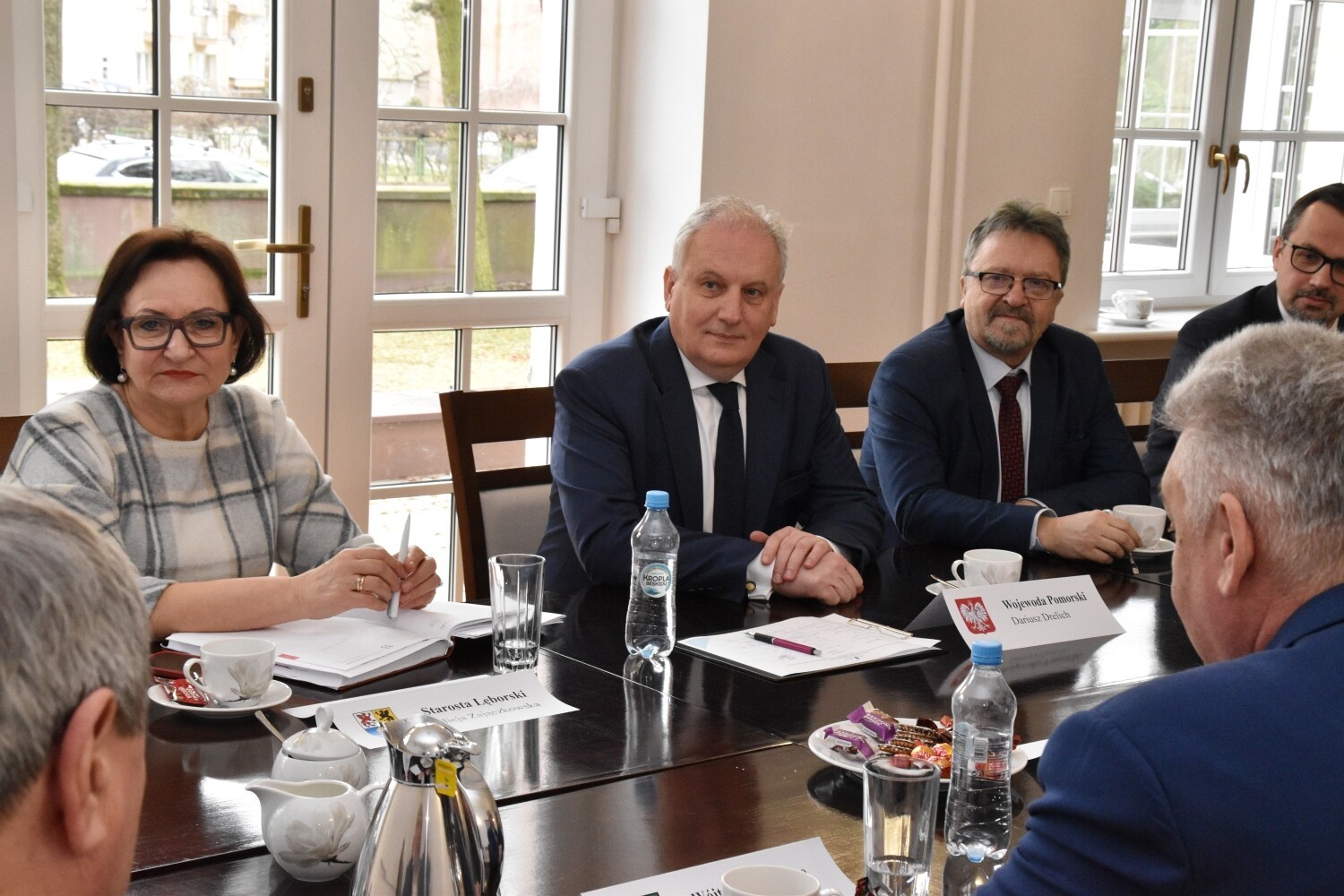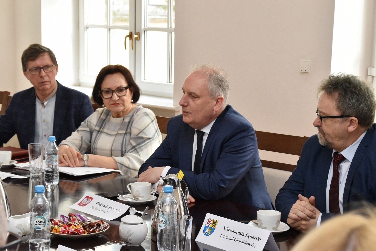 Tematem konwentu samorządowców było omówienie aktualnego postępu prac inwestycji realizowanych w regionie przy udziale środków rządowych. W roboczym spotkaniu Powiat Lęborski reprezentowali: Alicja Zajączkowska – Starosta Lęborski, wicestarosta Edmund Głombiewski, członkowie Zarządu Powiatu: Adam Nowak, Jacek Perłak i Ryszard Wenta oraz przewodniczący Rady Powiatu Lęborskiego Mirosław Tandek. Samorząd miejski i gminny reprezentowali: Jerzy Bańka – wójt Gminy Cewice, burmistrz Lęborka – Witold Namyślak, burmistrz Łeby – Andrzej Strzechmiński, wójt Gminy Nowa Wieś Lęborska – Zdzisław Chojnacki wraz z zastępcą – Moniką Włusek oraz Dariusz Waleśkiewicz – wójt Gminy Wicko. Dyskutowano m.in. o kondycji finansowej samorządów, możliwościach pozyskiwania środków zewnętrznych, w tym rządowych dofinansowań do inwestycji, planach inwestycyjnych na bieżący rok, projektach społecznych i inwestycjach drogowych. Wśród tematów dotyczących dróg, w związku z realizowaną budową lęborskiego odcinka drogi S6, powróciła kwestia potrzeby wykonania drogi umożliwiającej zjazd z budowanej S6 w kierunku Łeby, z pominięciem centrum Lęborka, co pozwoliłoby uniknąć korków w mieście, zwłaszcza w okresie nasilonego ruchu turystycznego i możliwości pozyskania finansowania tego przedsięwzięcia lub wariantu rozwojowego potrzebnego łącznika. Część dyskusji dotyczyła proceduralnych kwestii obsługi wniosków i sprawnego rozliczania przyznanych środków, co mogłoby skrócić i ułatwić całość procesu inwestycyjnego. – Cieszę się z wymiaru rządowego wsparcia do inwestycji w powiecie. W ciągu trzech lat na same inwestycje drogowe otrzymaliśmy 40 mln zł, które zostały dobrze zagospodarowane z korzyścią dla mieszkańców poprzez poprawę bezpieczeństwa i komfortu poruszania się po drogach. Wpłynęły również na podniesienie atrakcyjności obszarów inwestycyjnych na naszym terenie – podsumowuje wicestarosta Edmund Głombiewski – Powiat i gminy w powiecie mają duże potrzeby, ale mam nadzieję, że dzięki dobrej współpracy z administracją rządową będziemy mogli liczyć na kolejne środki, a działając wspólnie w gronie samorządowym, będziemy mogli z czasem sukcesywnie potrzeby mieszkańców naszego regionu zaspokajać.