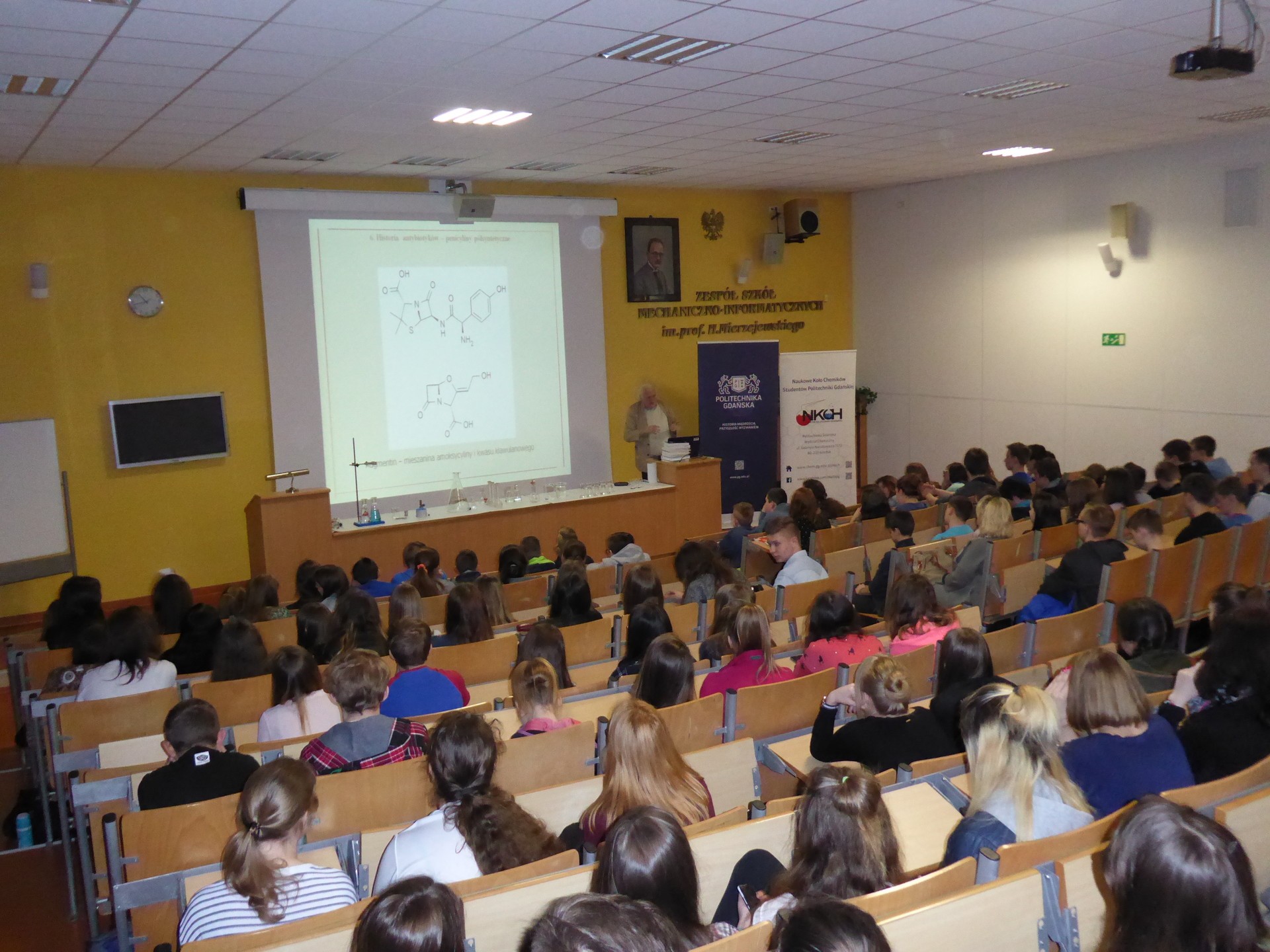 Konkurs rozpoczął się o godzinie 9.00. Uczestników przywitała dyrektor szkoły, pani Joanna Sawińska-Majer. Podczas oczekiwania na wyniki konkursu uczestnicy oraz uczniowie klas przyrodniczych ZSO nr 2 i zaproszeni gimnazjaliści wysłuchali ciekawego wykładu wygłoszonego przez pracownika Politechniki Gdańskiej -mgr inż. Antoniego Konitza nt ,,Historii antybiotyków”. Następnie studenci z Koła Chemicznego Studentów Politechniki Gdańskiej zaprezentowali bardzo ciekawe i efektowne doświadczenia chemiczne
