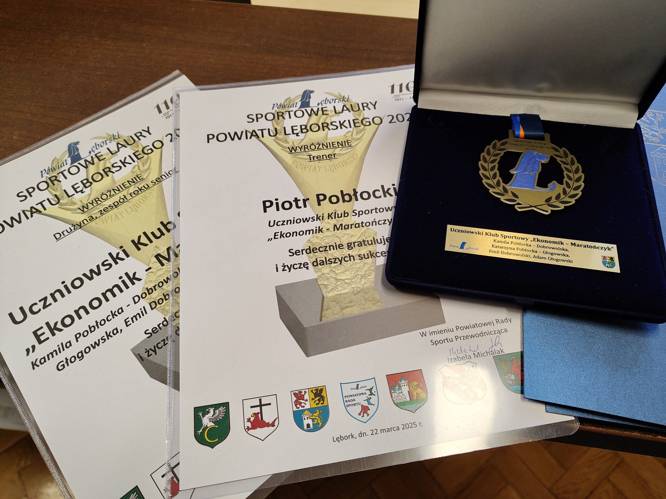 Uczniowski Klub Sportowy Ekonomik Maratończyk otrzymał wyróżnienia Powiatowej Rady Sportu w kategorii „Drużyna, zespół roku – senior”. Wyróżnienie przyznano trenerowi Piotrowi Pobłockiemu. Wśród deszczu nagród znalazły się również medale dla zawodniczek i zawodników klubu. Spotkanie w starostwie nastąpiło w związku z nieobecnością wyróżnionych podczas Gali Sportu Powiatu Lęborskiego, którym w osobistym odbiorze przeszkodziły obowiązki związane z udziałem w zawodach. Nagrody odebrała Bożena Pobłocka – również utytułowana zawodniczka. Wśród ostatnich sukcesów pani Bożeny z minionego roku znalazły się m.in.: złoty medal w Mistrzostwach Polski Masters w Kolnie i srebro w Biegu Kociewskim w Starogardzie Gd. Jest także współautorką ubiegłorocznego sukcesu mieszanej reprezentacji lęborskiego samorządu, którzy zajął pierwsze miejsce w 27. Ogólnopolskim Biegu Samorządowego „Bursztyn Jarosławca”.
