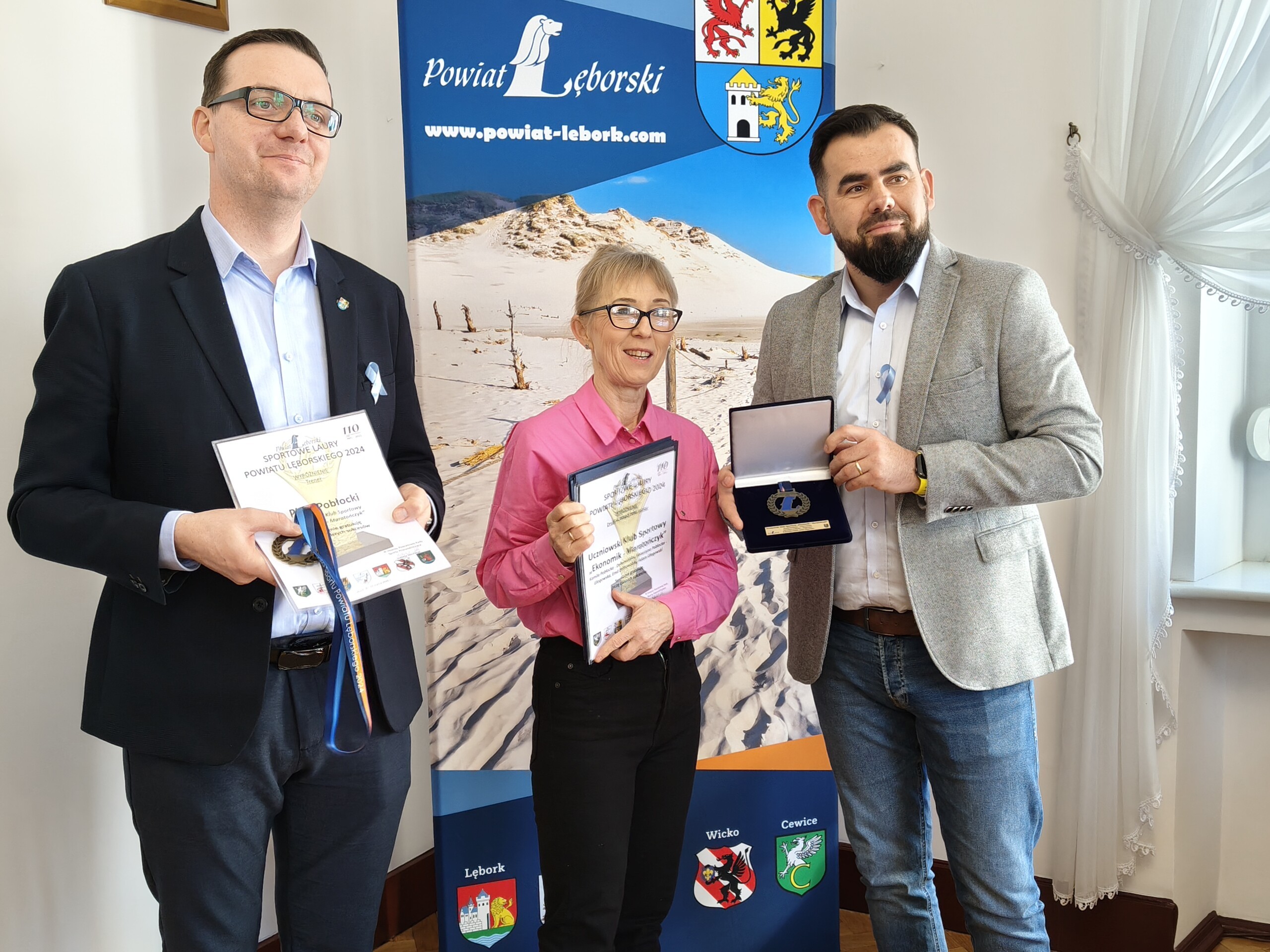 Starosta Tomasz Litwin wraz z wicestarostą Adrianem Wentą przekazali nagrody i wyróżnienia biegaczom UKS Ekonomik Maratończyk. W imieniu wyróżnionych medale i dyplomy odebrała reprezentująca klub biegaczka, a jednocześnie radna Rady Miejskiej w Lęborku – Bożena Pobłocka.