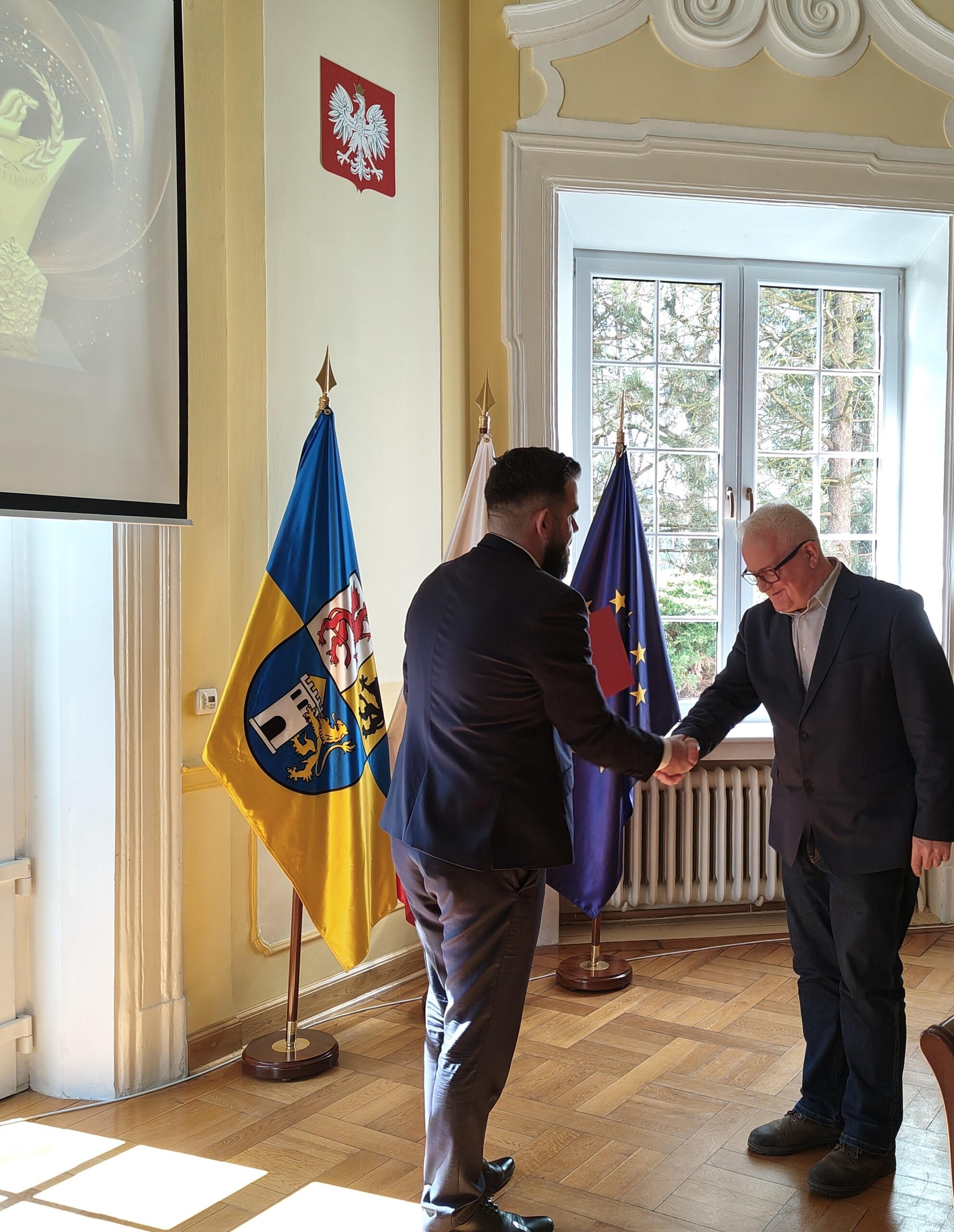 Starosta Lęborski Tomasz Litwin wspólnie z wicestarostą Adrianem Wentą wręczyli we wtorkowe popołudnie (1.04) statuetki, nagrody i wyróżnienia siatkarzom z SPS Lębork oraz UKS IRYDA Cewice.