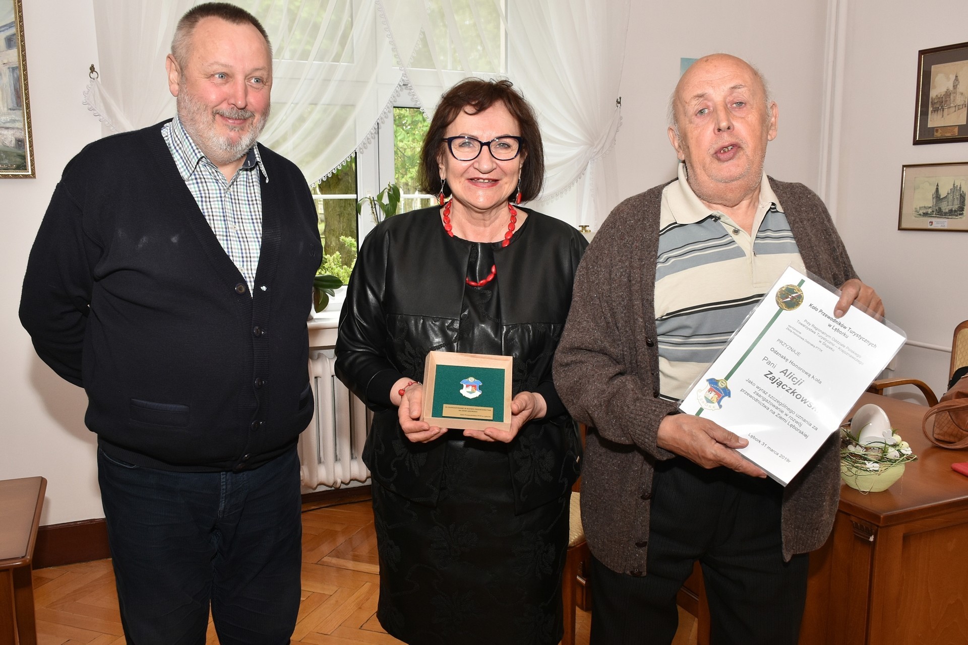 Alicja Zajączkowska, Starosta Lęborski otrzymała Honorową Odznakę PTTK. Wręczenia dokonali: Przemysław Mikusiński, Honorowy Prezes Koła PTTK w Lęborku i Jan Kiśluk, Wiceprezes Koła Przewodników.