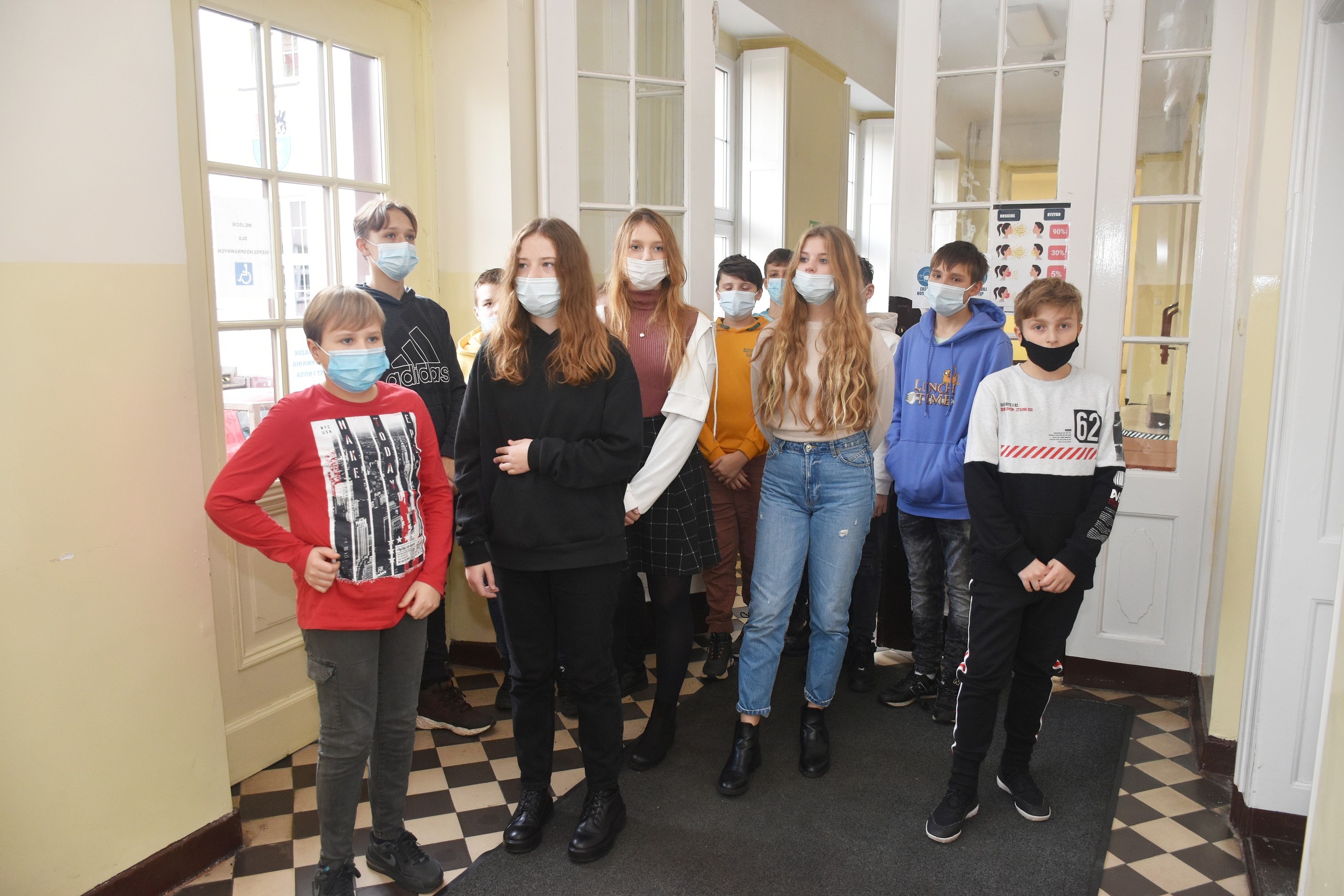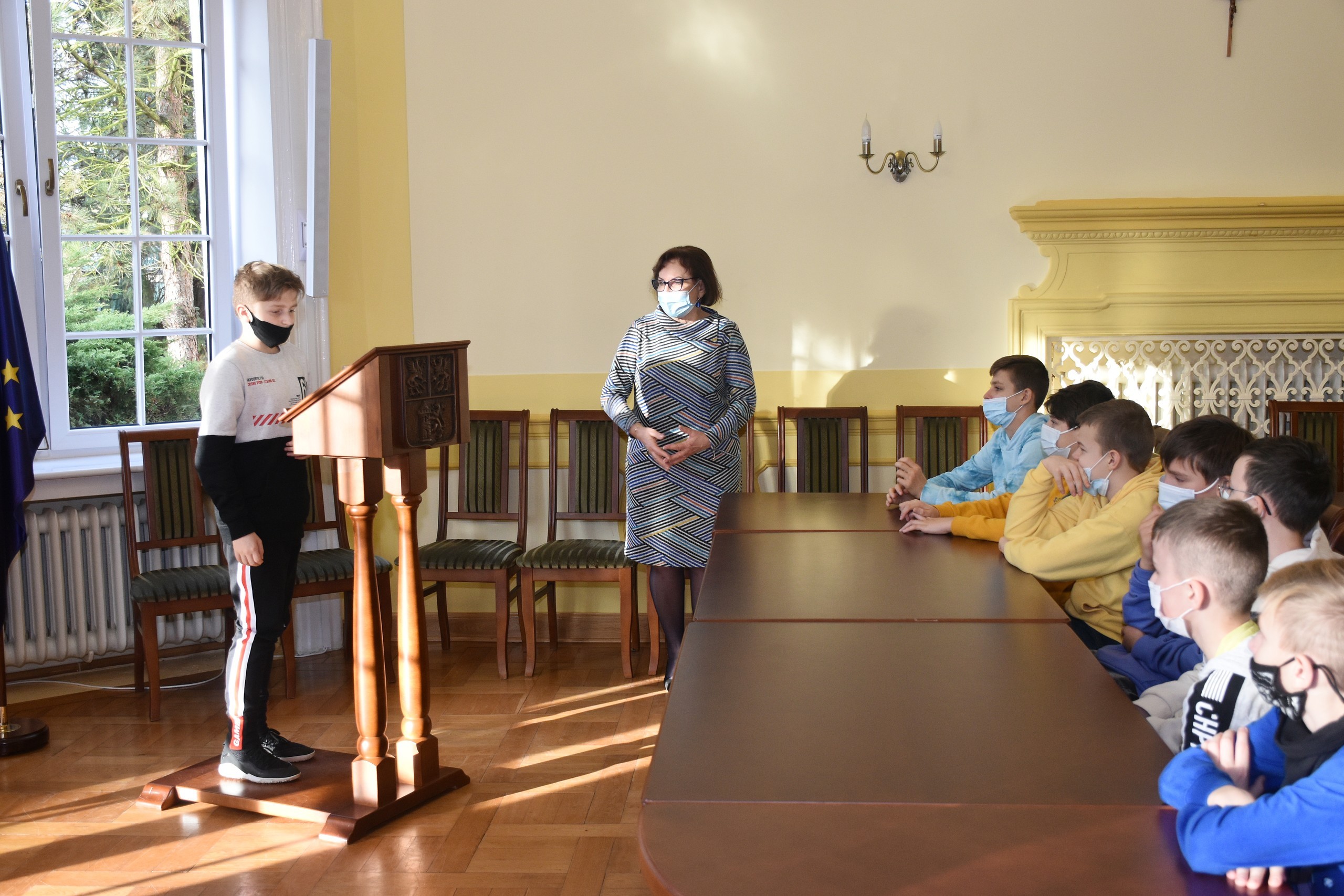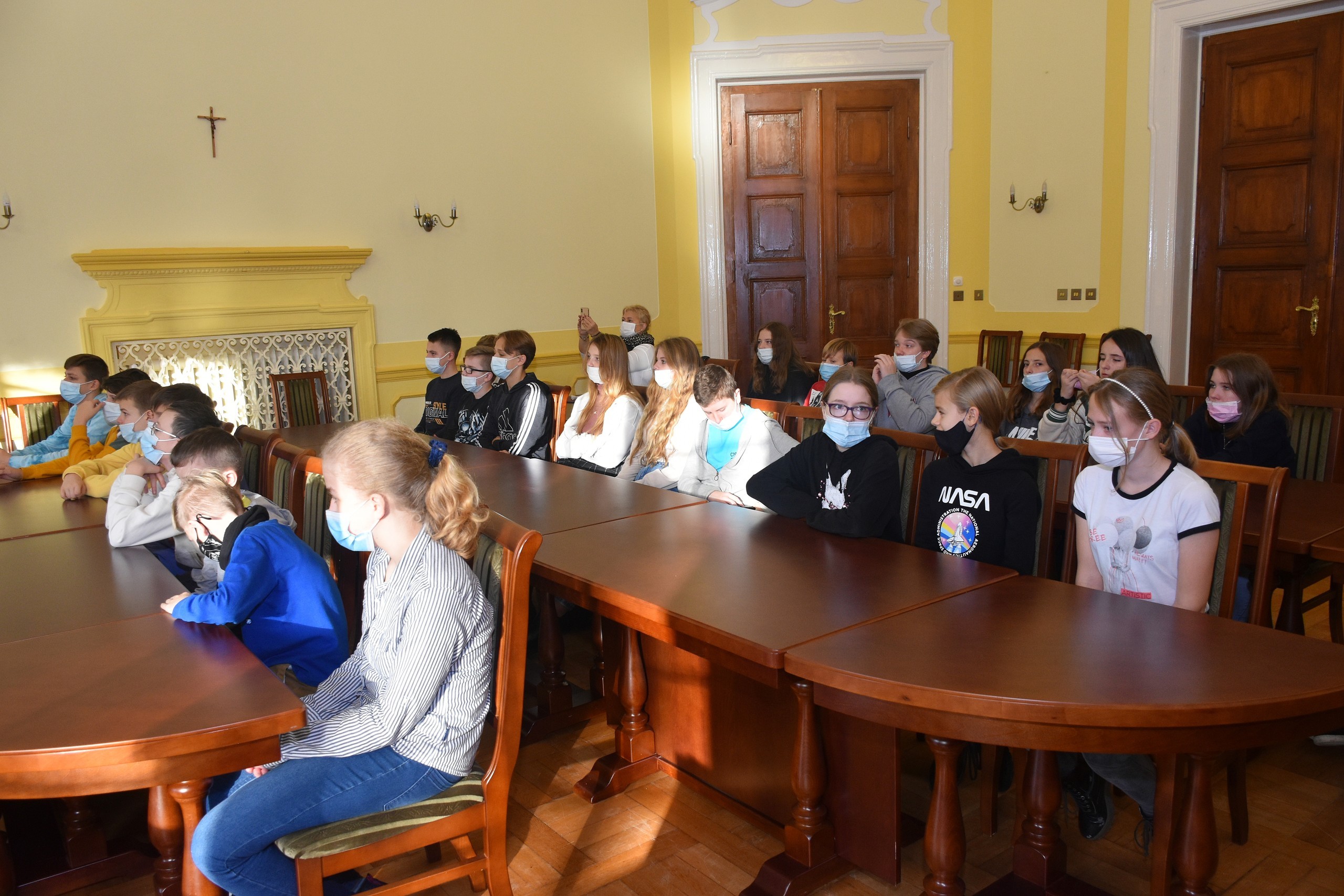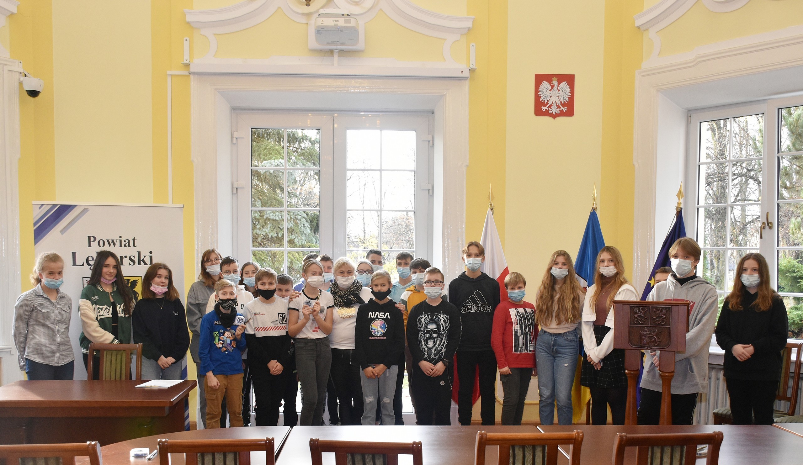 Wizyta w starostwie była również okazją do wycieczki po budynku, którą w grupach poprowadzili Aleksandra Siwka i Krystian Kuczyński, by zaznajomić z lokalizacją poszczególnych wydziałów, w których można m.in. zarejestrować samochód, uzyskać potwierdzenie kwalifikacji do prowadzenia pojazdów, otrzymać pozwolenie na budowę, czy wypis/wyrys geodezyjny. W starostwie można także otrzymać np. kartę wędkarską, albo skorzystać z pomocy rzecznika praw konsumenta. Powiat jest organem prowadzącym dla ponadpodstawowych placówek oświatowych, domów pomocy społecznej, Specjalnego Ośrodka Szkolno-Wychowawczego, Placówki Opiekuńczo-Wychowawczej, dla miejscowego szpitala i Powiatowego Urzędu Pracy. Niewiele osób pamięta, ale w starostwie działa także biuro rzeczy znalezionych. W budynku funkcjonuje ponadto Powiatowe Centrum Pomocy Rodzinie, realizujące zadania z zakresu pomocy społecznej. To tylko część z zadań, jakie wykonuje na rzecz społeczeństwa starostwo. Wśród kompetencji starosty znajdują się również wszystkie te czynności, które związane są z reagowaniem w sytuacjach kryzysowych, np. w związku ze zdarzeniami o charakterze klęsk spowodowanych siłami natury. Na zakończenie każdy z uczestniczących w odwiedzinach w starostwie otrzymał drobny upominek opatrzony logo powiatu.