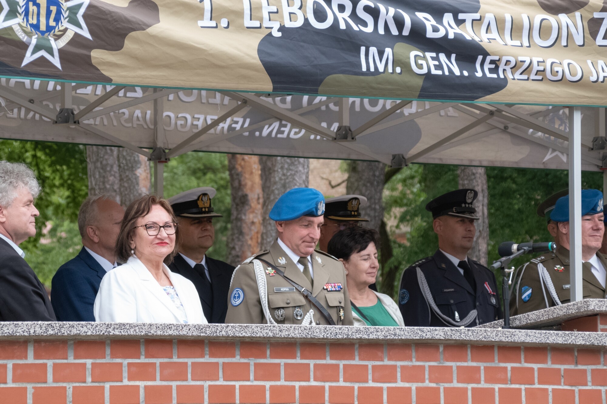 Tuż po podniesieniu biało-czerwonej flagi i rozpoczynającej uroczystość prezentacji gości, ppłk Michał Pietrzak – dowódca 1. LBZ wspomniał tych, którzy przyczynili się do nadania jednostce sztandaru. Wśród najbardziej zaangażowanych wymienił byłego dowódcę lęborskiej jednostki Marcina Adamskiego oraz osoby odpowiedzialne za pielęgnowanie tradycji i prawidłowość wojskowego ceremoniału – mjr. Michała Sobczuka i chor. Tomasz Dettlaffa. W uroczystościach na terenie lęborskiej jednostki uczestniczyła także kmdr w stanie spoczynku Bożena Szubińska – matka chrzestna sztandaru, była przewodnicząca Rady ds. Kobiet w Siłach Zbrojnych RP i była Pełnomocnik Ministra Obrony Narodowej ds. Wojskowej Służby Kobiet. Nie przypadkiem świętowano w miniony wtorek. Niemal dokładnie 20 lat temu – 15 czerwca obyła się bowiem uroczystość przekazania żołnierzom sztandaru.