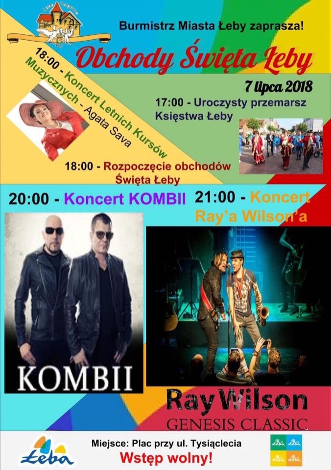 7 lipca br. odbędą się uroczystości związane ze Świętem Łeby. Tego dnia organizatorzy przewidzieli naprawdę bardzo wiele atrakcji dla mieszkańców oraz turystów przebywających na wypoczynku w nadmorskim kurorcie. Tradycyjnie spod Urzędu Miasta o godz. 17.00 wyruszy przemarsz Księstwa Łeby ulicami miasta z księciem Zbyszkiem I na czele oraz całym jego dworem. Barwny korowód będzie kierował się ulicą Kościuszki w stronę festiwalowej sceny, która powstanie na Placu przy ulicy Tysiąclecia. Na scenie zaprezentują się lokalne zespoły i wokaliści w tym m.in.: zespół Silent Scream, Bel Canto a także występ uczestników „Letnich Kursów Muzycznych” pod kierownictwem Agaty Sava. Po tych prezentacjach wystąpią gwiazdy tego wieczoru czyli zespół Kombii oraz ostatni wokalista grupy Genesis Classic – Ray Wilson. Na placu festiwalowym powstanie strefa dla najmłodszych, w której będzie można znaleźć m.in.; dmuchańce oraz sympatycznych animatorów.