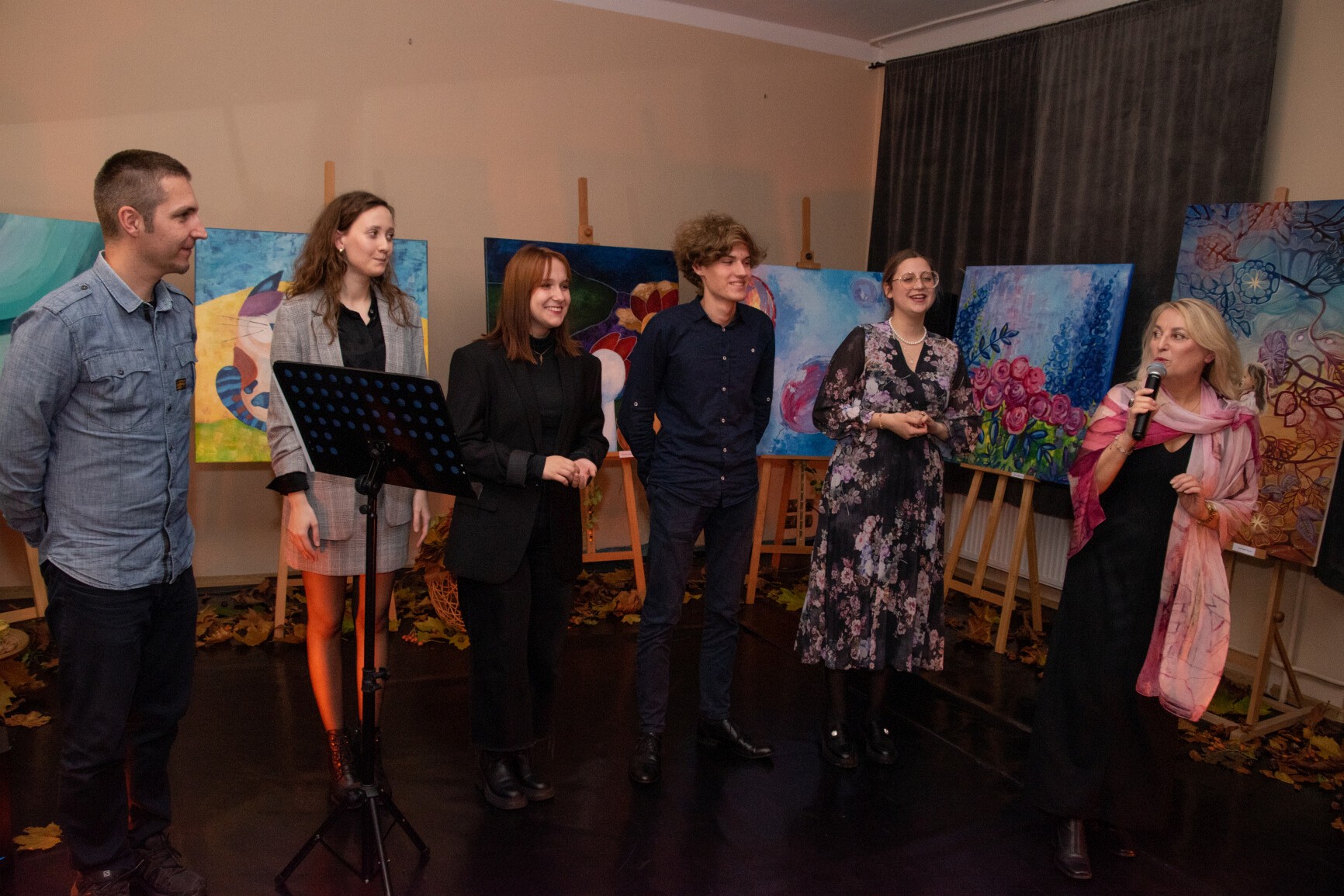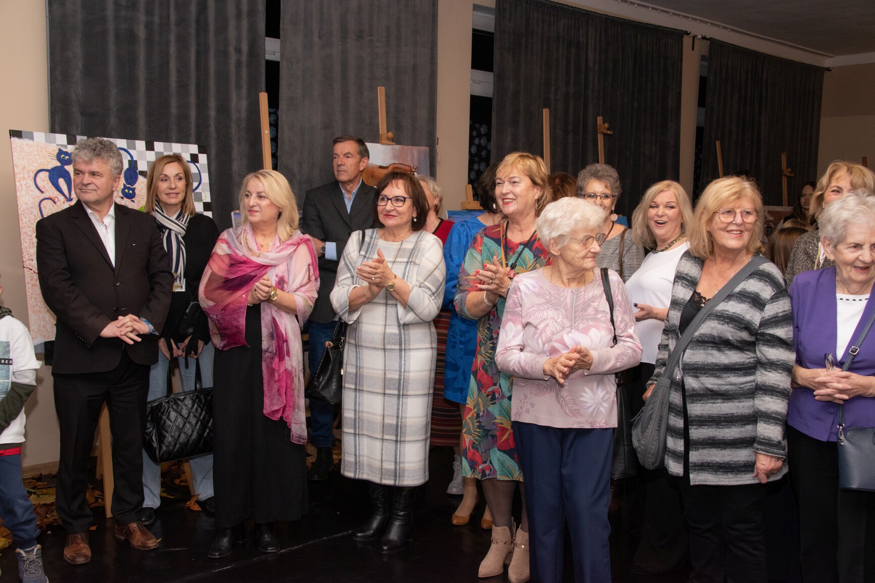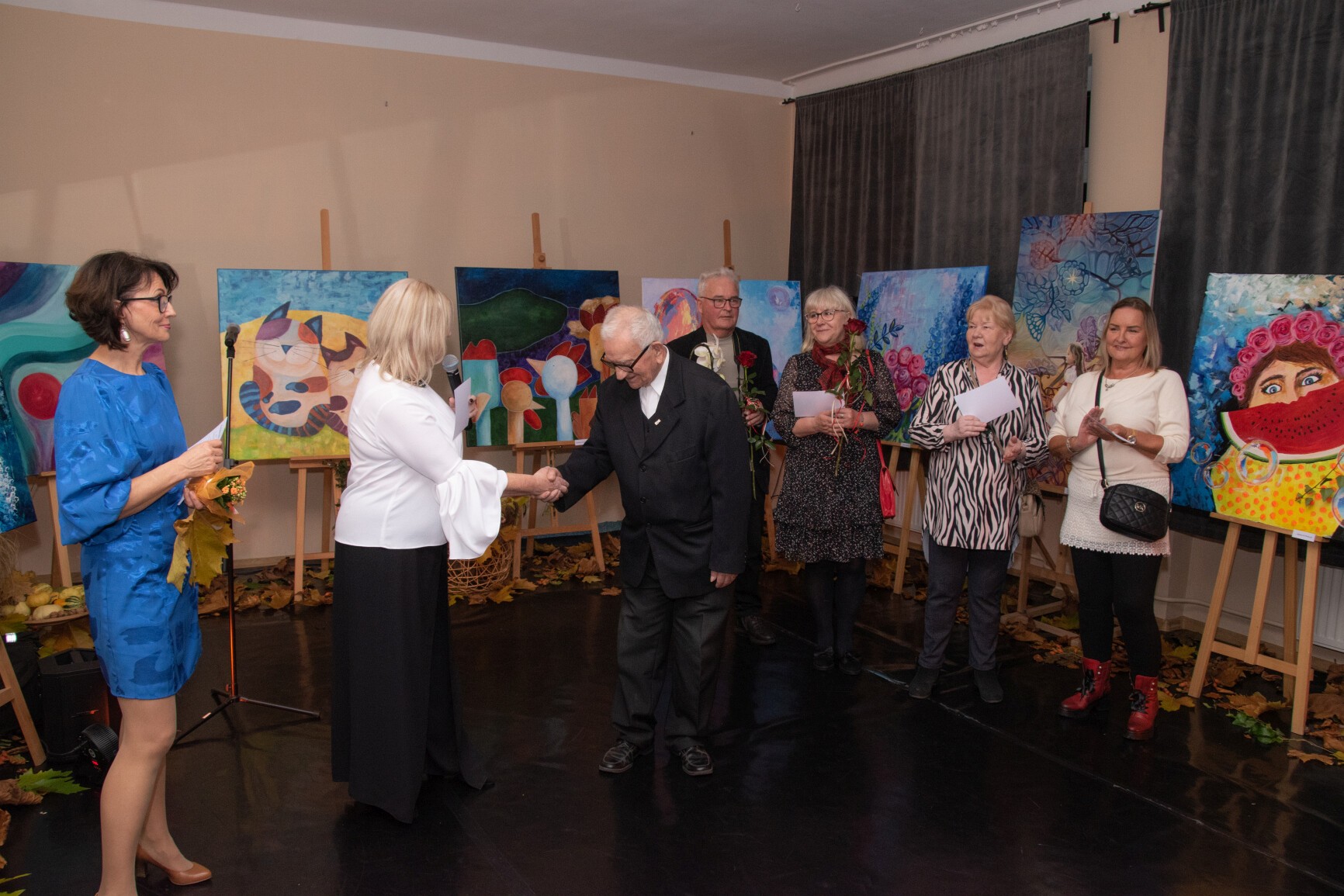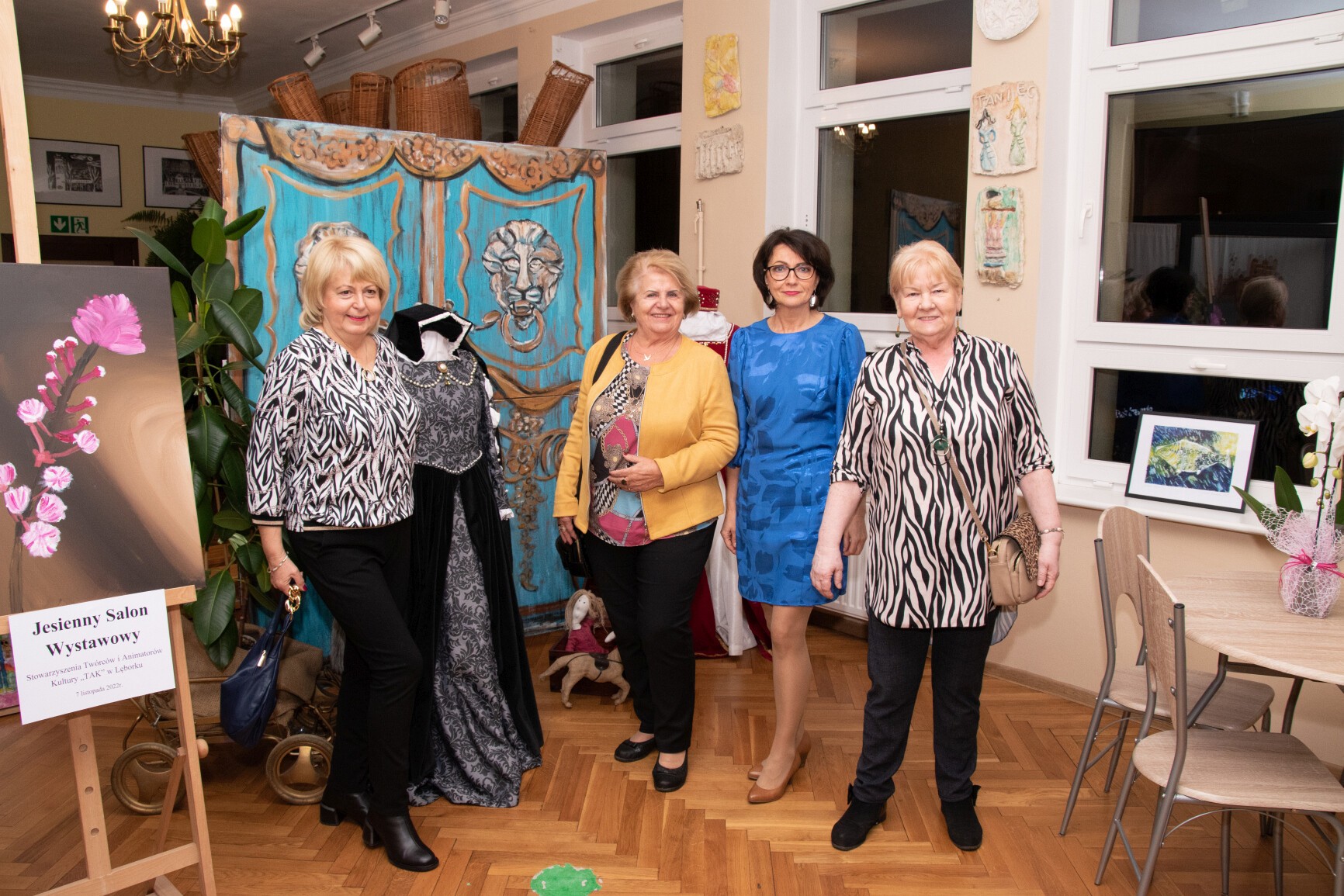 W klimat wernisażu wprowadziła widzów uzdolniona wokalnie młodzież: Natalia Czaja, Roksana Baranowska i Jakub Szczechowicz, doskonalący talenty pod kierunkiem Oliwii Stromskiej i Sylwestra Kustusza. Niezawodnie jak zwykle – podczas wernisażu pojawiła się większa część twórców, których podobnie jak gości wernisażu przywitały: Halina Krzewniak – prezes stowarzyszenia, wiceprezes Alina Walkusz i Teresa Szczepańska – dyrektor Młodzieżowego Domu Kultury. Jesienny klimat wernisażu podkreślał wystrój sali z wykorzystaniem żółtych liści i klimatycznego barwnego oświetlenia. Wernisaże Stowarzyszenia TAK, w którym artystyczne talenty mieszkańców powiatu zyskują wizualną materialną formę, tradycyjnie przyciągają wielu widzów. Podobnie było tym razem. Artystów odwiedzili również przedstawiciele Powiatu Lęborskiego: starosta Alicja Zajączkowska i wicestarosta Edmund Głombiewski. Doceniając artystyczny dorobek członków stowarzyszenia, na ręce prezes H. Krzewniak przekazali symboliczne kwiatowe podziękowanie. Talenty twórców docenił również obecny na wernisażu burmistrz Witold Namyślak.