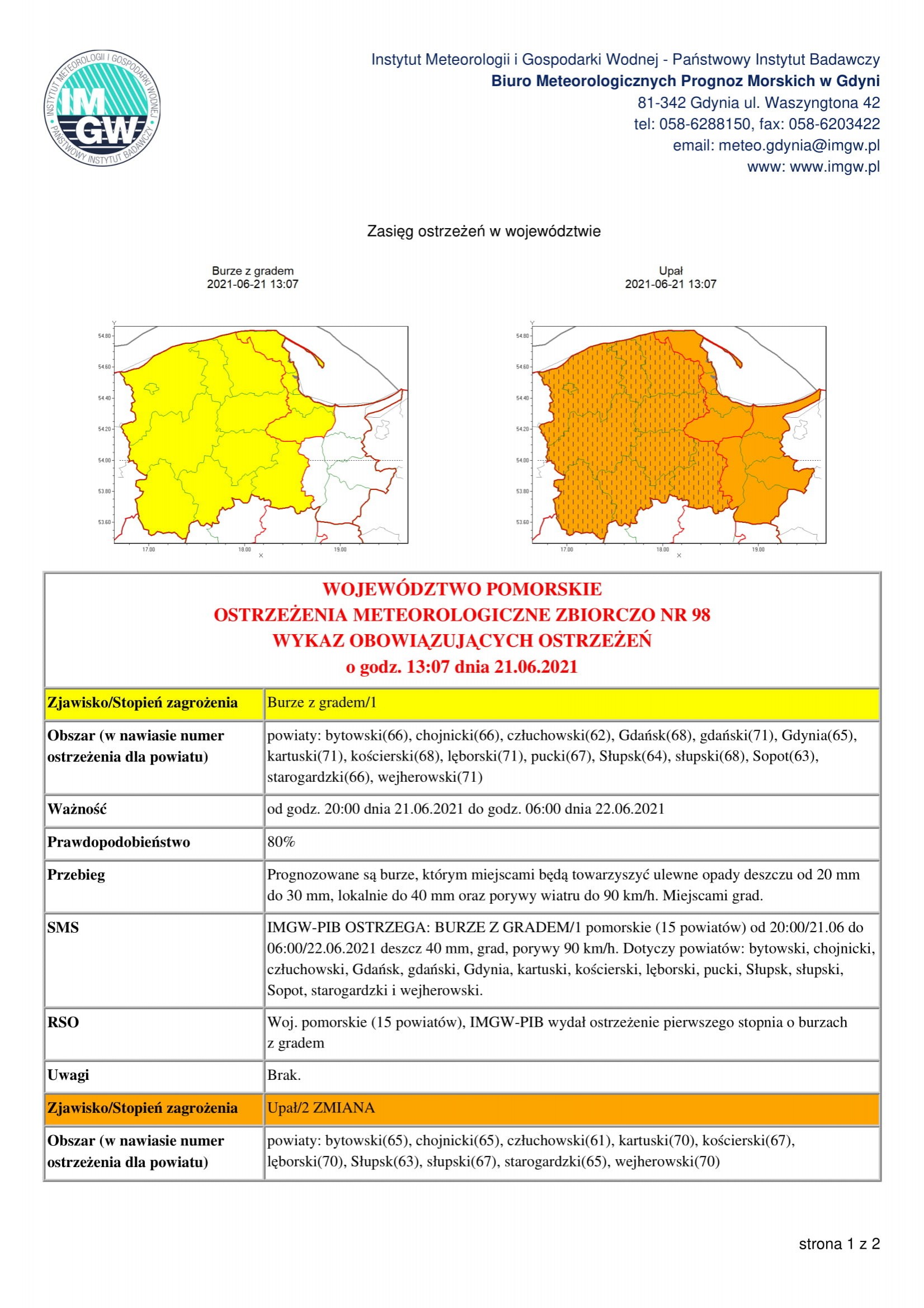 Biuro Meteorologicznych Prognoz Morskich w Gdyni ostrzega przed upałami i prawdopodobieństwem wystąpienia burz. Szczegóły ostrzeżeń zamieszczamy w plikach graficznych.