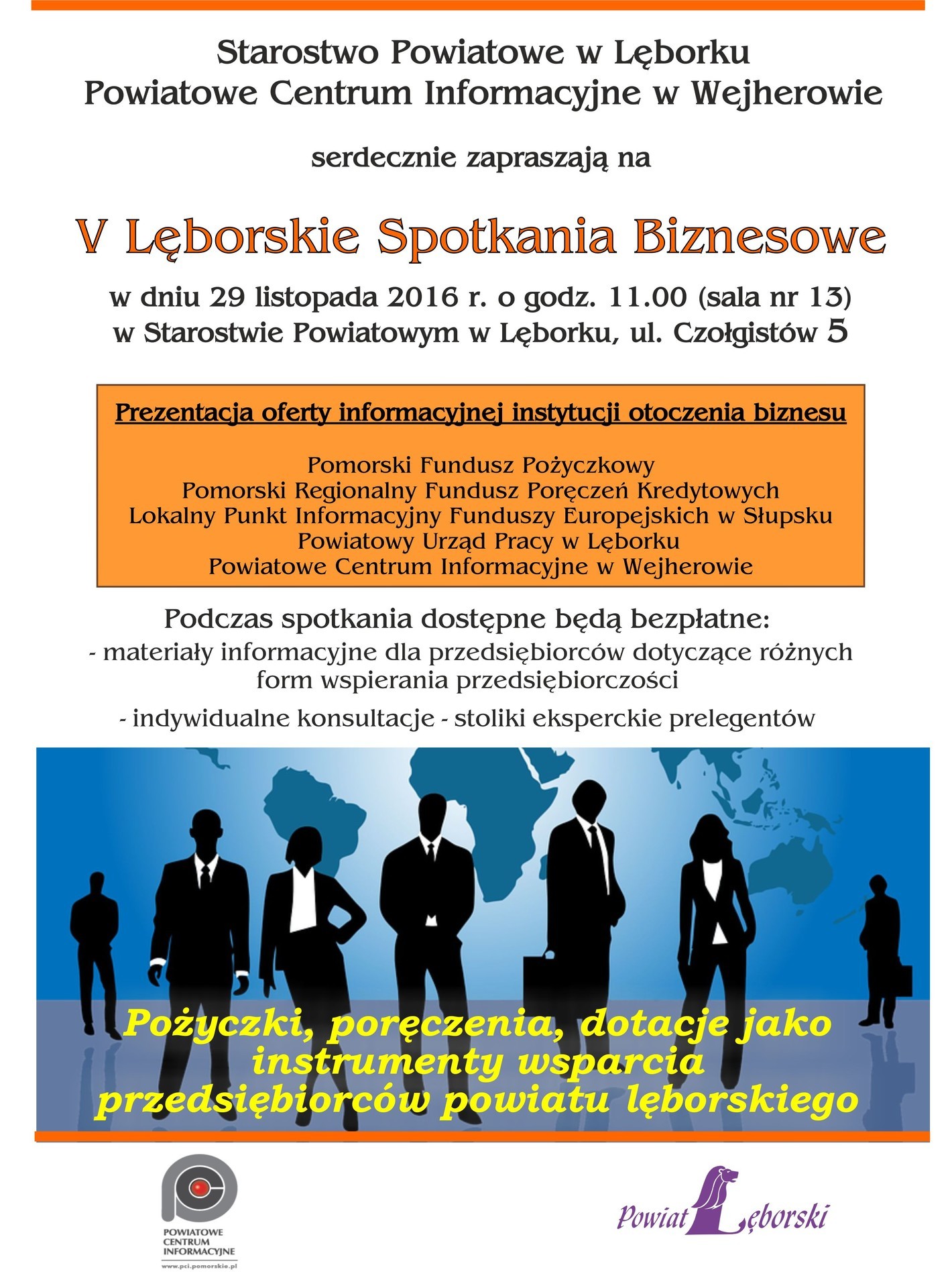 Starostwo Powiatowe w Lęborku oraz Powiatowe Centrum Informacyjne w Wejherowie serdecznie zapraszają w dniu 29 listopada 2016 r. o godz. 11:00 na V Lęborskie Spotkania Biznesowe (miejsce: Starostwo Powiatowe, sala nr 13).