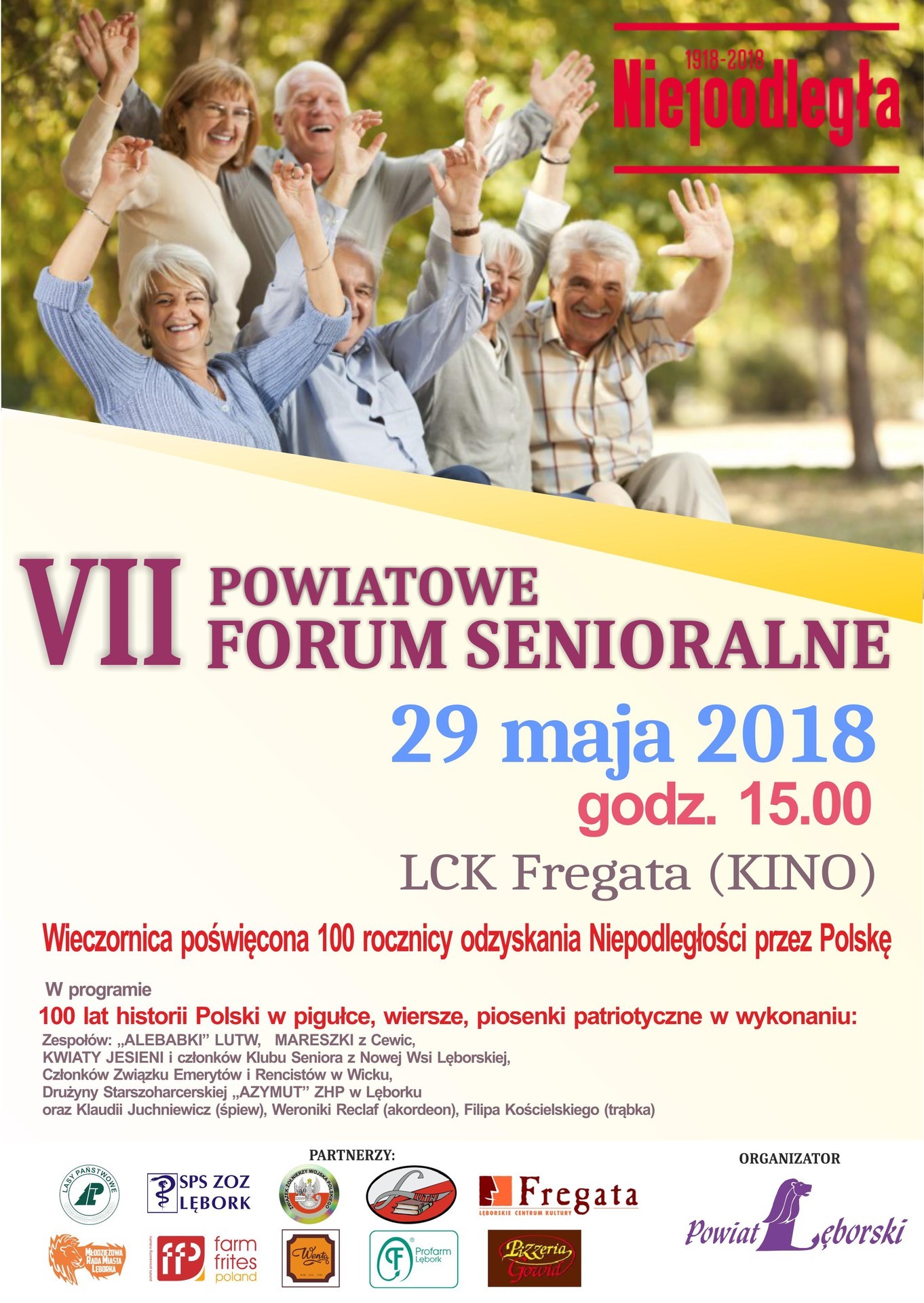 Cykliczna organizacja for senioralnych to element działań służących stworzeniu obszaru powiatu miejscem przyjaznym seniorom, mającym na szczególnym względzie realizację potrzeb starszej części mieszkańców. O tym, że to kierunek słuszny, świadczy to, że w organizację podobnych przedsięwzięć włącza się coraz więcej instytucji i firm. Organizatorem VII Powiatowego Forum Senioralnego jest – jak zawsze – Powiat Lęborski, w tej edycji przy partnerskim wsparciu Lasów Państwowych, SPS ZOZ w Lęborku, Związku Żołnierzy Wojska Polskiego, Lęborskiego Uniwersytetu Trzeciego Wieku, LCK „Fregata”, Młodzieżowej Rady Miasta, a także Farm Frites Poland SA, Cukierni Wenta, Pizzerii „Gowid” oraz firmy farmaceutycznej „Profarm”.