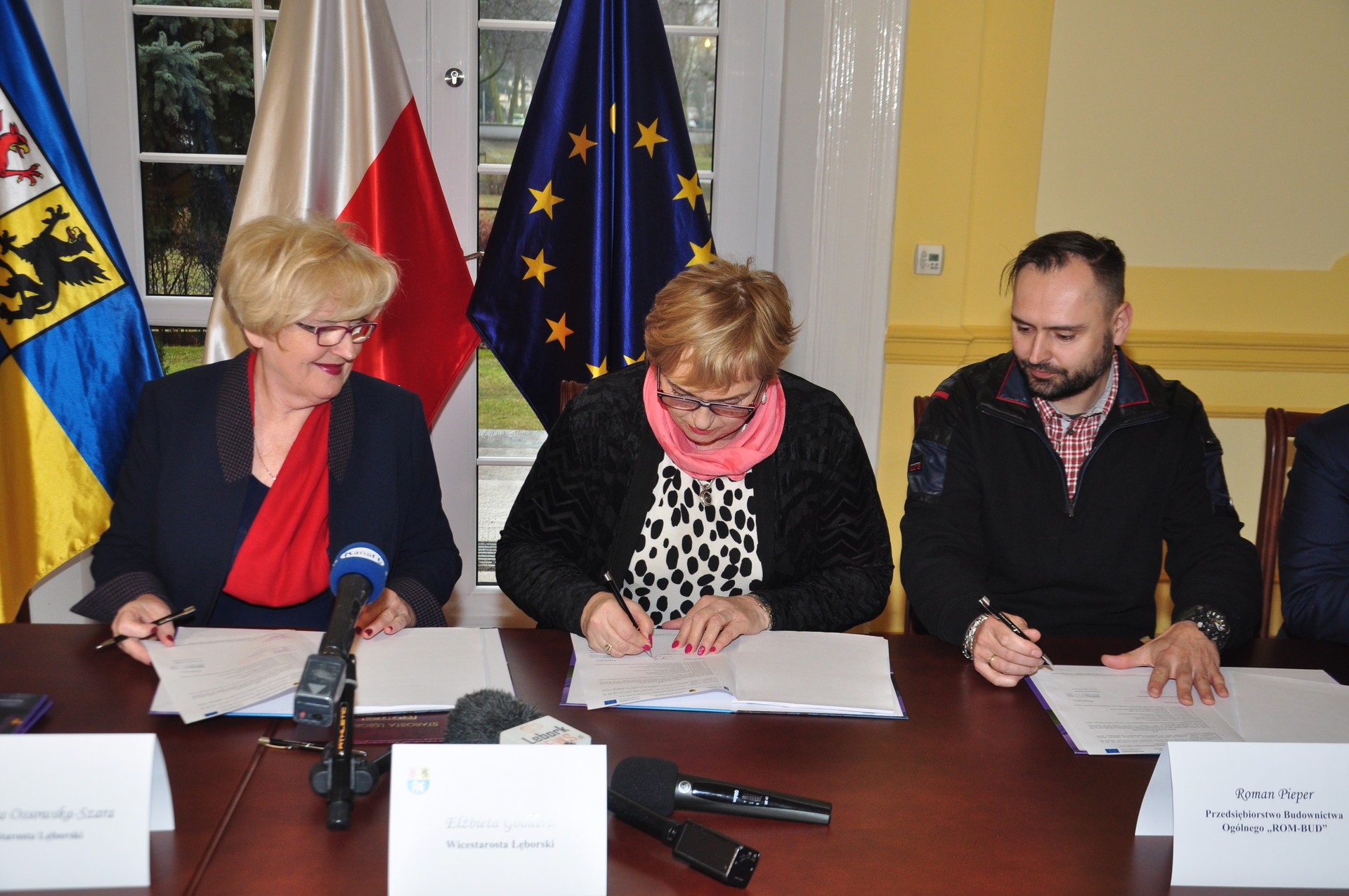 Wykonawcy inwestycji wyłonieni zostali w ramach przetargu nieograniczonego na zadanie pn. „Termomodernizacja obiektów użyteczności publicznej na obszarze MOF Lębork”. W dniu dzisiejszym podpisano stosowne umowy. Z ramienia Powiatu Lęborskiego, umowy podpisywały: Teresa Ossowska-Szara, Starosta Lęborski i Elżbieta Godderis, Wicestarosta Lęborski przy kontrasygnacie Grażyny Janik, Skarbnika Powiatu Lęborskiego. Z ramienia Przedsiębiorstwa Produkcyjno-Usługowo-Handlowego „HRYN-BUD”, Adam Hrycyk i z ramienia Przedsiębiorstwa Budownictwa Ogólnego „ROM-BUD”, Roman Pieper.