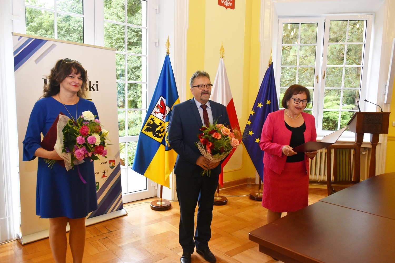 Spotkanie w starostwie stało się również okazją do złożenia gratulacji dwójce dyrektorów, obchodzących w tym roku jubileusz pracy zawodowej. Życzenia i wiązanki kwiatów starostowie przekazali Katarzynie Wach - dyrektorowi Zespołu Szkół Ogólnokształcących nr 1 w Lęborku i Arturowi Obolewskiemu - dyrektorowi Powiatowego Centrum Edukacyjnego im. Eugeniusza Kwiatkowskiego w Lęborku, którzy 1 września obchodzić będą 30 lecie pracy zawodowej.