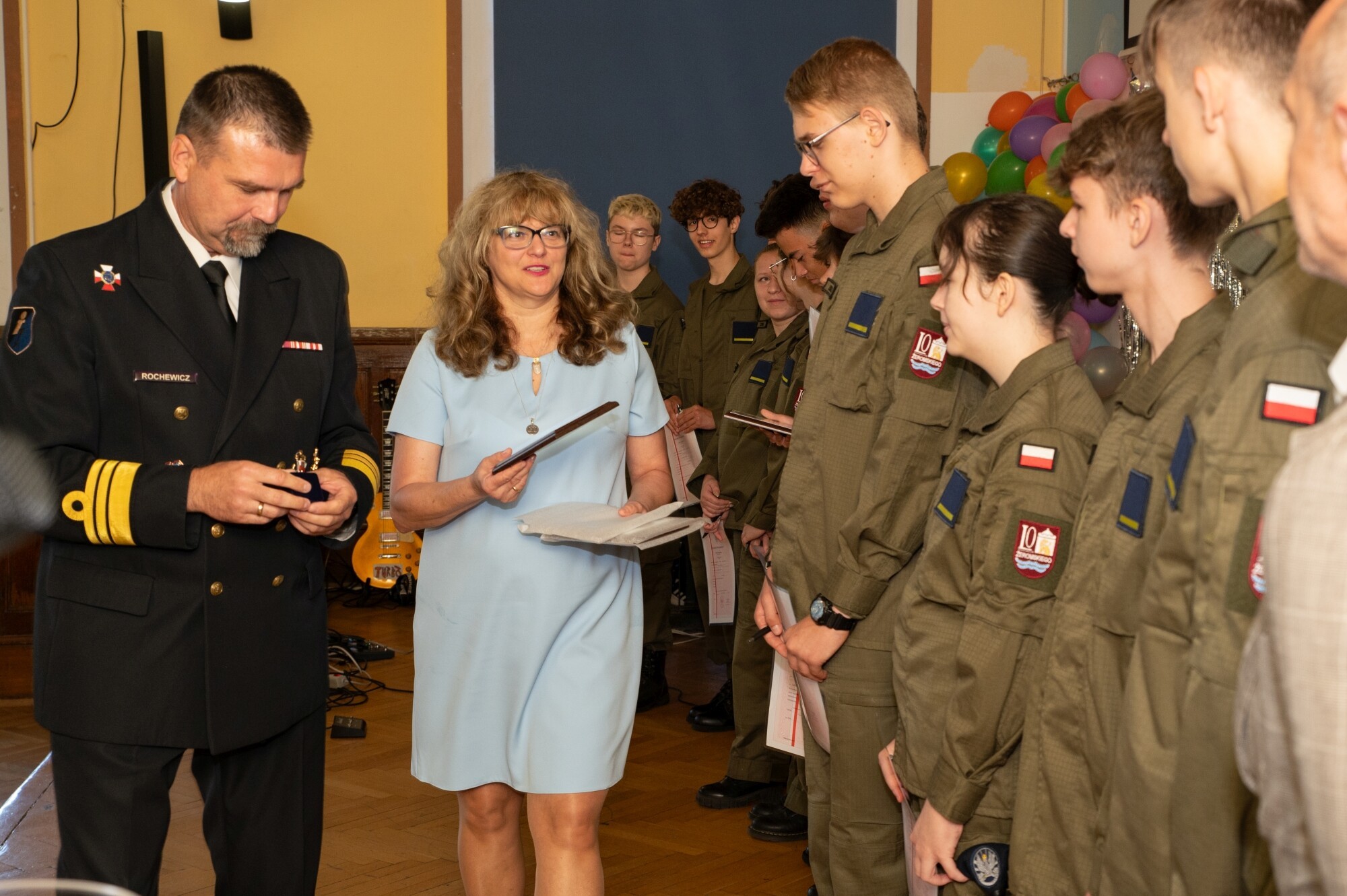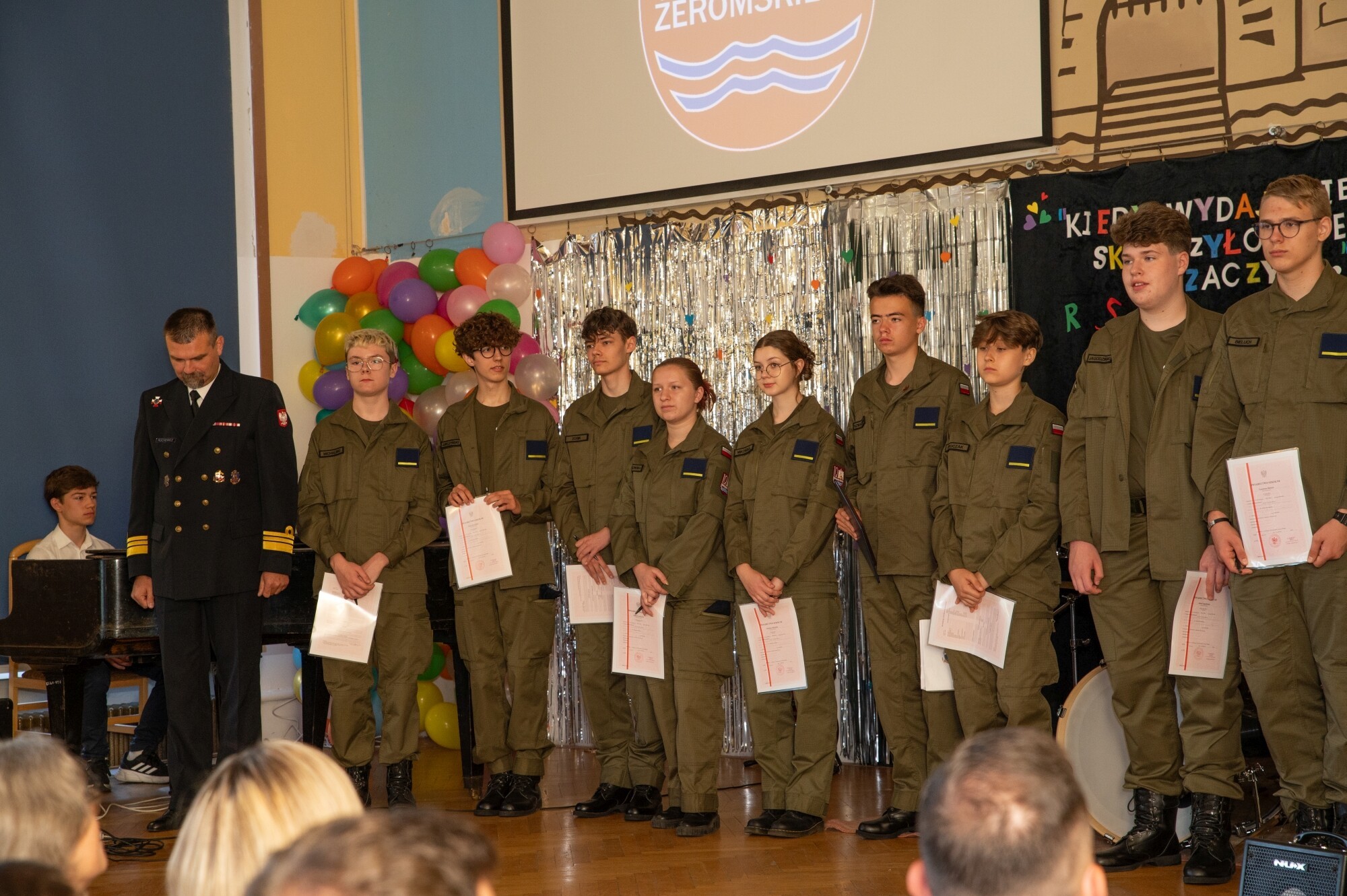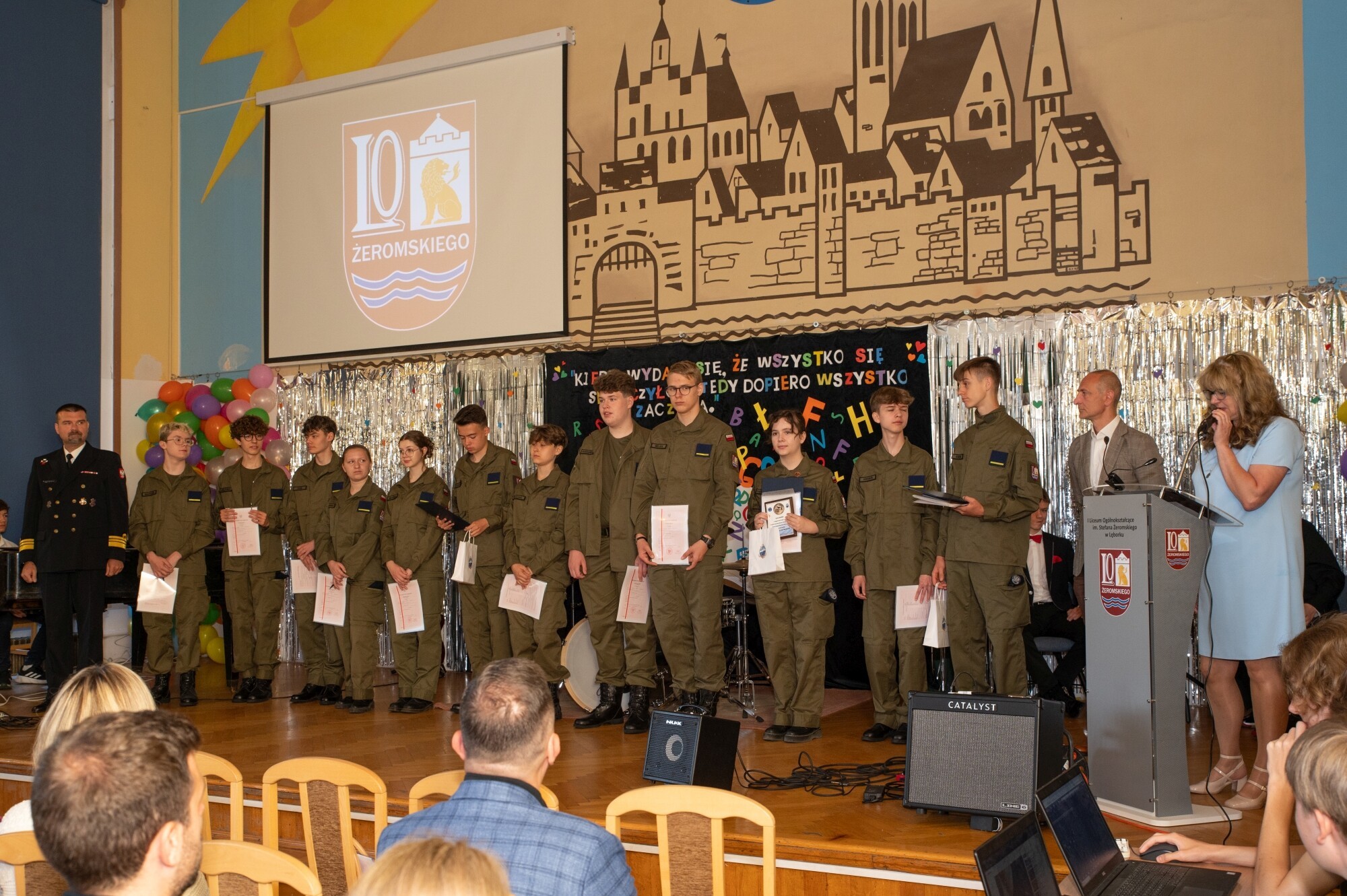 Grad wyróżnień spadł na uczniów wybitnych w Liceum Ogólnokształcącym nr 1. To w tej szkole aż 144 osoby otrzymały świadectwa z biało-czerwonymi paskami. 42 razy tylko w ciągu tego roku szkolnego uczniowie uczestniczyli w konkursach i olimpiadach, zdobywając znaczące miejsca. Kmdr por. Krzysztof Rochewicz z Regionalnego Centrum Informatyki w Gdyni wyróżnił najlepszych uczniów z klas CYBER.MIL.