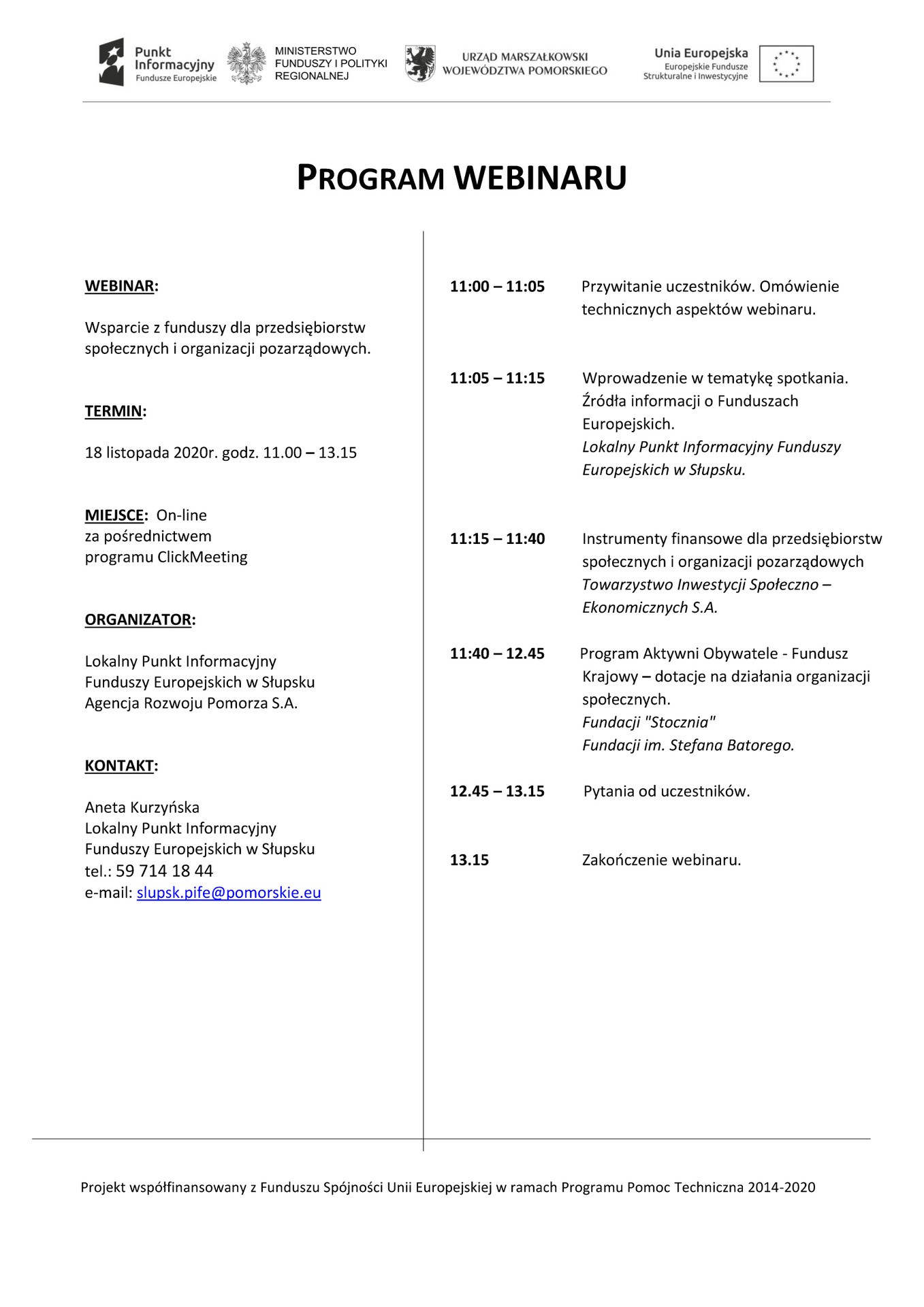Warunkiem uczestnictwa w webinarze jest przesłanie do dnia 17 listopada 2020 r. wypełnionego formularza zgłoszeniowego na adres: slupsk.pife@pomorskie.eu lub zgłoszenie telefoniczne pod numerem: 59 714 18 44