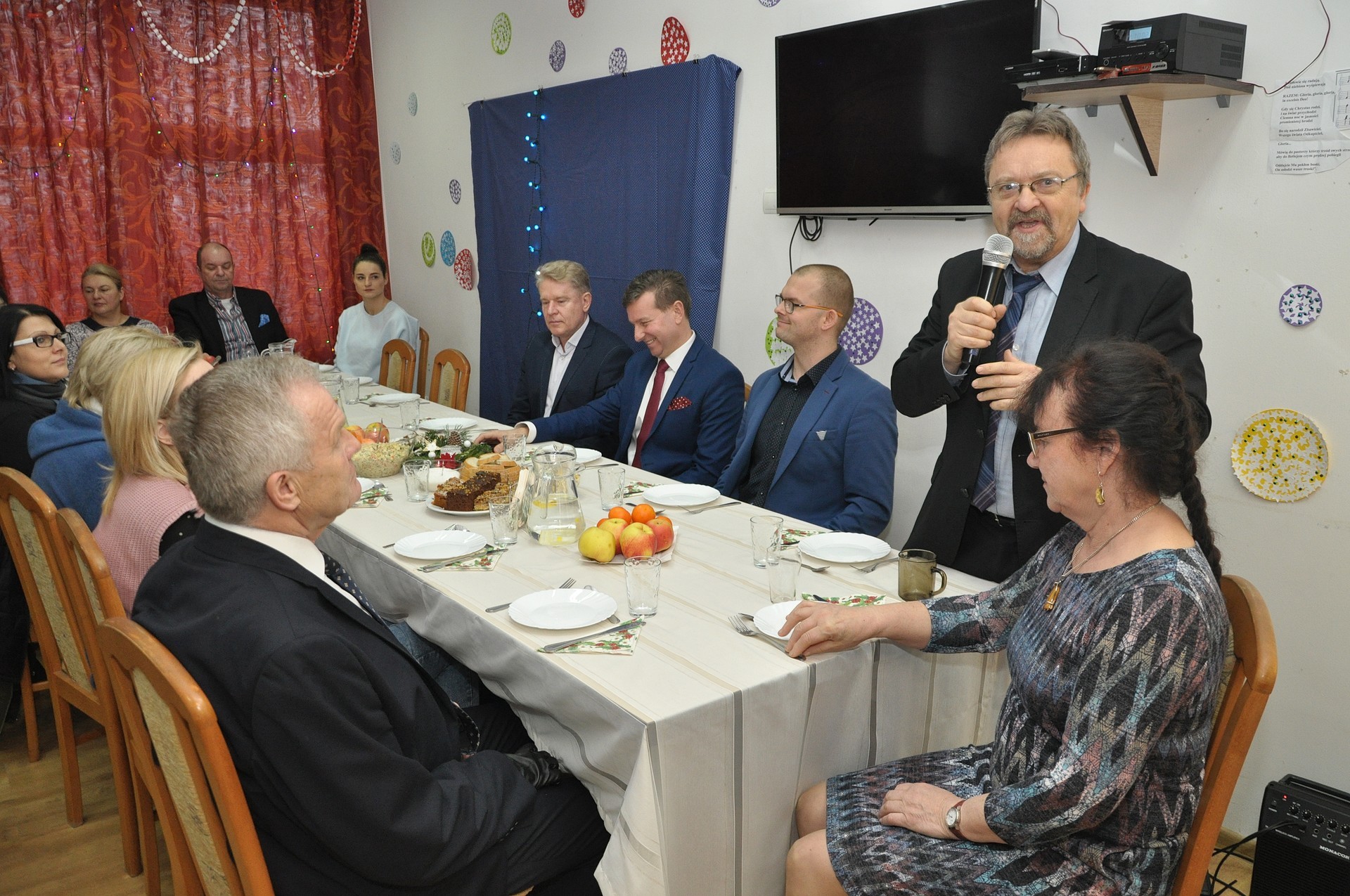 Tradycyjny barszczyk z uszkami, pierogi z kapustą i grzybami, różnego rodzaju sałatki to tylko część poczęstunku wigilijnego na stole uczestników Warsztatu Terapii Zajęciowej Stowarzyszenia „Jesteśmy Razem”. We wspólnym kolędowaniu uczestniczył Edmund Głombiewski, Wicestarosta Lęborski.