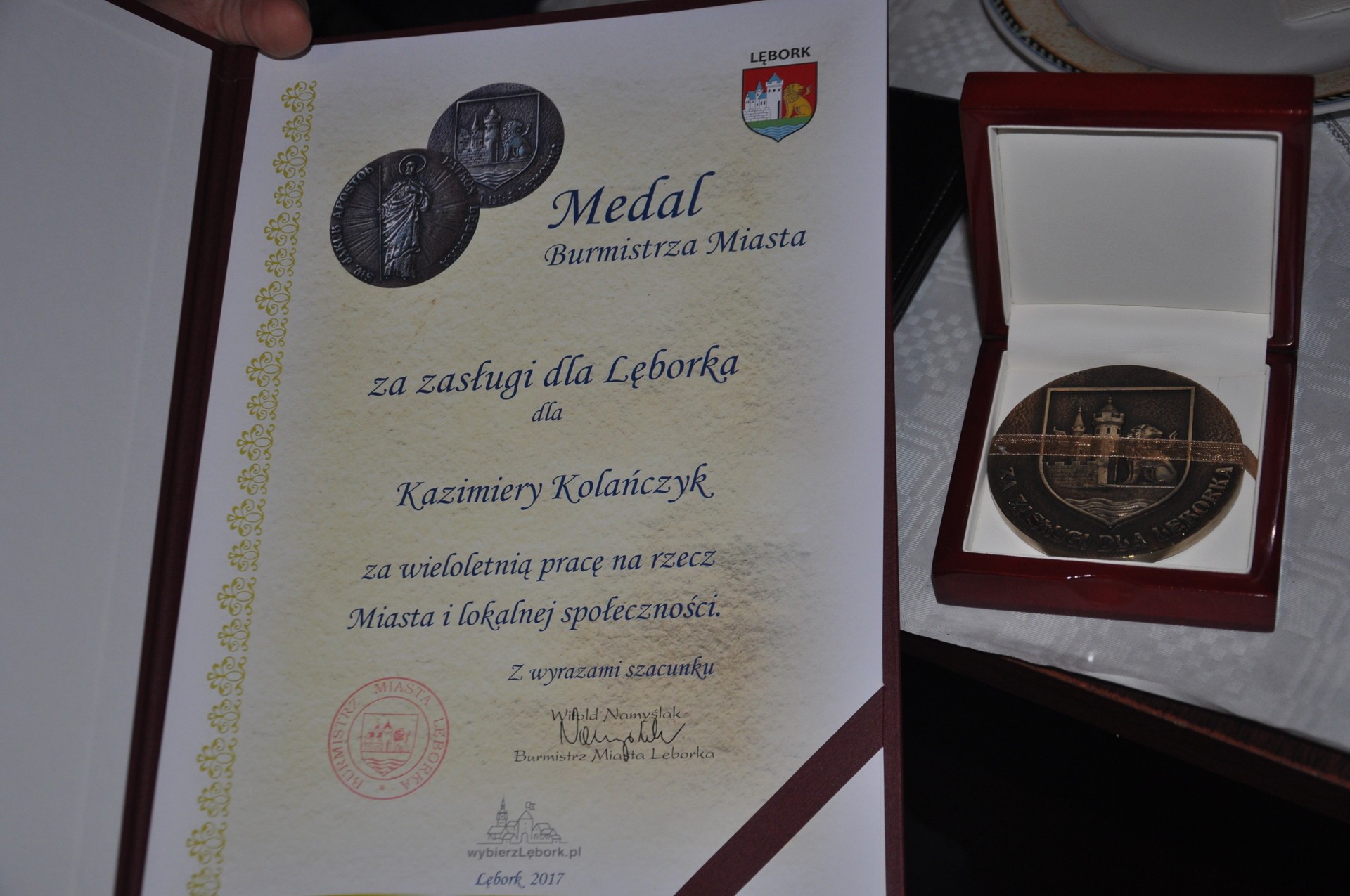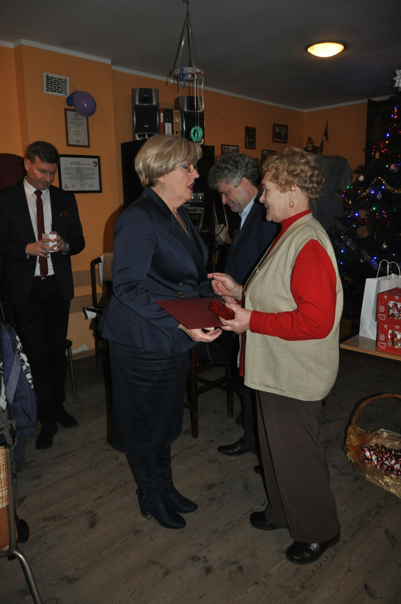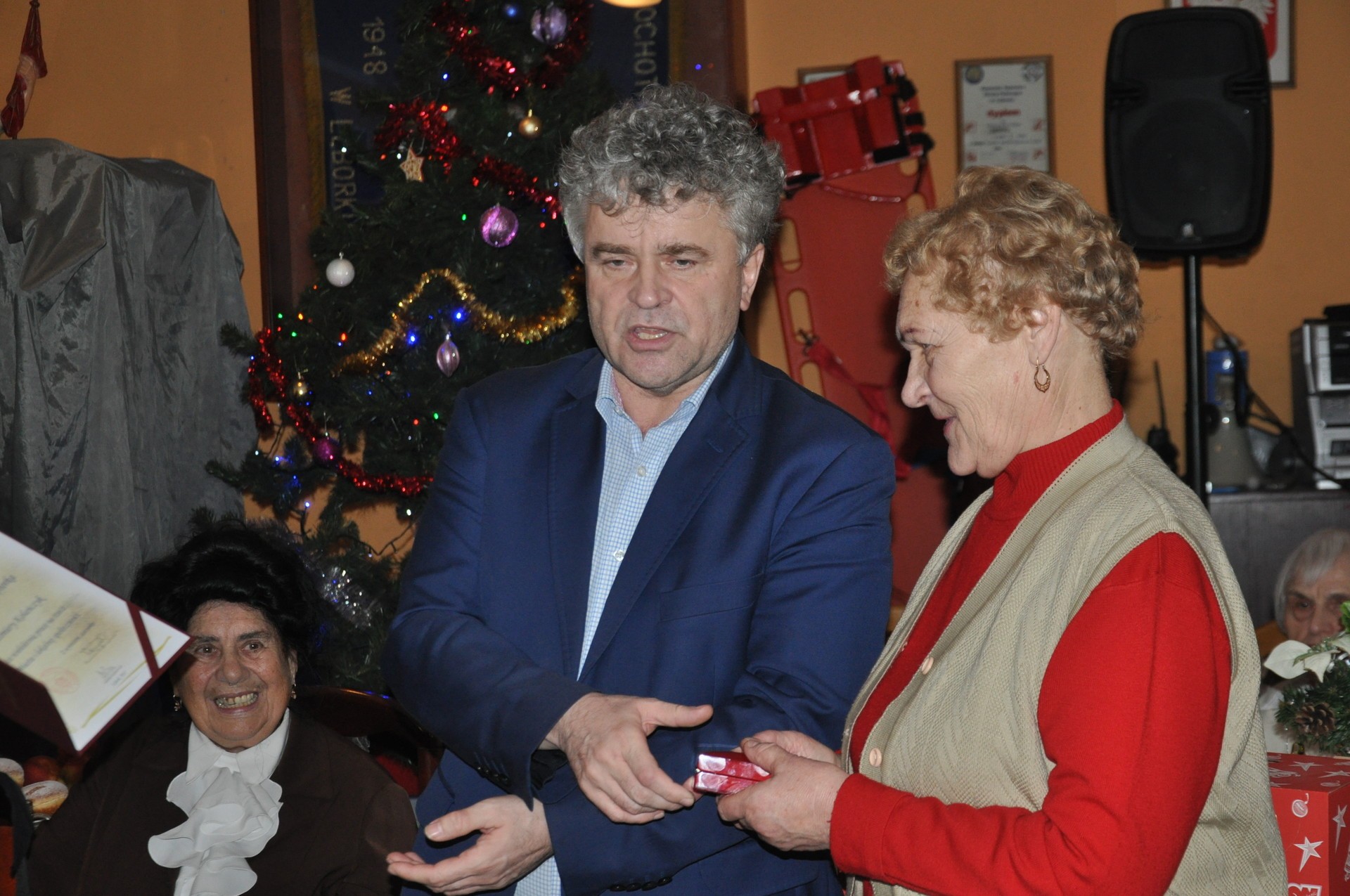 W wypełnionej po brzegi sali remizy Ochotniczej Straży Pożarnej w Lęborku zebrało się grubo ponad sto osób. Wielu z uczestników tegorocznego kolędowania jest tu po raz kolejny i to nie tylko przy okazji świąt Bożego Narodzenia. Anna Sobolewska, działaczka na rzecz lokalnego środowiska, organizuje podobne spotkania tak często, jak to tylko możliwe i zawsze odnieść można wrażenie, że gdyby strażacka remiza była kilkukrotnie większa, również trudno byłoby zauważyć jakieś wolne miejsca. To za sprawą atmosfery towarzyszącej spotkaniom jak i osobowości samej organizatorki, o które wielu mówi, że to niemal „człowiek – instytucja”. Aktywność społeczna od zawsze była domeną pani Ani. Teraz idealnie spaja środowiska emeryckie. Spotkania w remizie to nie tylko okolicznościowe biesiady przy stołach. To także okazja do porozmawiania o życiowej codzienności i tym, co zajmuje mieszkańców Lęborka. Regułą stało się już, że w spotkaniach organizowanych przez Annę Sobolewską uczestniczą chętnie przedstawiciele powiatu i miasta. To okazja do porozmawiania z mieszkańcami w luźnej, nieformalnej atmosferze, poza murami urzędów. To również okazja do wyjaśnienia wątpliwości i pytań, jakie mogą mieszkańców nurtować. Medal Burmistrza Miasta Lęborka wraz z listem gratulacyjnym otrzymała Kazimiera Kolańczyk. – To dowód uznania za wieloletnią pracę na rzecz miasta i lokalnej społeczności – uzasadniał burmistrz Witold Namyślak, wręczając medal wyróżnionej.